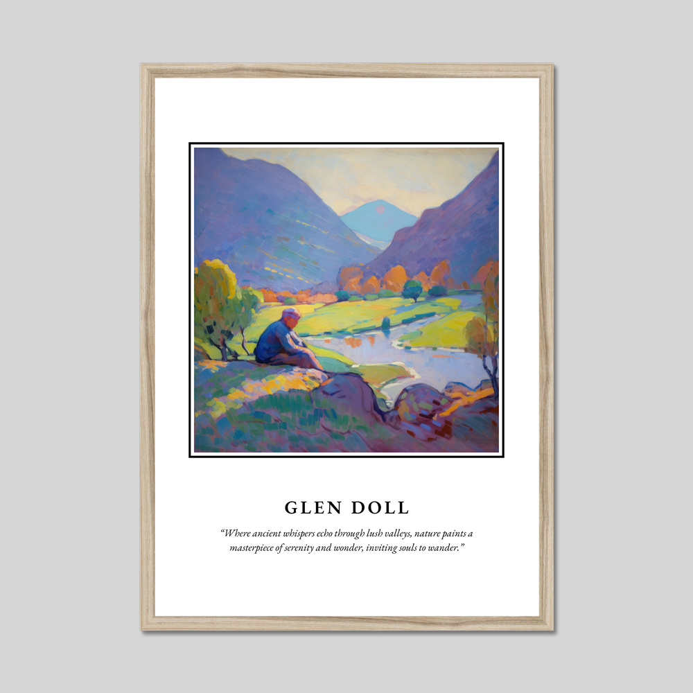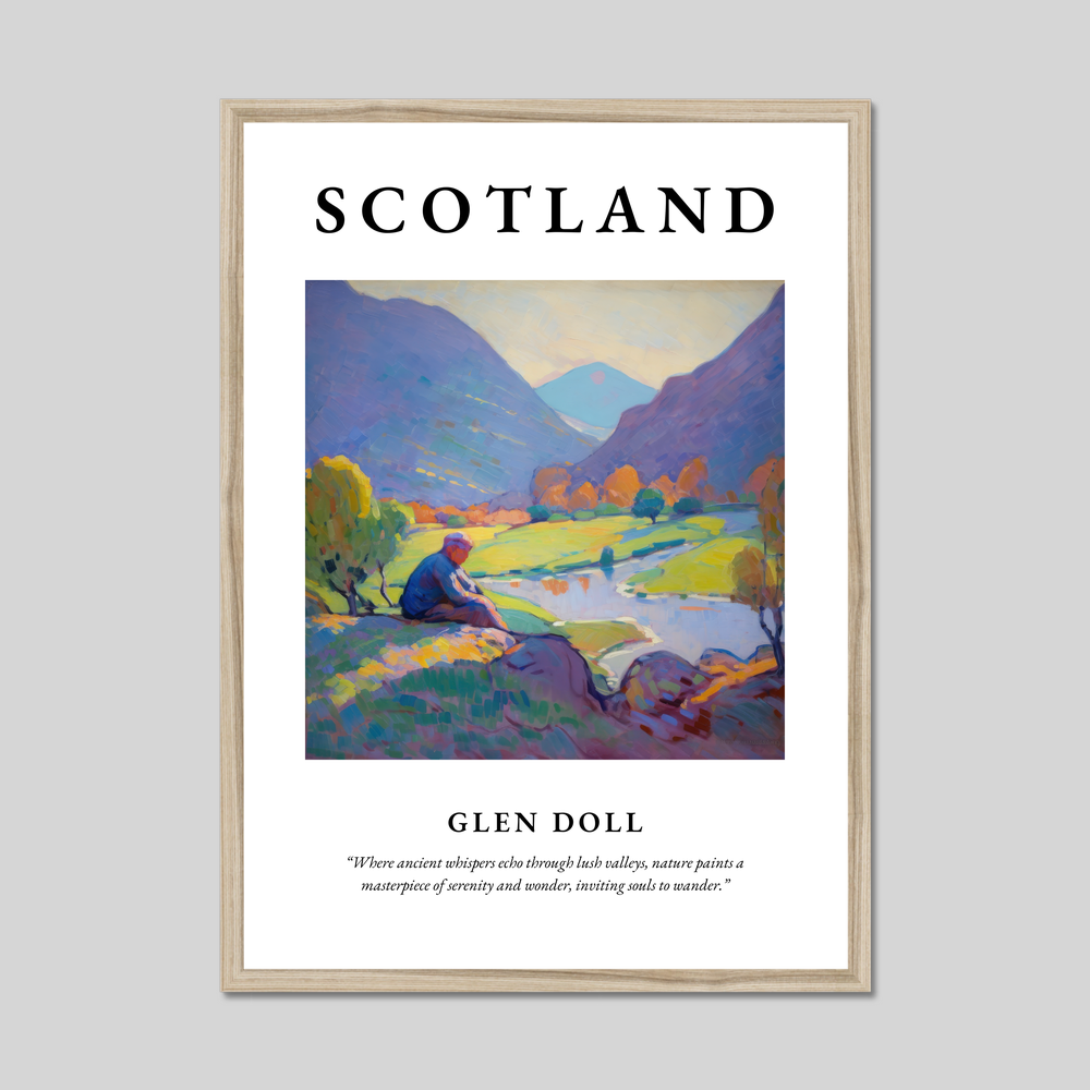 Embrace the majestic allure of the Scottish Highlands with our exquisite framed poster print, designed to transport you straight to the heart of Scotland's natural beauty. This impressive 50cm x 70cm artwork features the word "SCOTLAND" emblazoned at the top, with a serene painting of Glen Doll taking centre stage. Beneath the painting, the poetic quote, “Where ancient whispers echo through lush valleys, nature paints a masterpiece of serenity and wonder, inviting souls to wander,” invites you to immerse yourself in the tranquil charm of this magnificent landscape. Available in black, white, or a natural wood-effect frame, this poster ensures versatility that complements any décor.