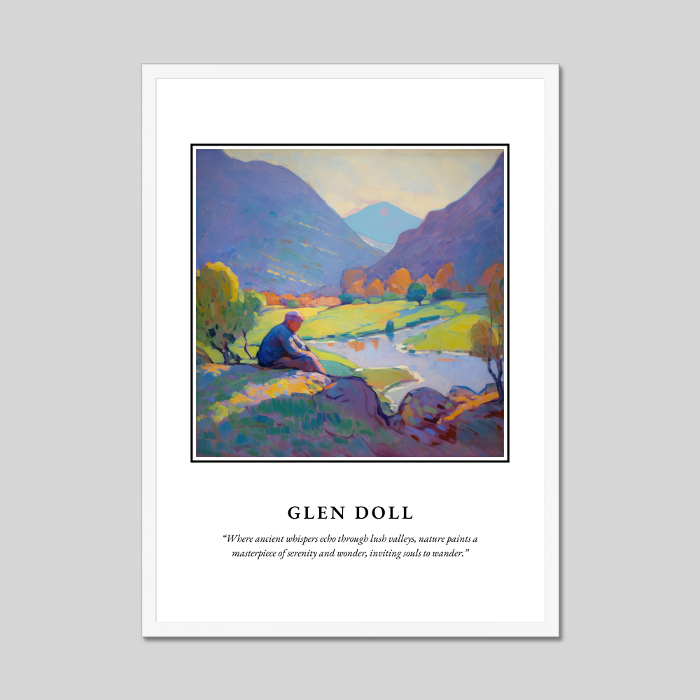 The painting itself, crafted in the enchanting Impressionism style, captures the sublime beauty of Glen Doll with vibrant hues and soft brush strokes. Sunlight dances through the valley, highlighting emerald hills and a gentle river winding through the scene, infusing any room with a sense of peace and wonder. This poster is part of our "Scottish Glens" collection, making it an ideal choice for those who cherish a personal connection to Scotland or have experienced its untouched landscapes. Its generous size commands attention, offering a significant visual impact that transforms a space without breaking the bank.