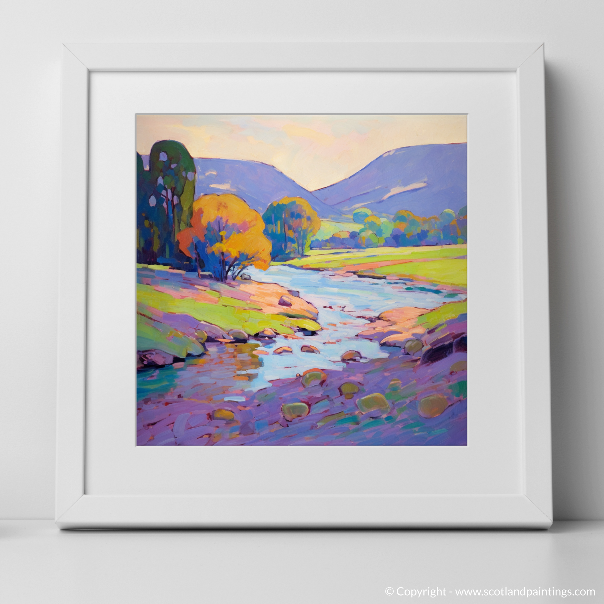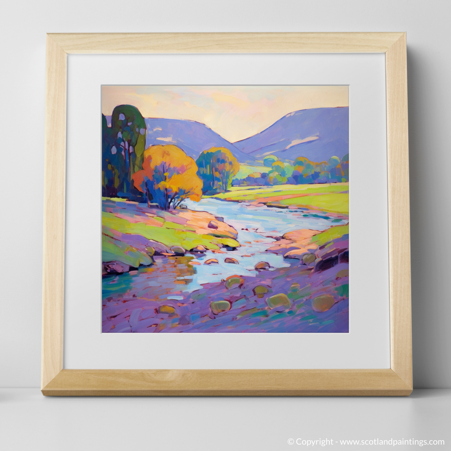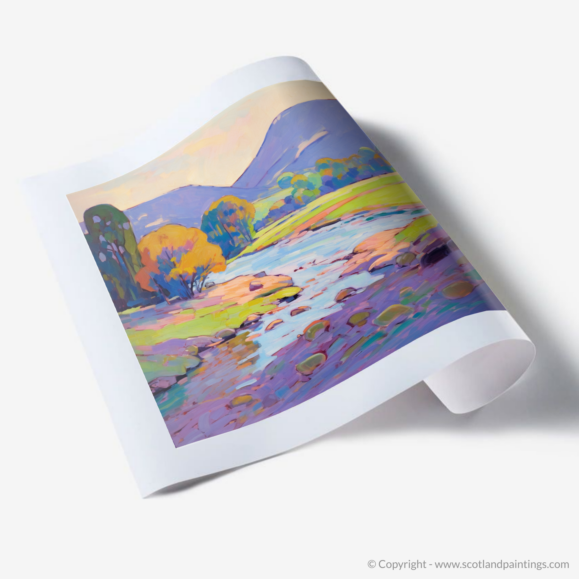 Let the gentle warmth of a Scottish summer's day wash over you with every glance at this enchanting print inspired by the River Esk in Angus. Bold brushstrokes and a vibrant palette capture the play of light and shadow upon the tranquil waters, where flickers of pink and purple hues dance upon the surface, reflecting the mirth of a cloud-kissed sky.