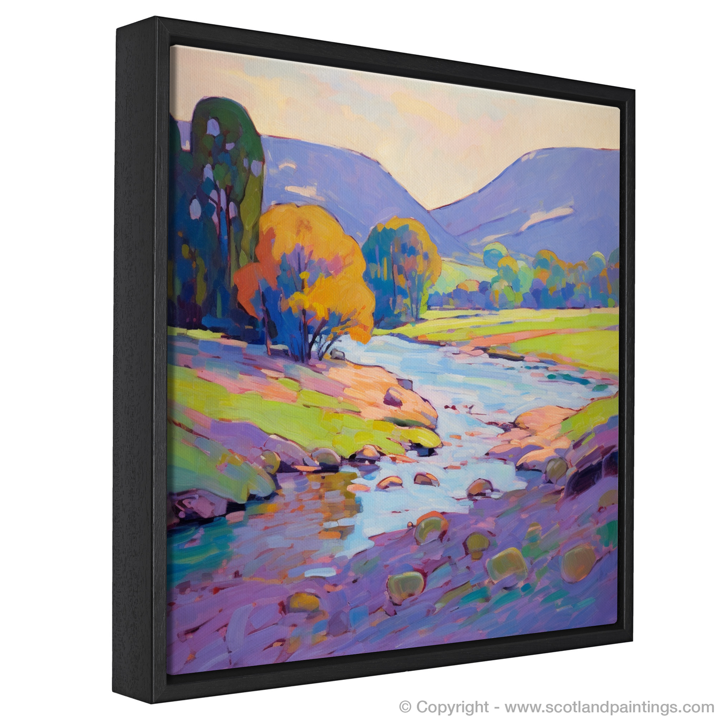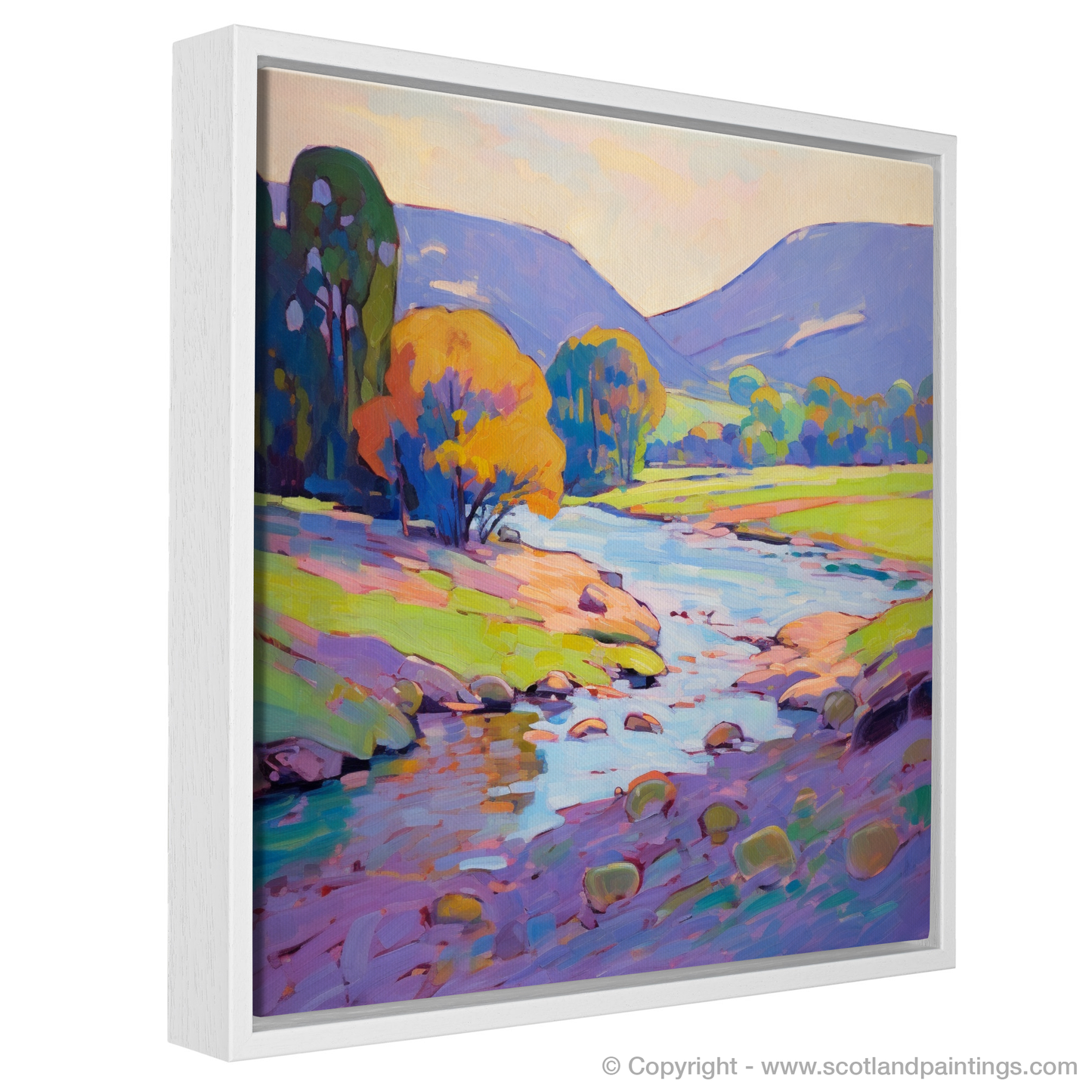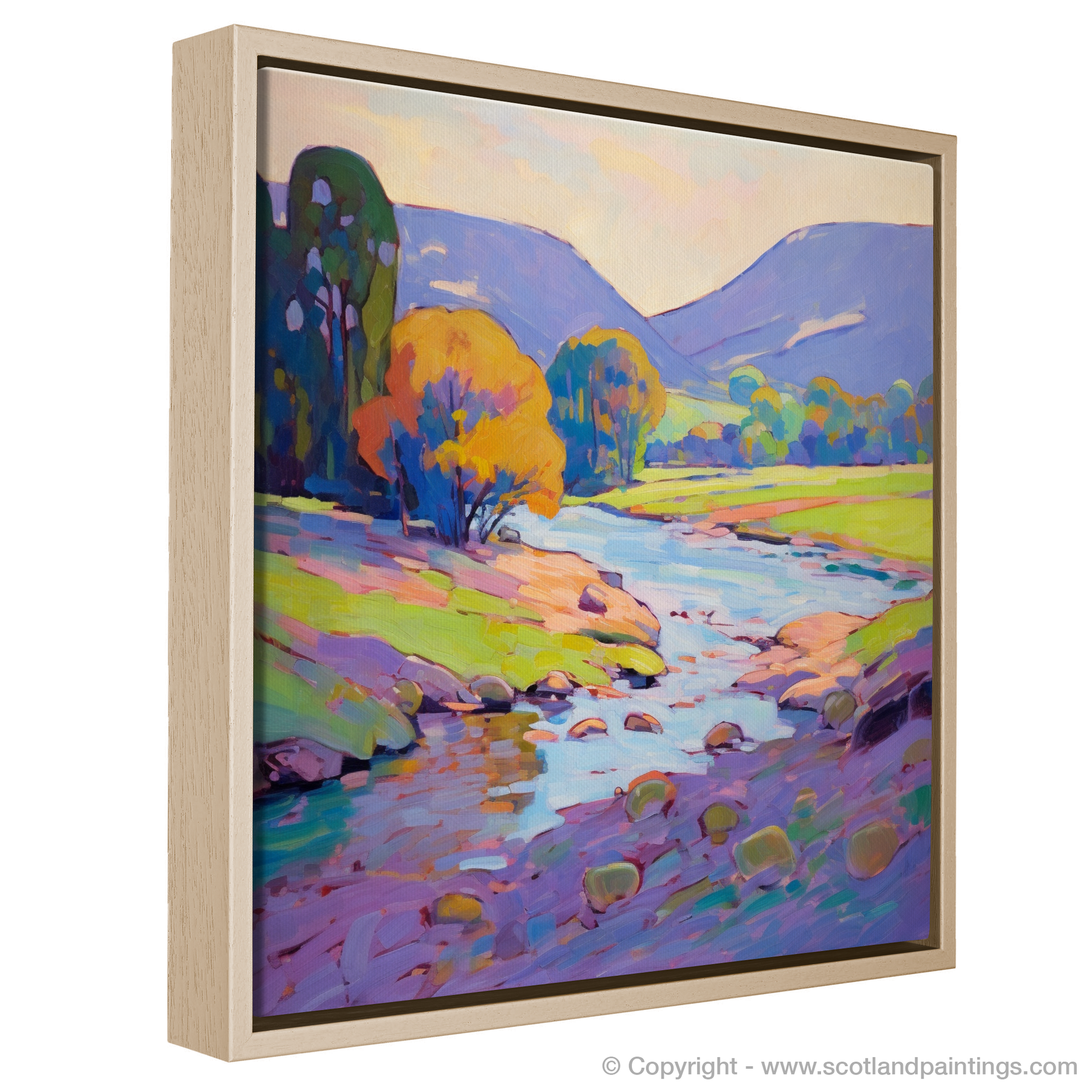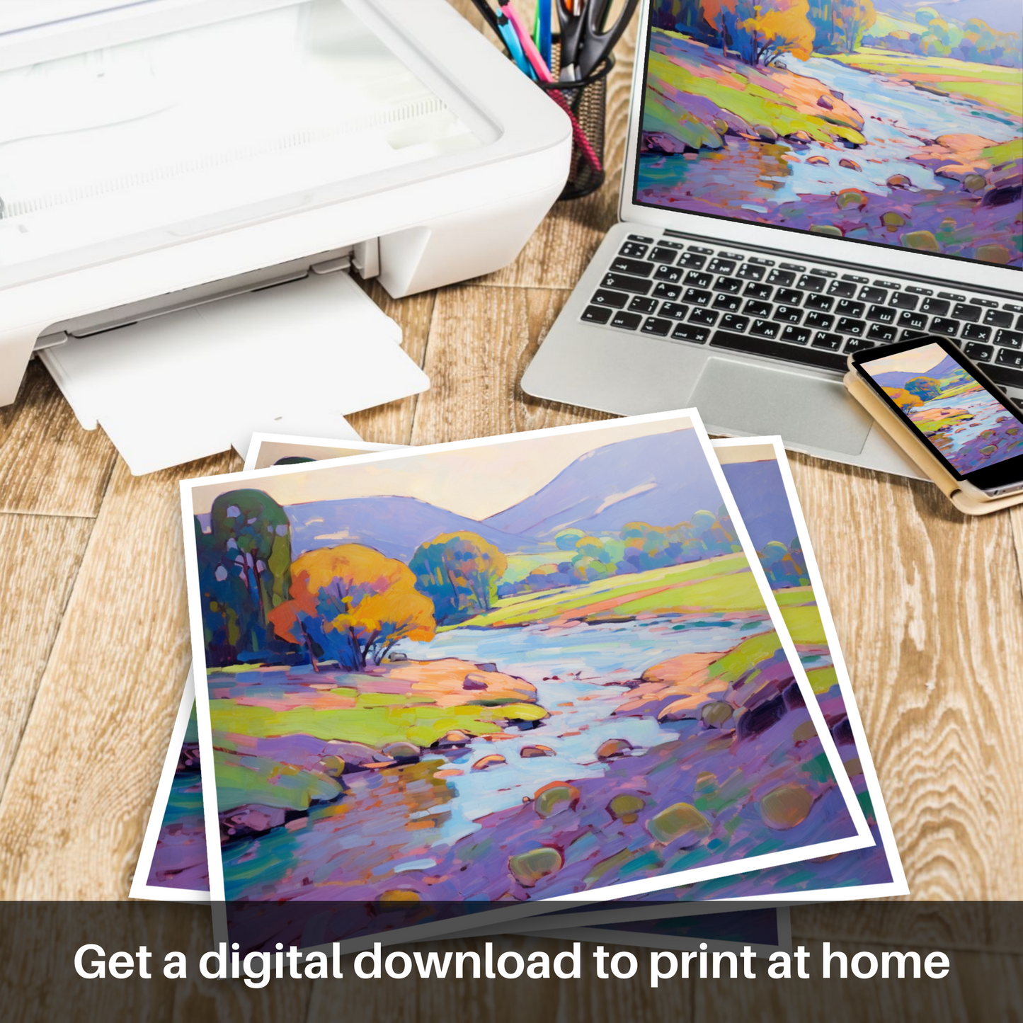 Let the gentle warmth of a Scottish summer's day wash over you with every glance at this enchanting print inspired by the River Esk in Angus. Bold brushstrokes and a vibrant palette capture the play of light and shadow upon the tranquil waters, where flickers of pink and purple hues dance upon the surface, reflecting the mirth of a cloud-kissed sky.