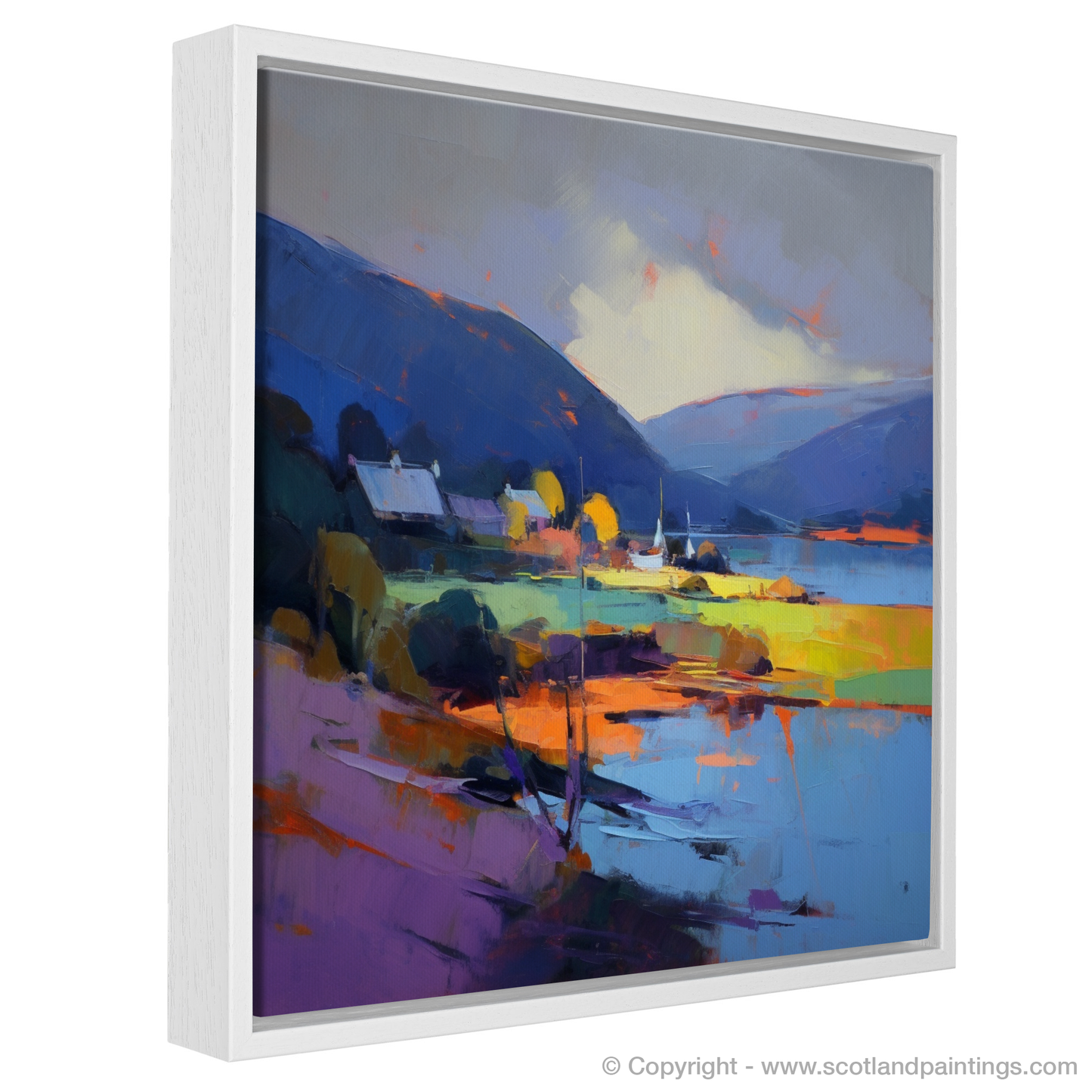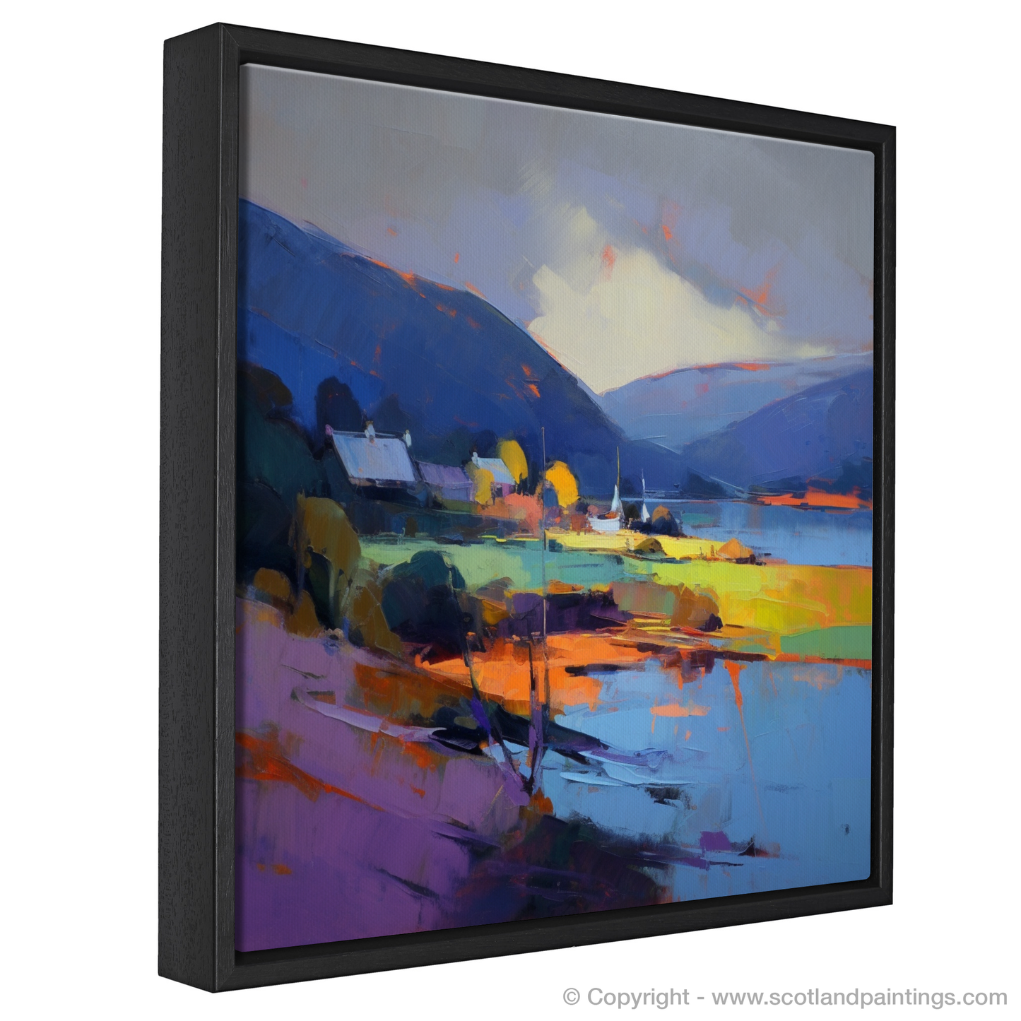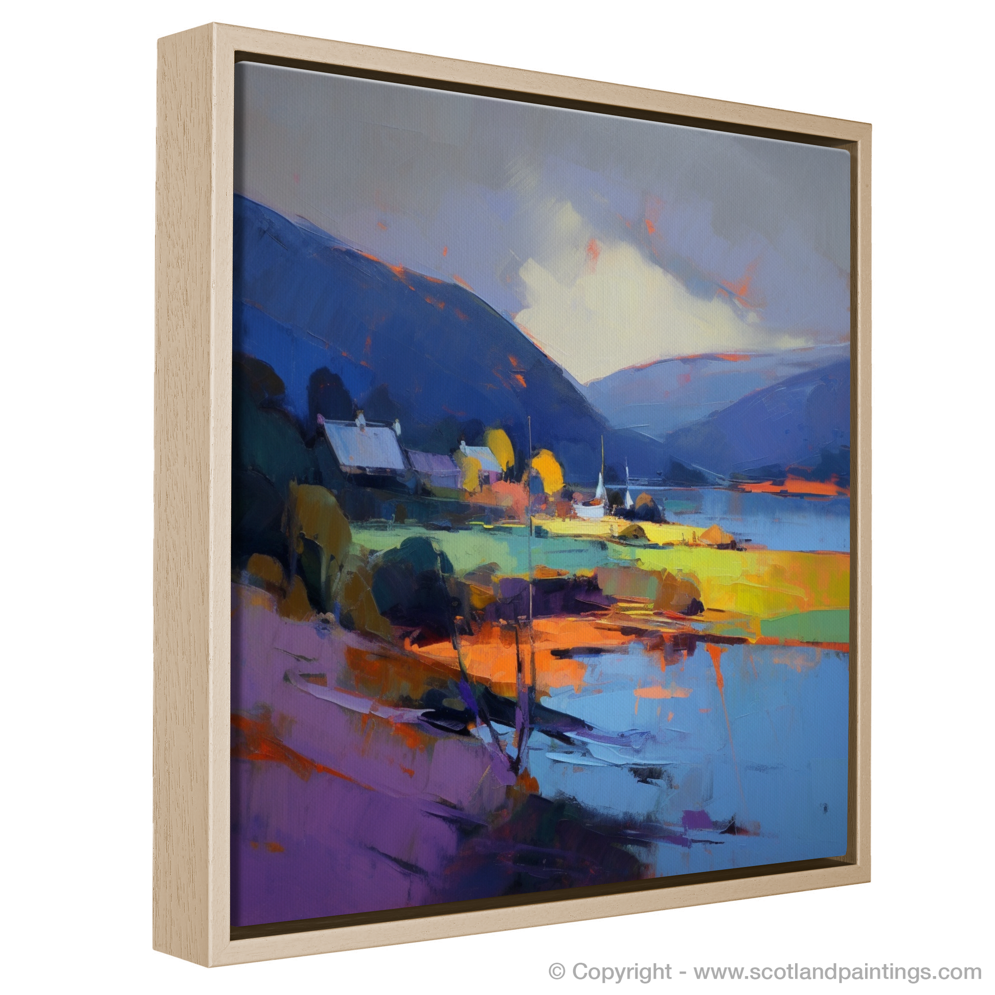 Embrace the raw, emotive energy captured in this striking expressionist portrayal of Isleornsay Harbour amidst an impending storm. The painting brings to life the tempestuous beauty of Scotland's maritime life with a colour palette that evokes the dramatic mood of a stormy Scottish skyline. Lavish purples and muted blues dominate the foreground, with striking contrasts of bright yellows and warm oranges reflecting the interplay of natural light and dark, foreboding clouds.