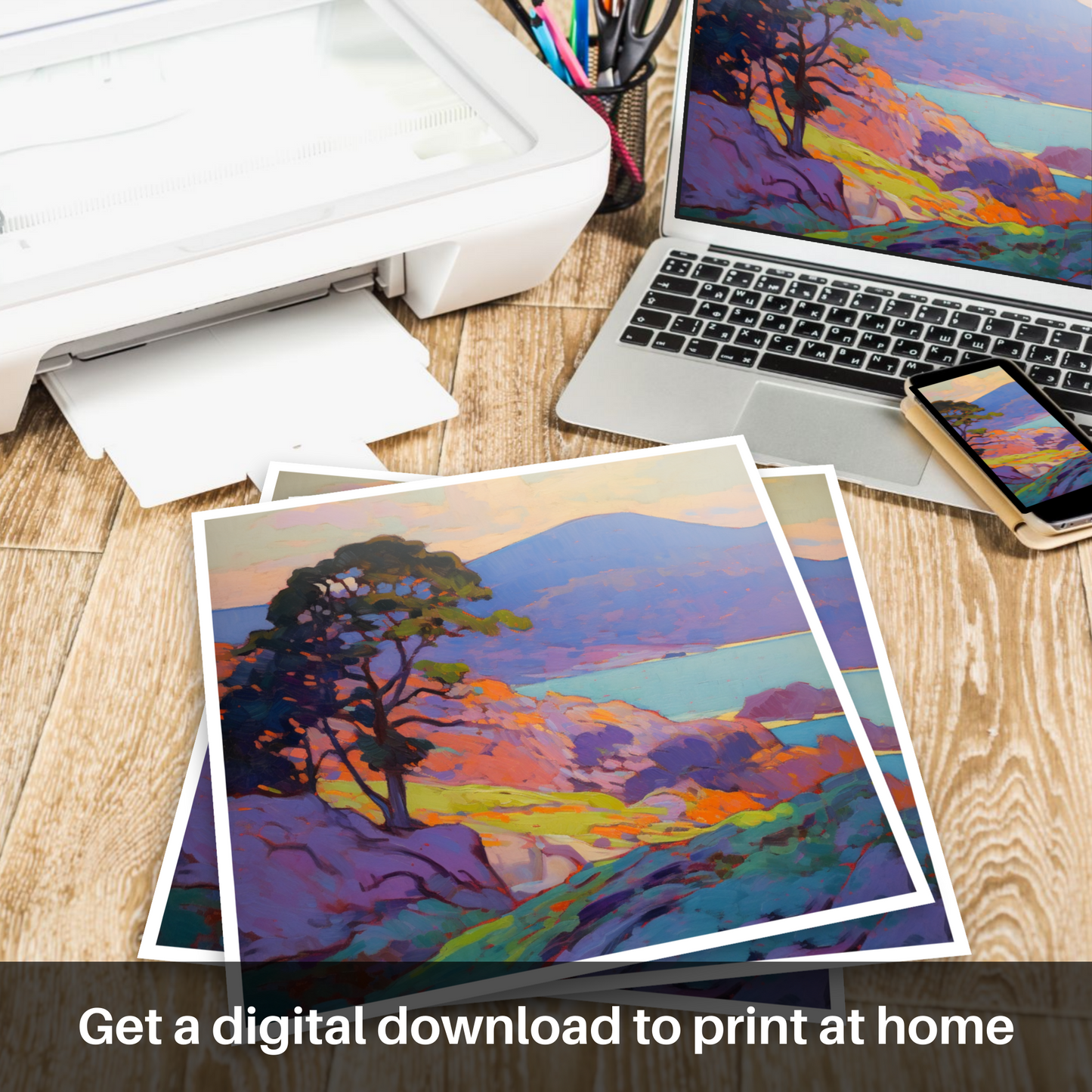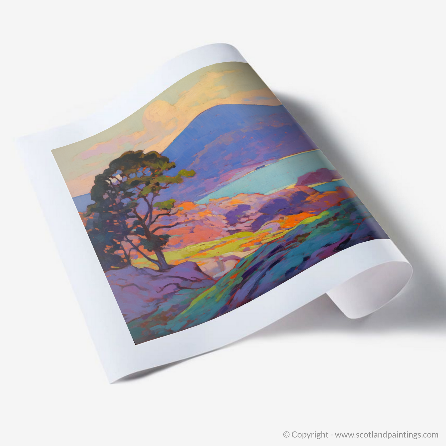 Capturing the raw beauty of Scotland’s rugged landscapes, this print transports you to the heart of Càrn an Tuirc, a venerable giant among the Scottish Munros. The visual poetry of the wild Scottish highlands unfolds in a symphony of vibrant colours under the touch of impressionistic flair.