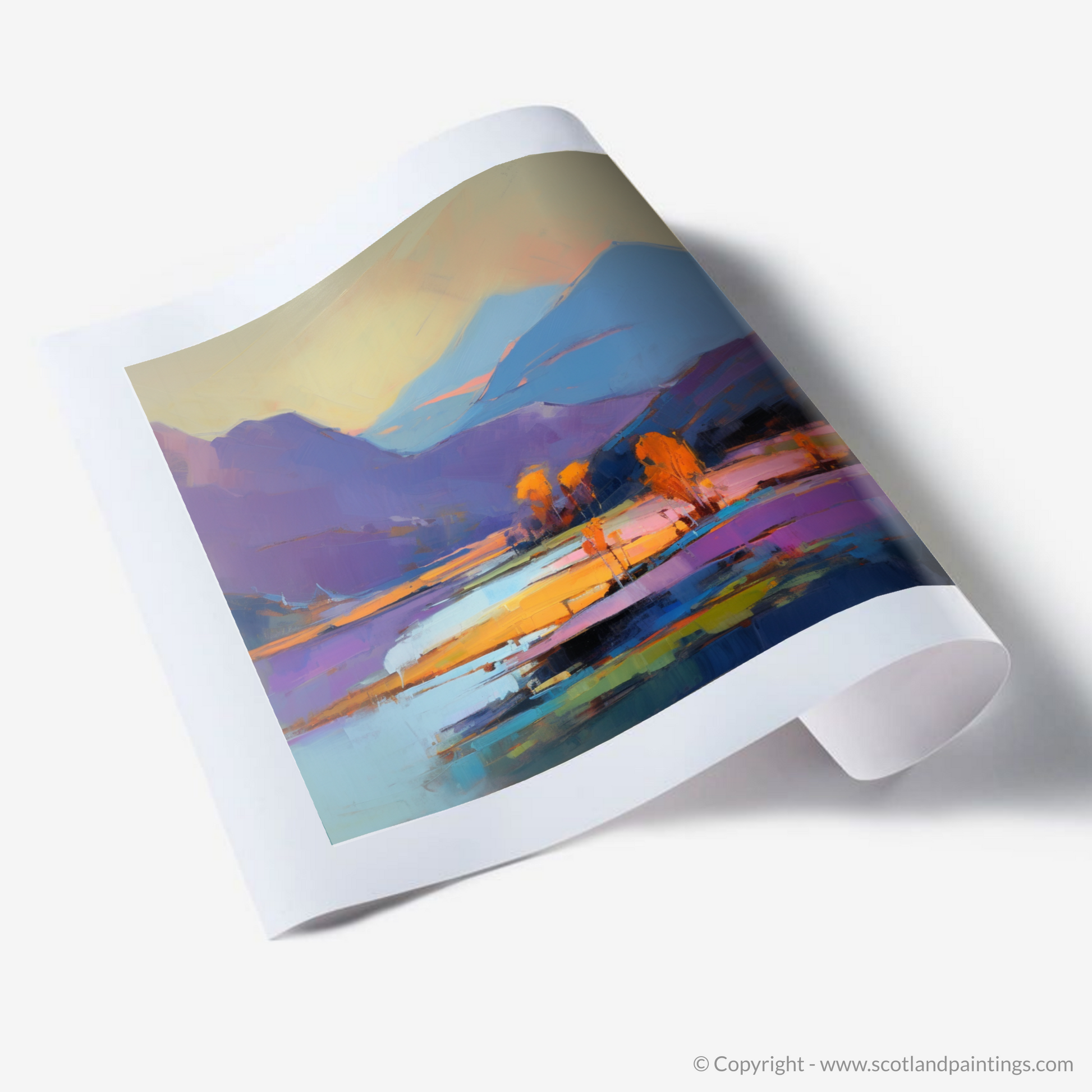 Immerse yourself in the vivid, emotive landscape of the Scottish Highlands with this captivating expressionist-inspired print. The artwork invites viewers into a lineament of bold, fluid brushstrokes that frame the serene grandeur of Loch Morar, a gem nestled within rugged terrains. A transformative palette manifests in a burst of radiant oranges, deep purples, and tranquil blues, reflecting the loch's famed crystalline waters.