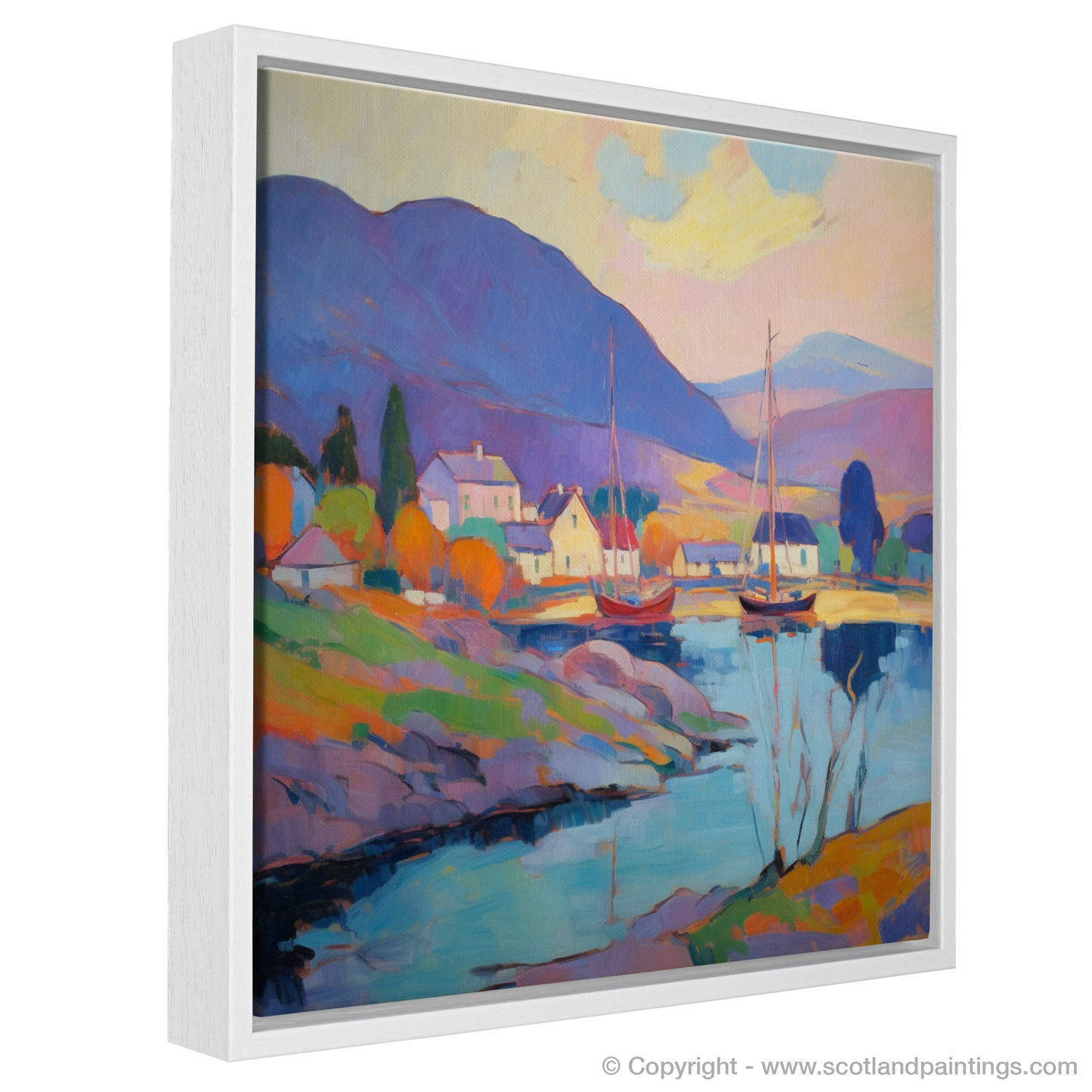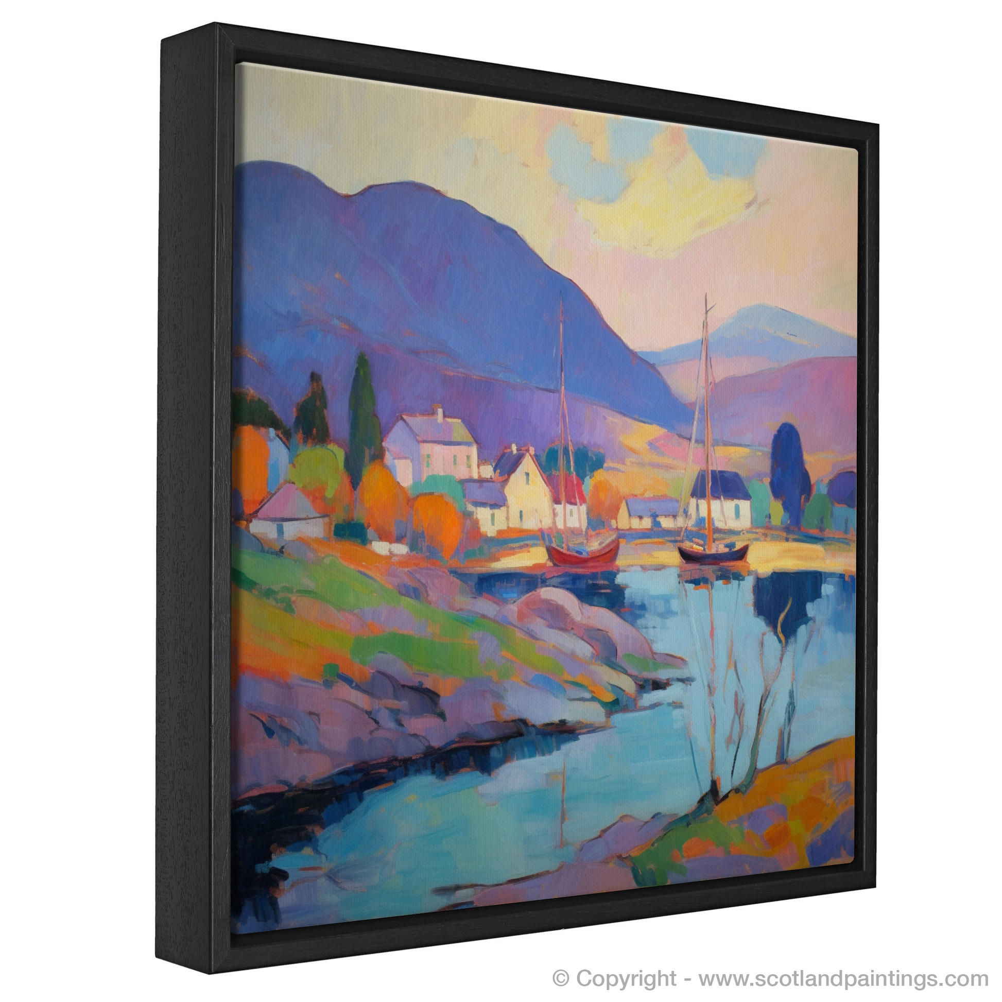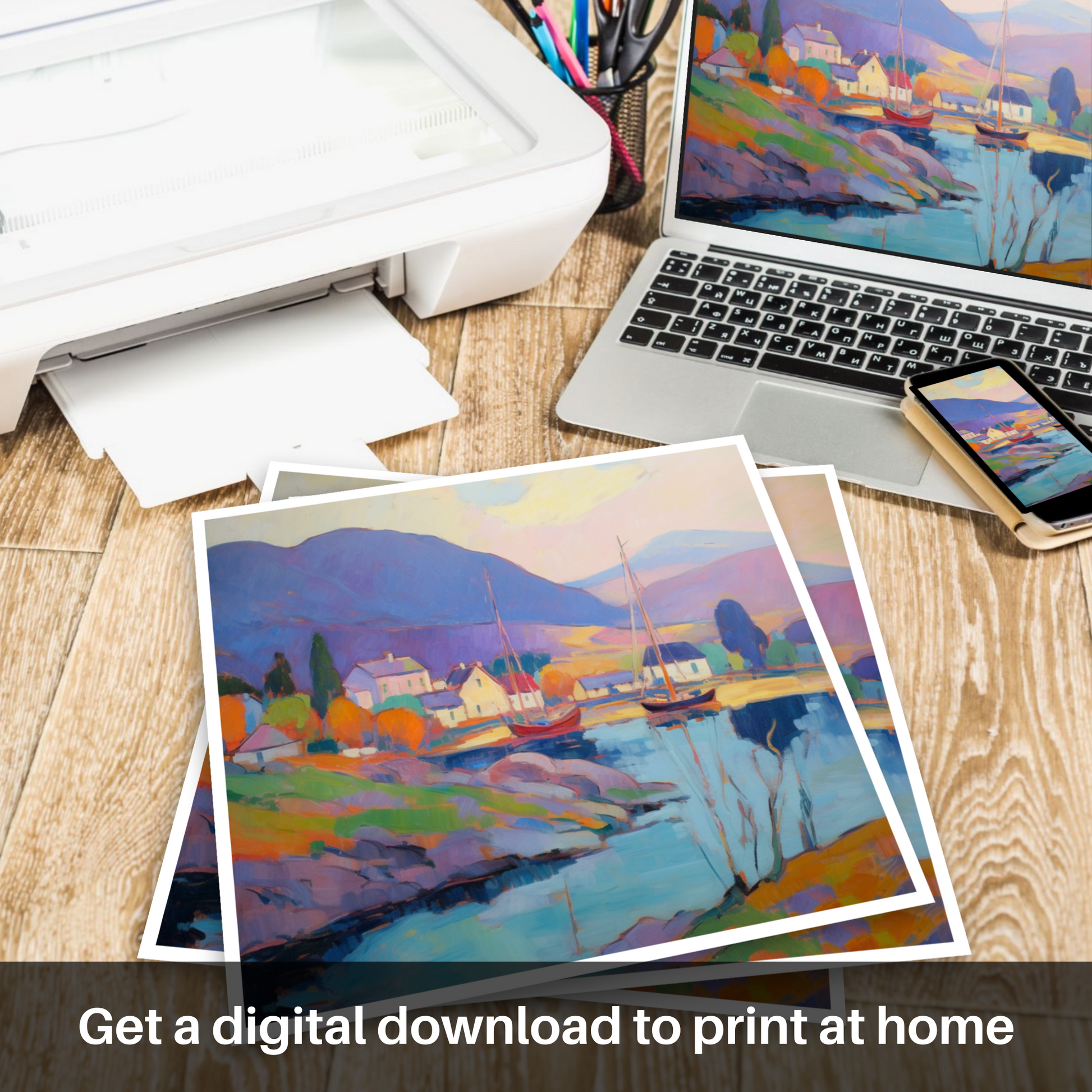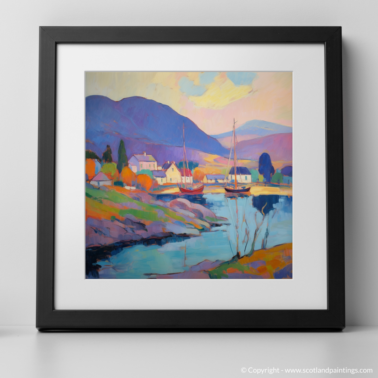 As the sun dips low on the horizon, casting a warm yet soft light over the landscape, this evocative print offers a glimpse into the serene life of Mallaig Harbour, located in the majestic Inverness-shire region of Scotland. Imbued with the enchanting brushstrokes characteristic of Impressionism, the artwork captures the harbour in a moment of tranquil beauty.