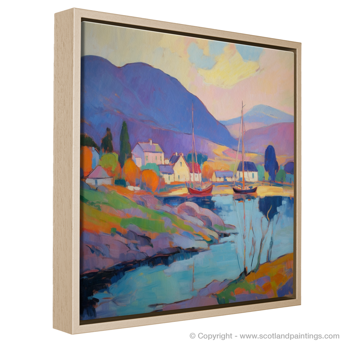 The canvas is brought to life with bold, sweeping strokes of colour, illustrating the rolling hills that cradle the sheltered waters. A pair of traditional sailing vessels, with masts gently swaying, anchors the composition, their wooden hulls reflecting a tapestry of oranges, purples, and blues onto the water’s glistening surface.