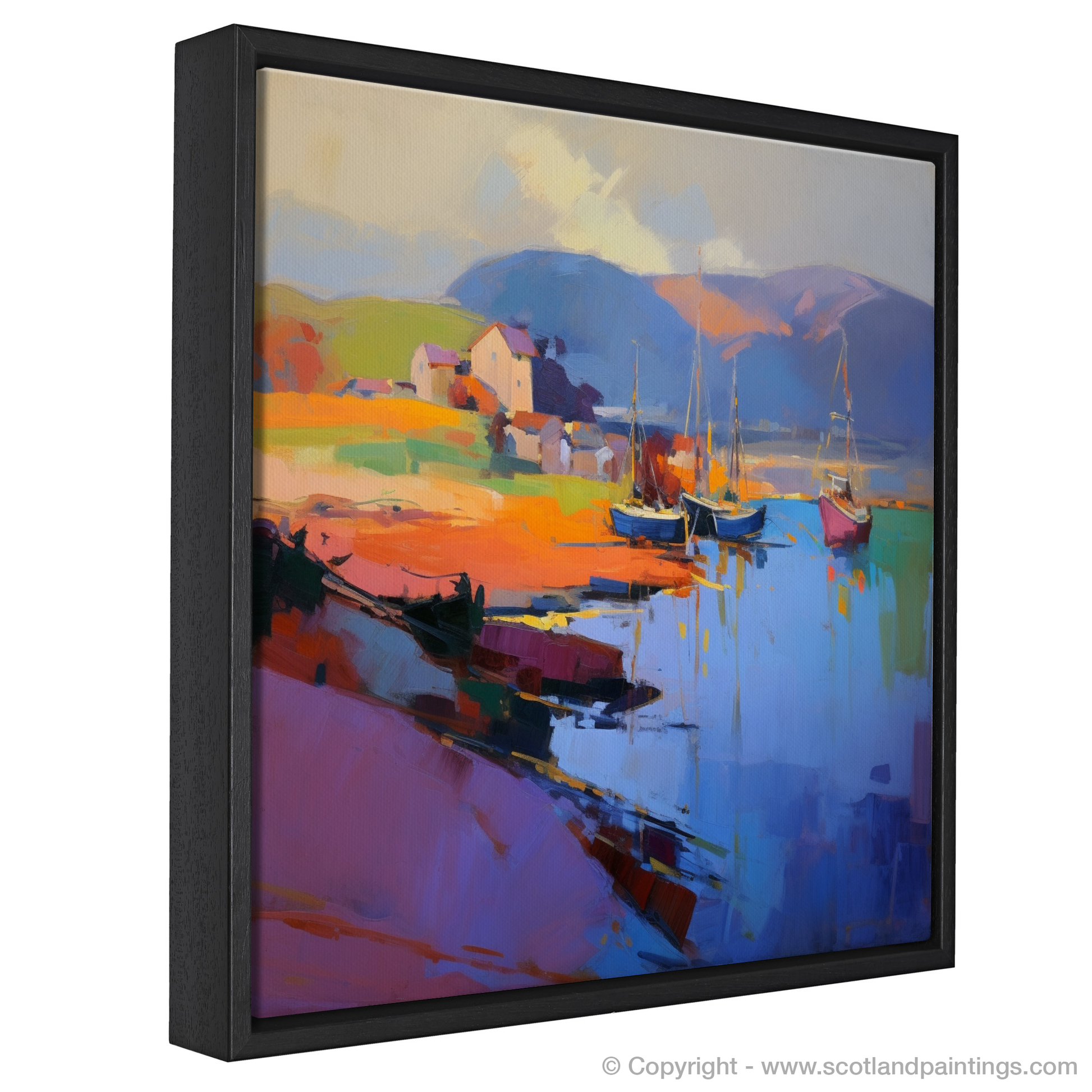 As the day wanes into a luminous golden hour, this exquisite piece captures the quiet splendour of Eyemouth Harbour, a gem nestled on the Scottish coast. With bold, impulsive brushstrokes and a vibrant palette, the print invites viewers into an expressionistic vision where the mundane transects with the magical.