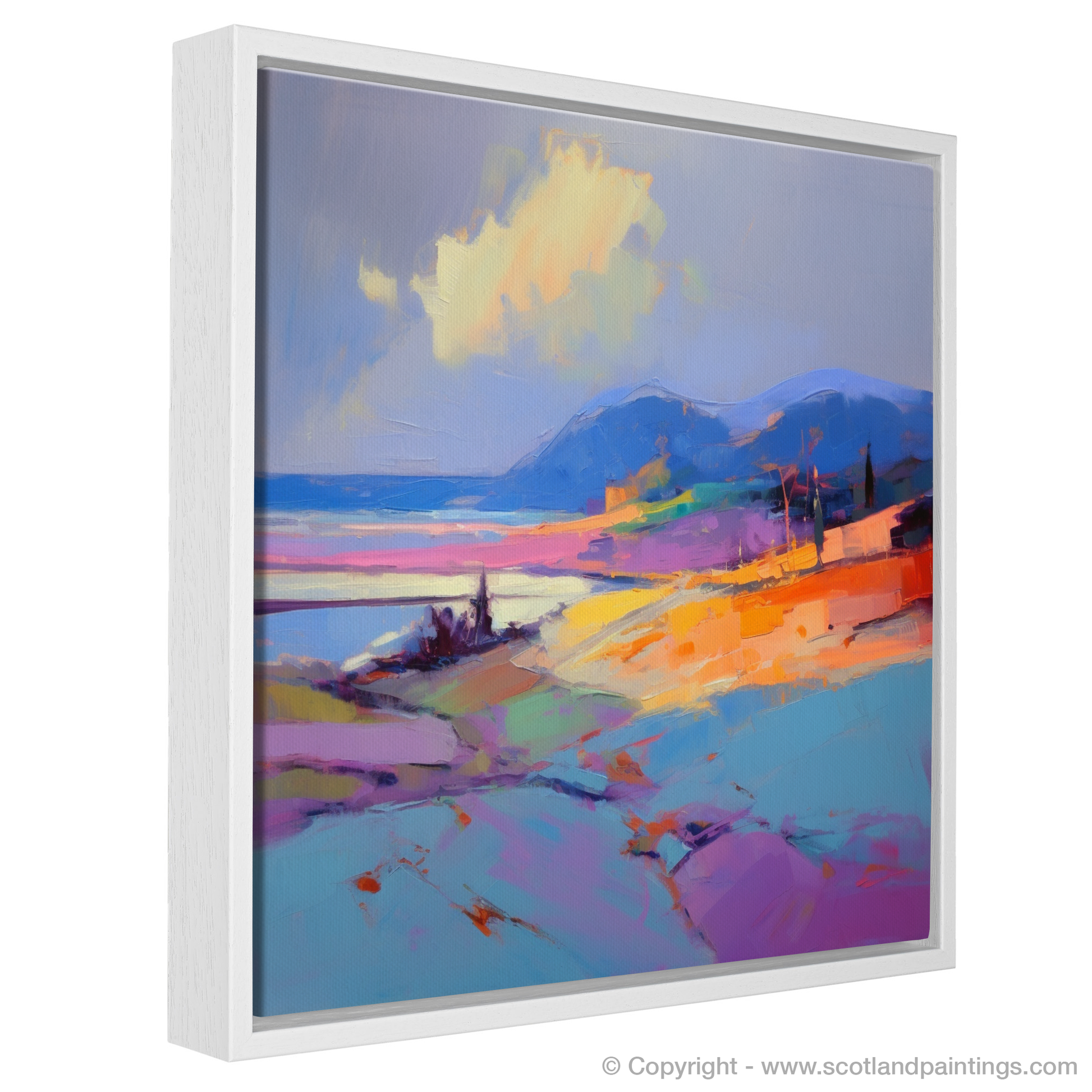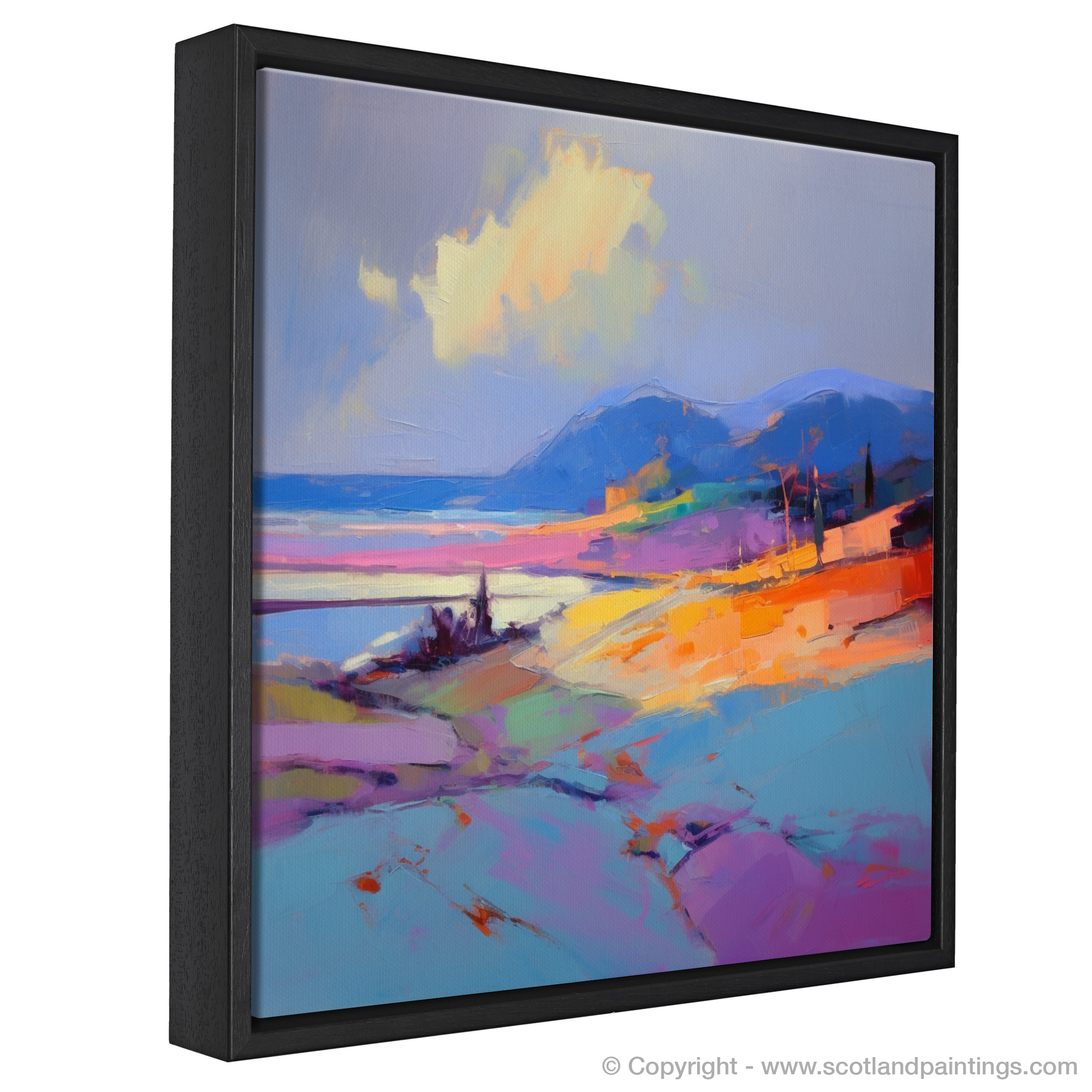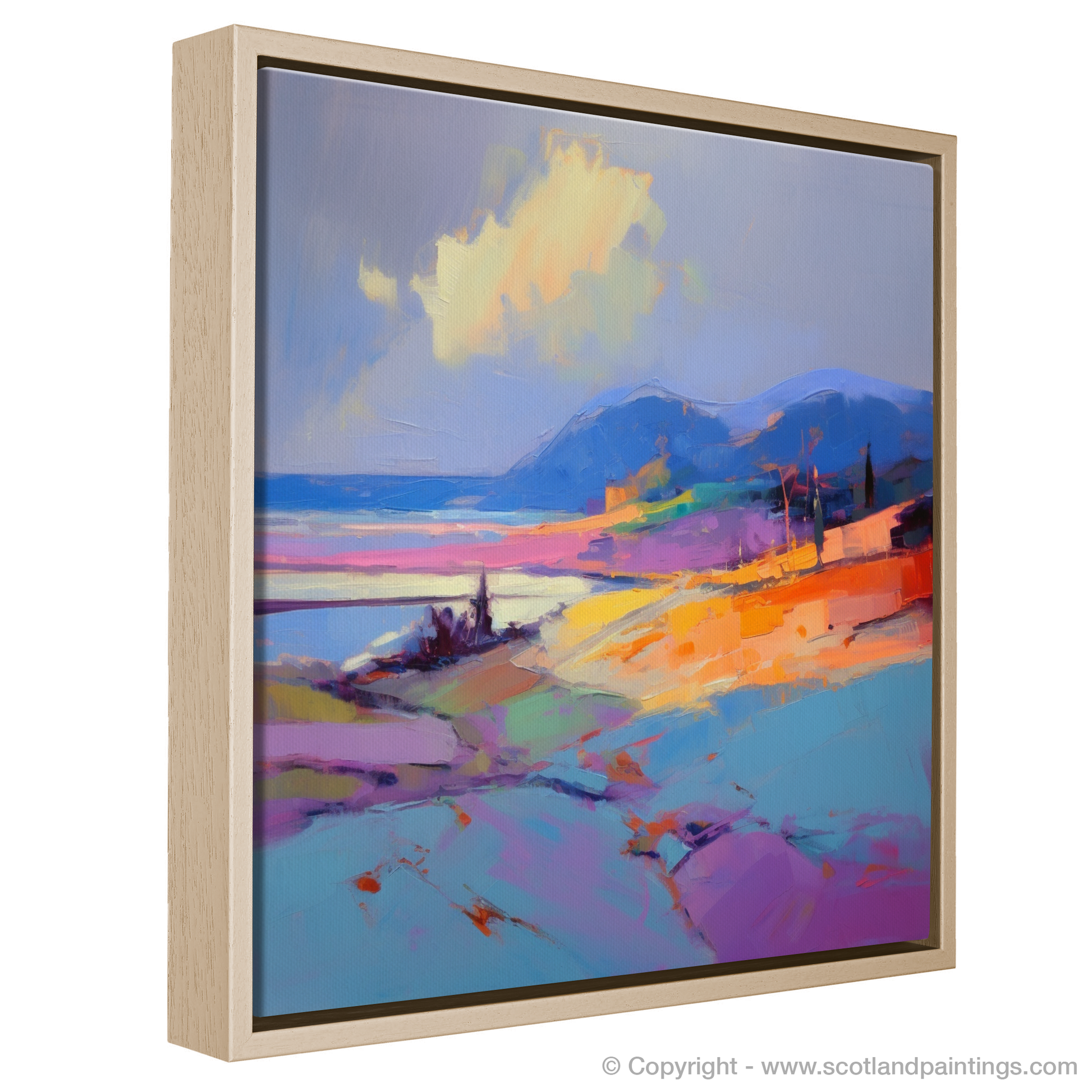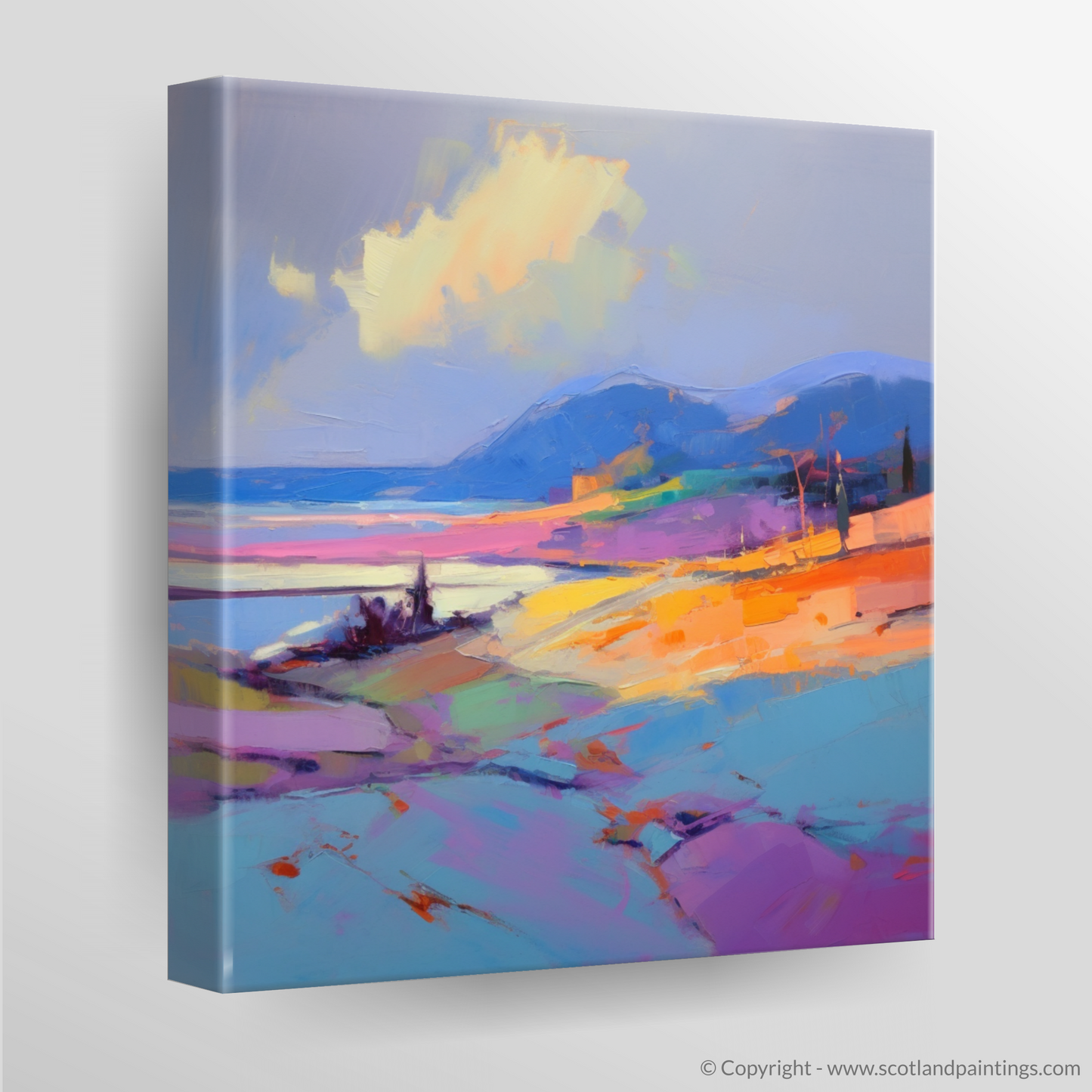 This composition, unbound by strict adherence to realism, uses colour in a way that expresses the emotional heart of the scene. Swathes of lilac and sapphire carve out the rolling dunes, while strokes of peach and rose tinge the sands, reflecting the shifting light of an ever-changing Scottish sky. A distant mountain range is rendered in deep blue hues, its silhouette a majestic presence that looms over the panoramic landscape.