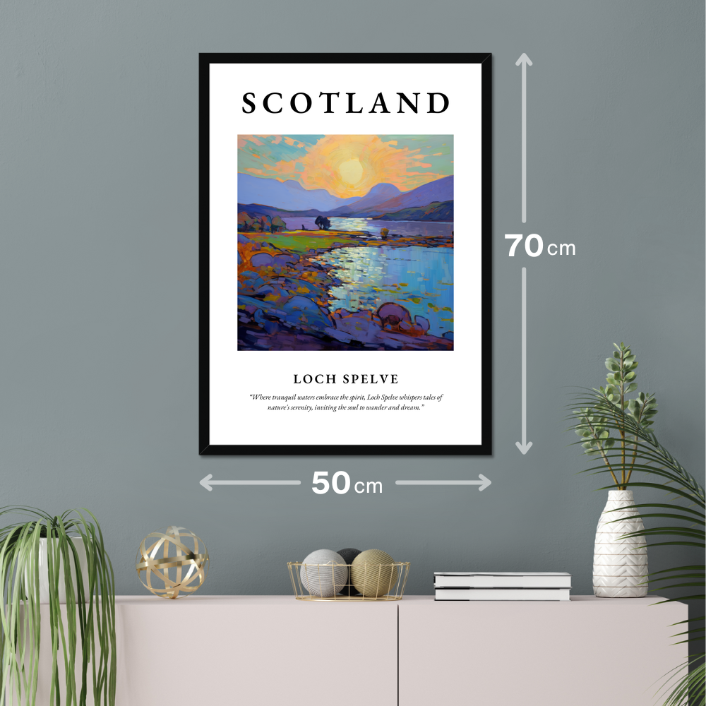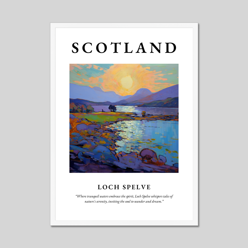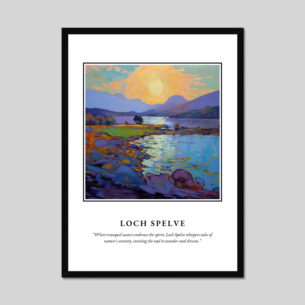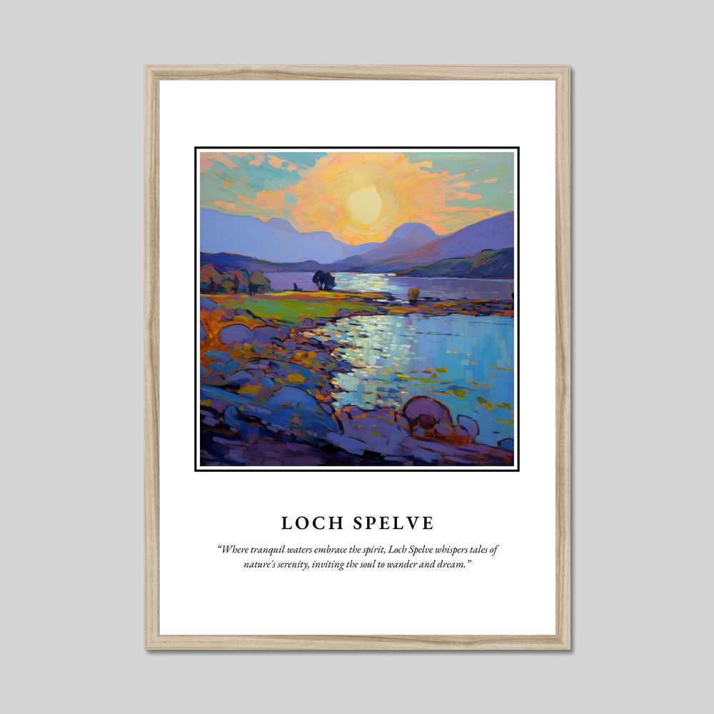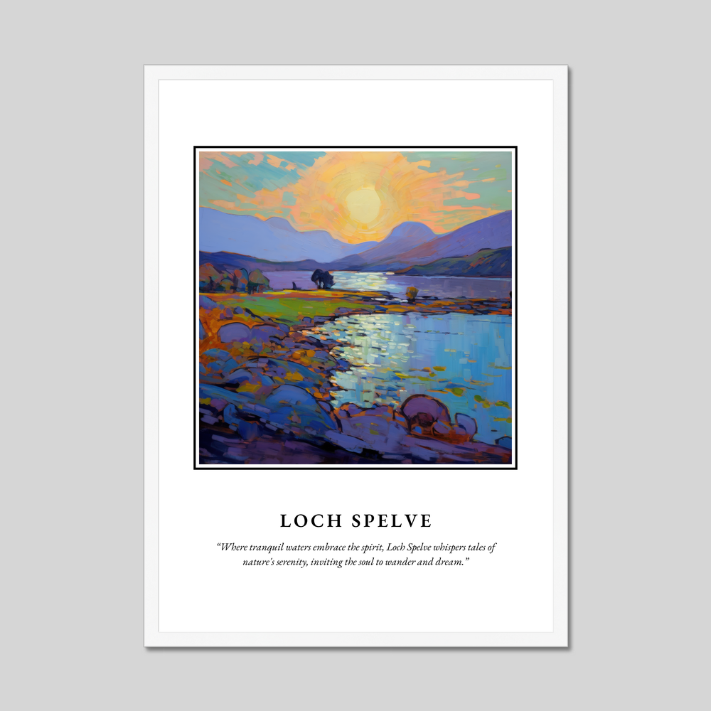 The poster, available in a range of stylish frame options—black, white, or a natural wood-effect—measures an impressive 50cm x 70cm. Its large size offers a striking visual impact, providing an affordable way to transform your living space with a piece of Scotland's natural beauty. The top of the poster proudly displays the bold lettering of “SCOTLAND,” drawing immediate attention, while the quote beneath the painting beautifully evokes the enchanting serenity of Loch Spelve.