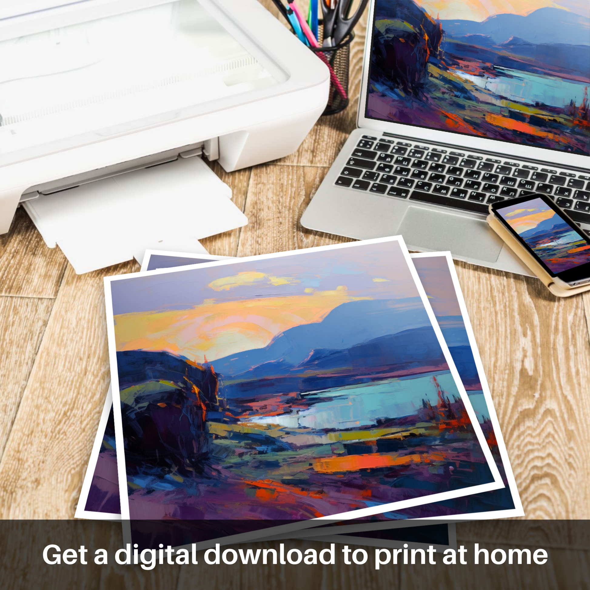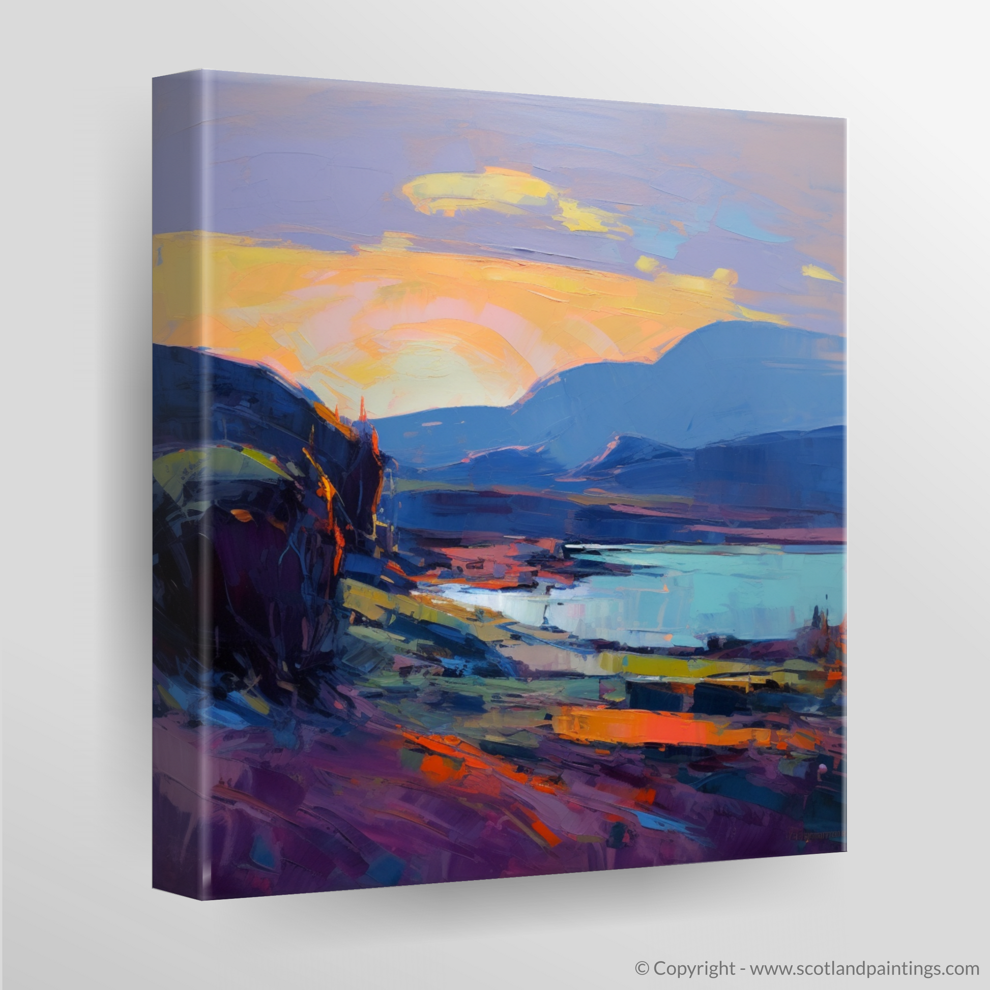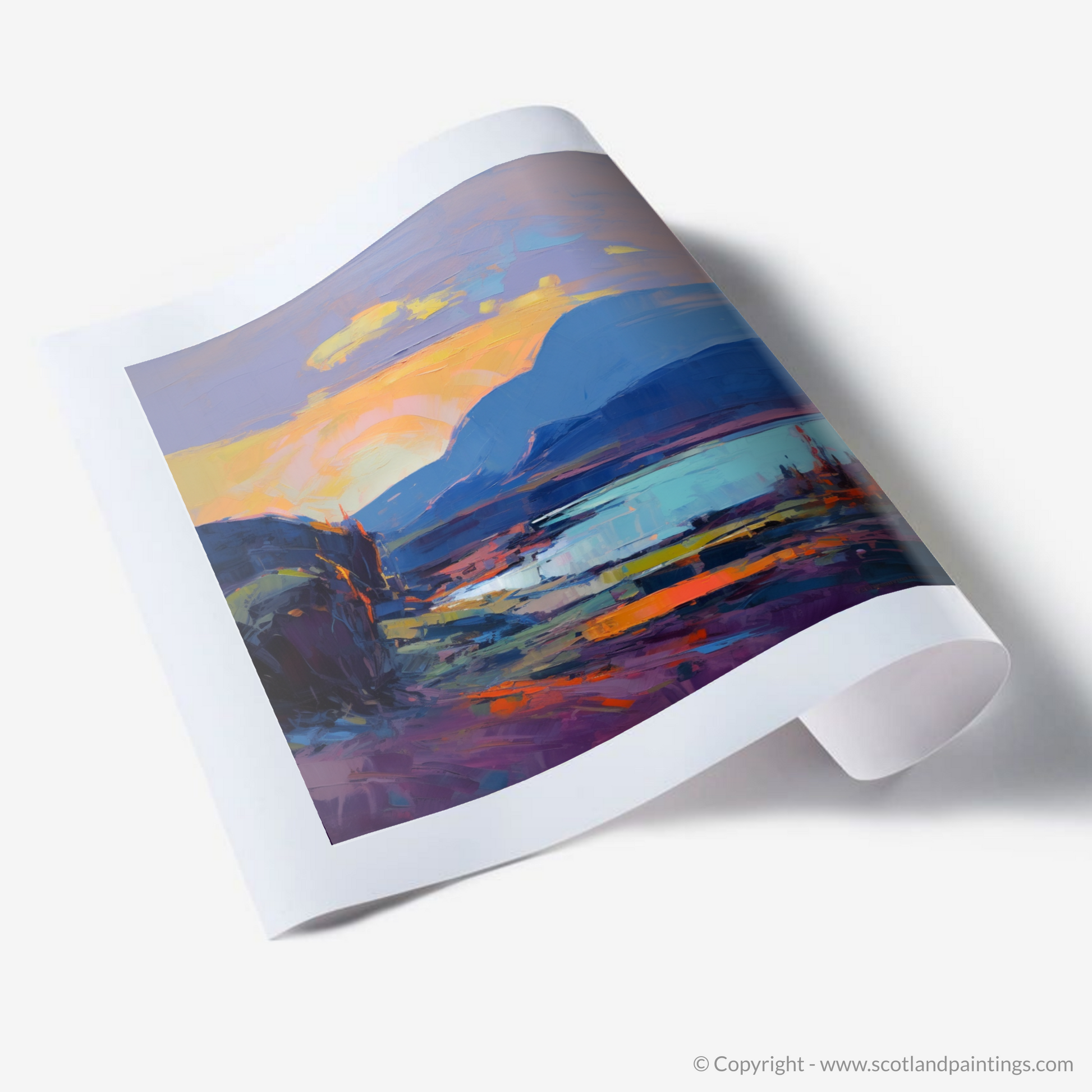 Featuring a landscape transformed by the waning light, the artwork bathes the viewer in deep purples and blues of the surrounding cliffs and rolling hills. The expressive brushstrokes create a dynamic texture that seems to dance across the canvas, encapsulating the wild spirit of Scotland's natural beauty.