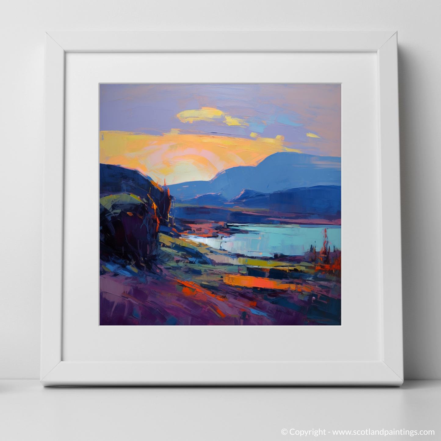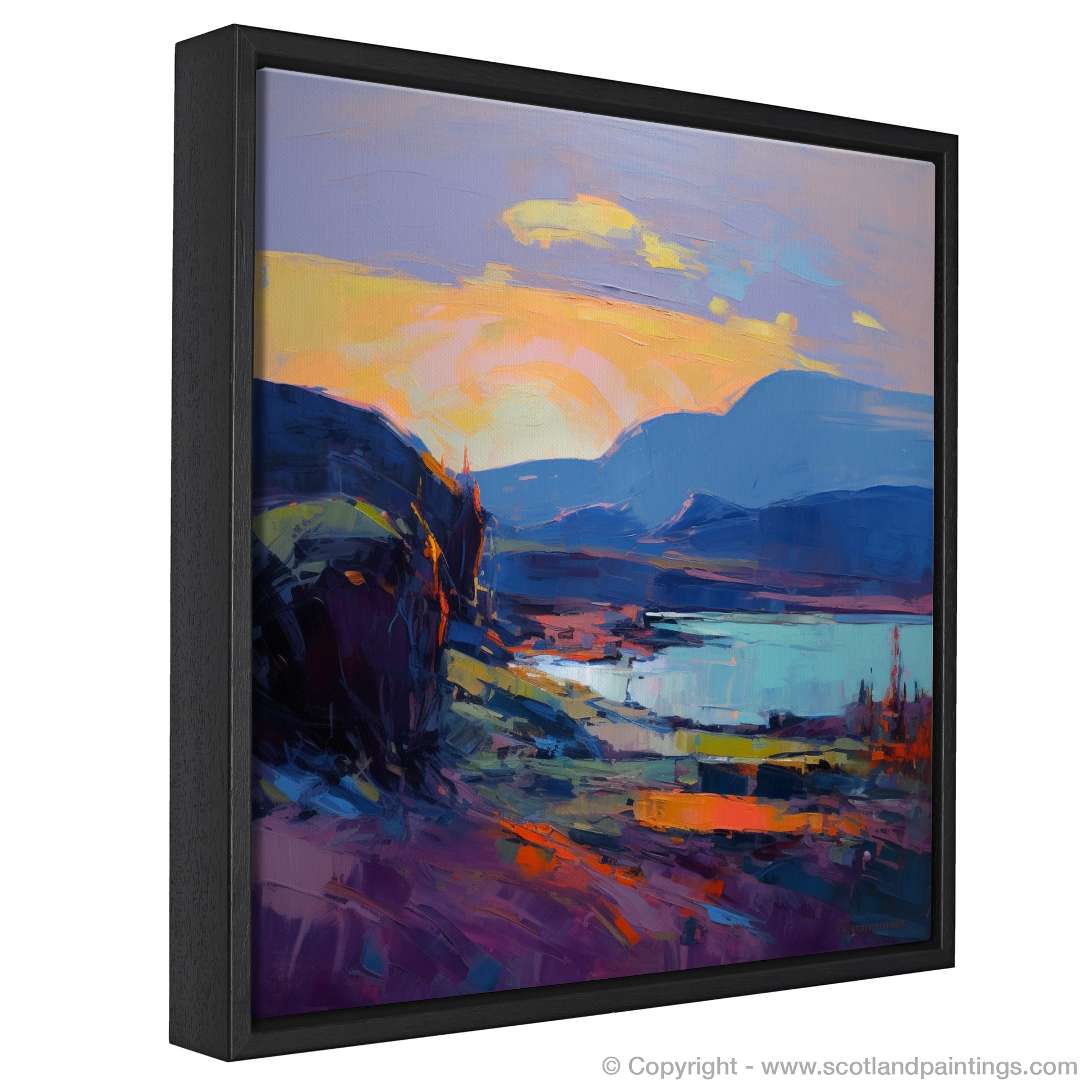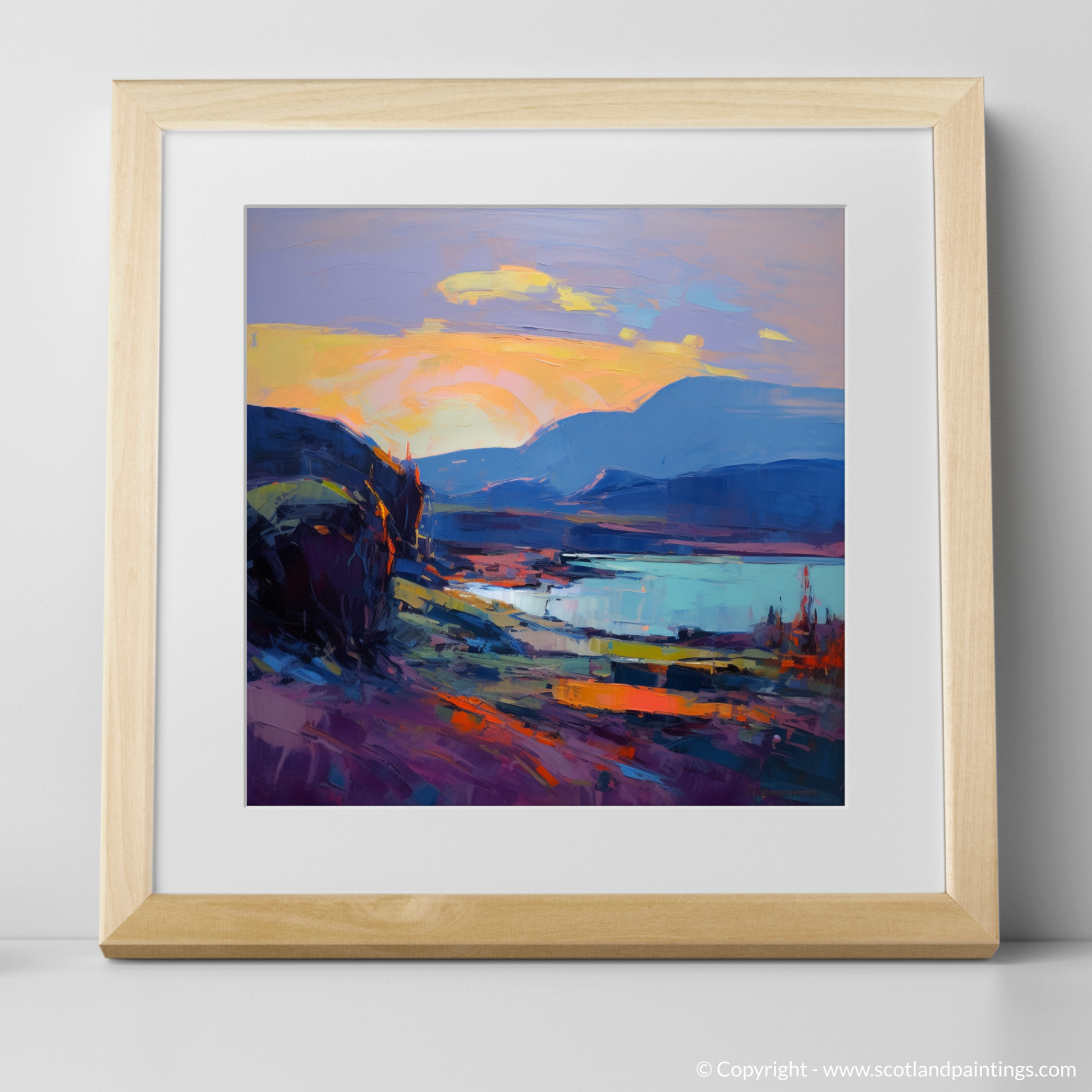 Featuring a landscape transformed by the waning light, the artwork bathes the viewer in deep purples and blues of the surrounding cliffs and rolling hills. The expressive brushstrokes create a dynamic texture that seems to dance across the canvas, encapsulating the wild spirit of Scotland's natural beauty.