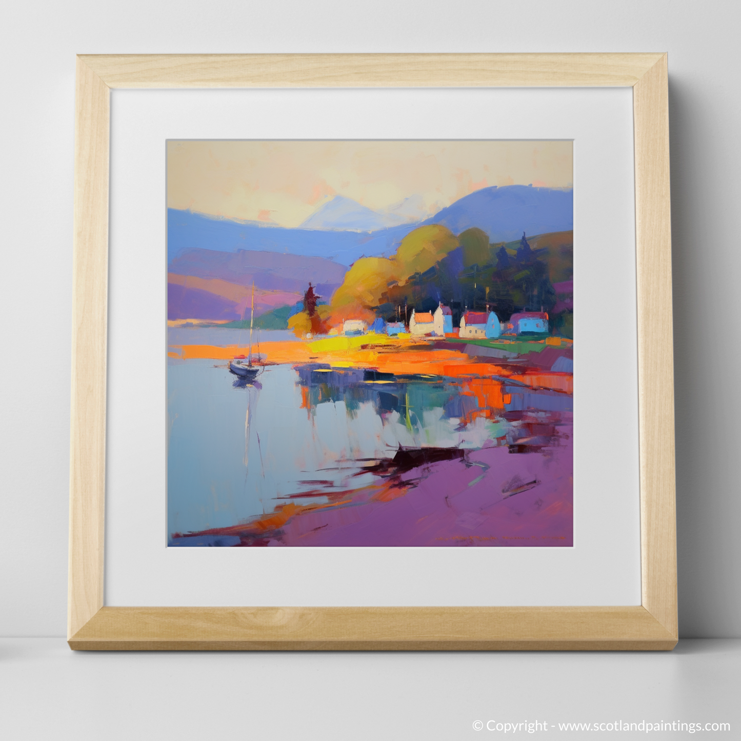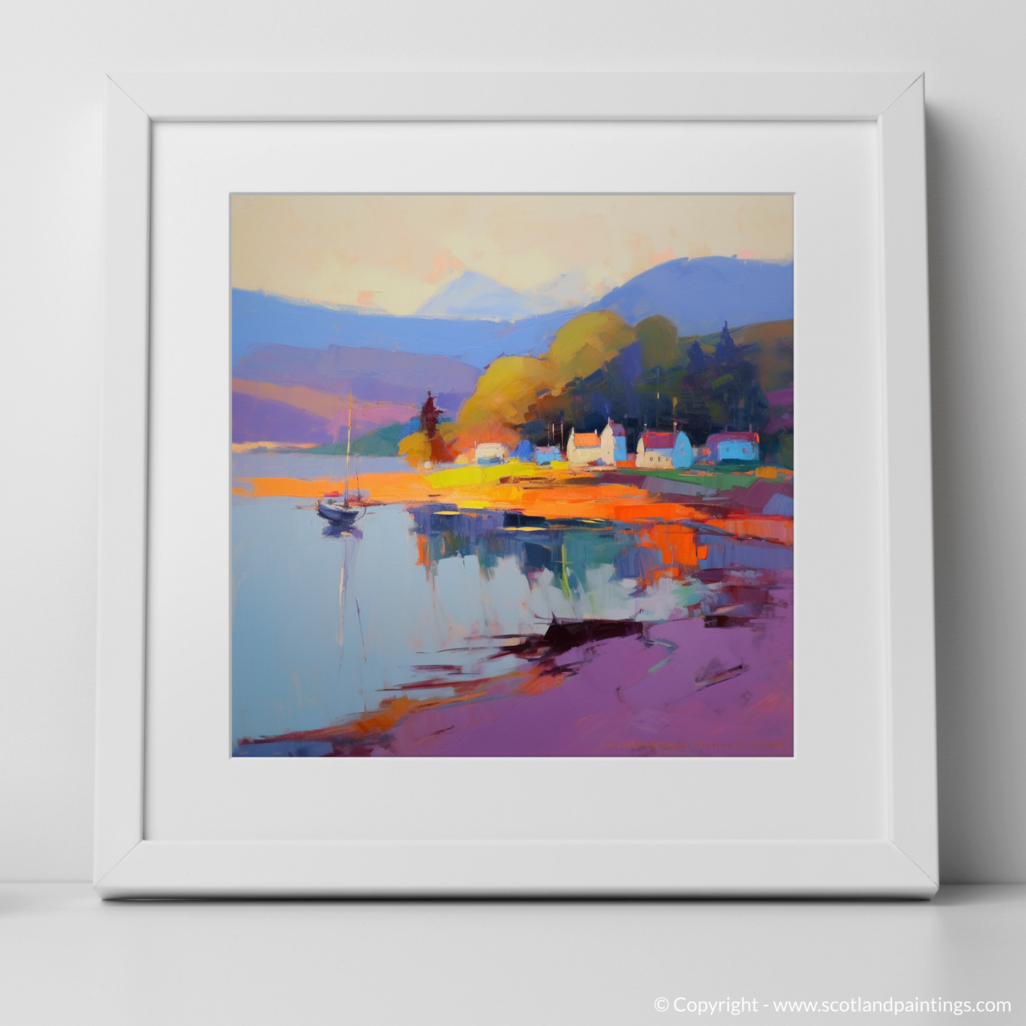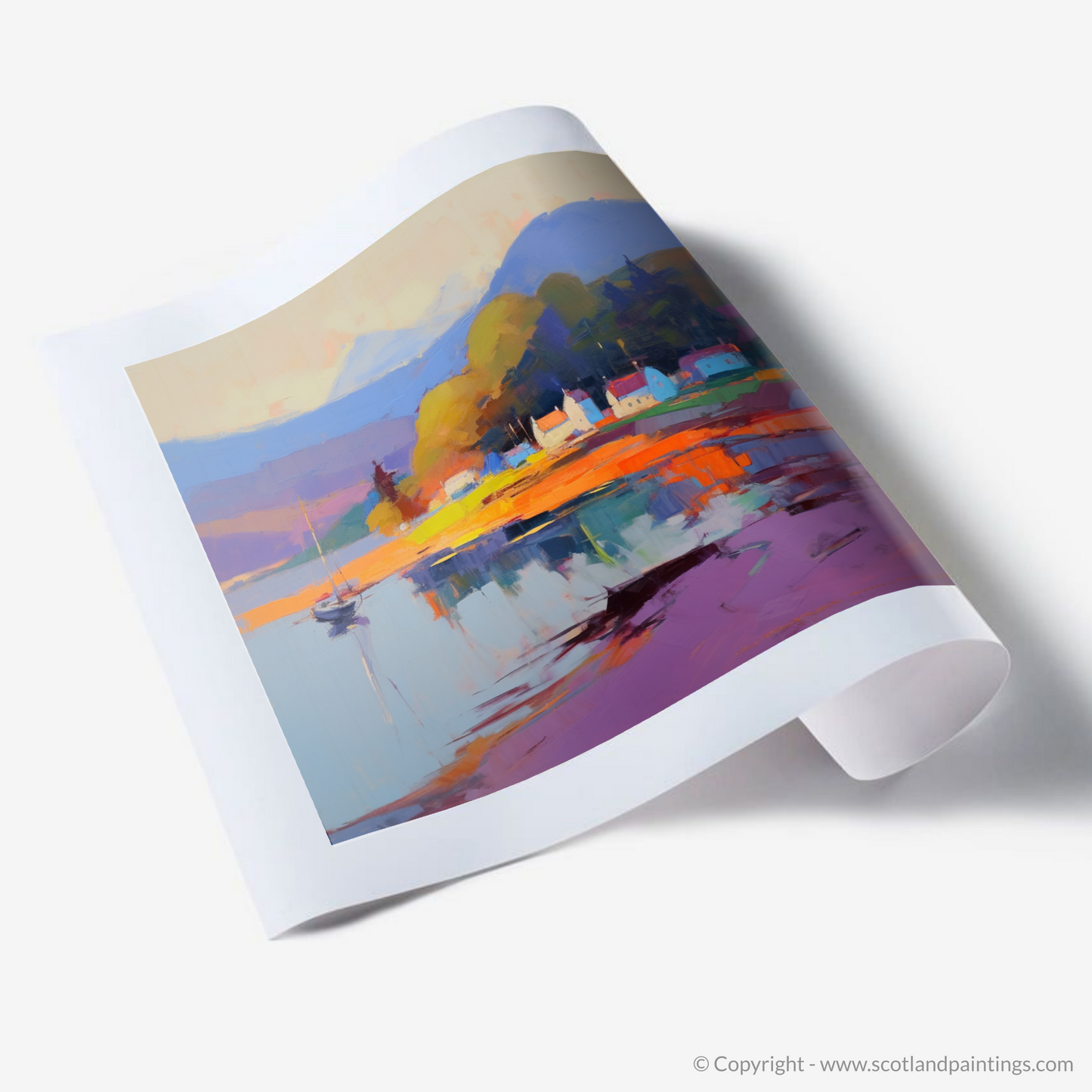 Imbued with the ethereal glow of golden hour, this evocative print captures the serene vitality of Millport Harbour. Bold, emotive brushstrokes invite the observer into a Scottish harbour scene suffused with warmth as the waning sunlight drenches the sky in a vibrant palette of deep purples, fiery oranges, and soft, radiant pinks.