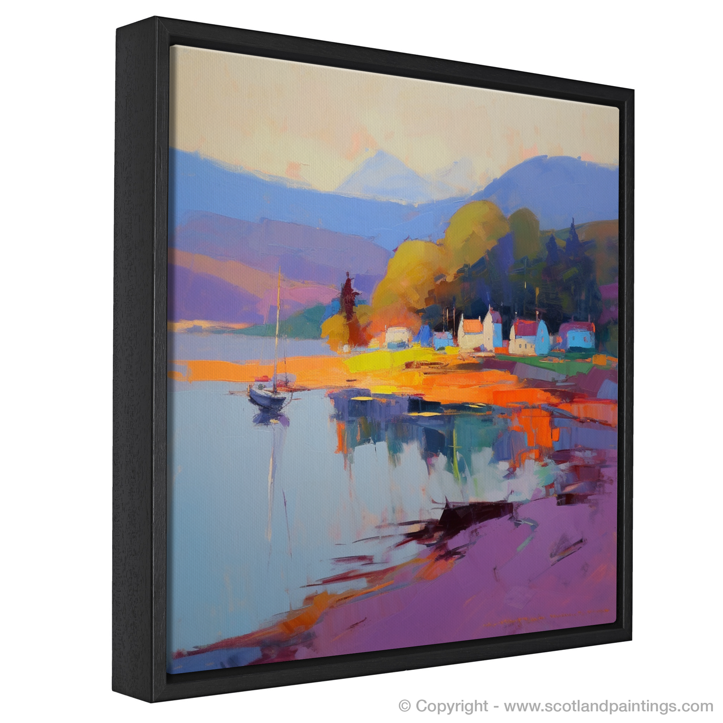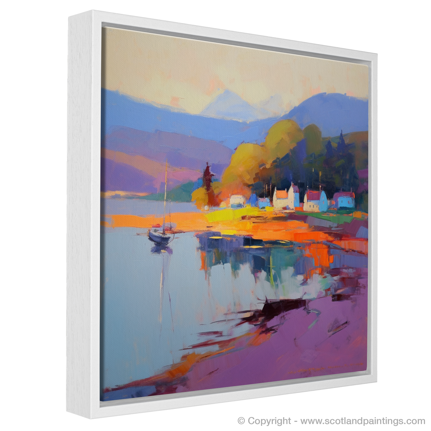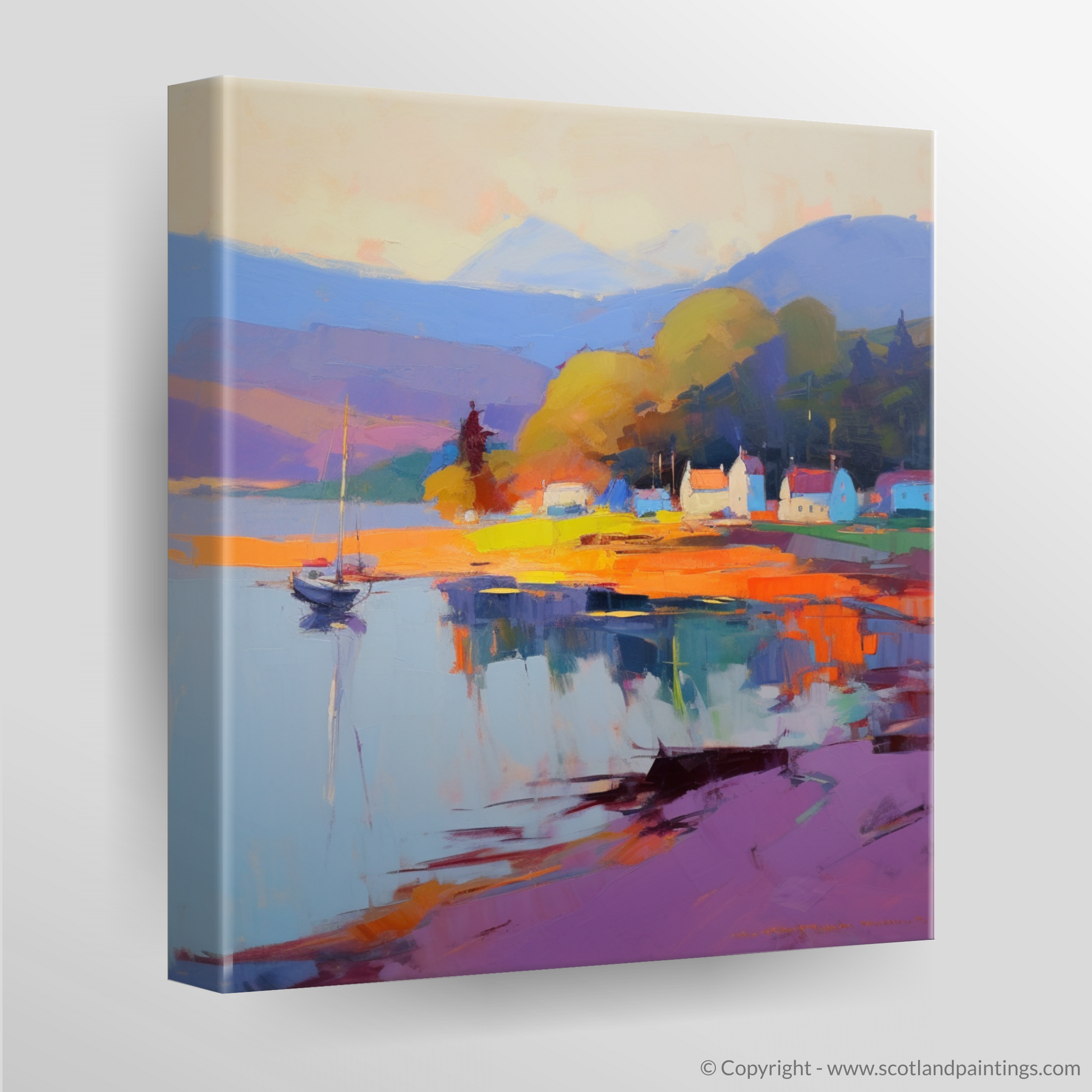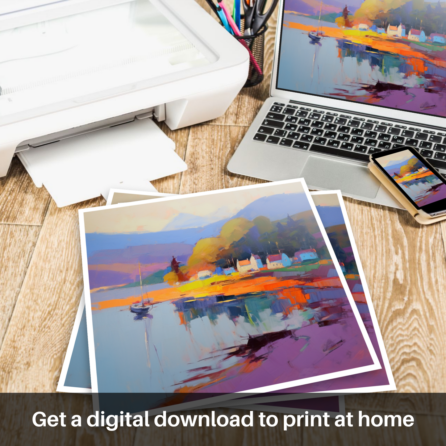Imbued with the ethereal glow of golden hour, this evocative print captures the serene vitality of Millport Harbour. Bold, emotive brushstrokes invite the observer into a Scottish harbour scene suffused with warmth as the waning sunlight drenches the sky in a vibrant palette of deep purples, fiery oranges, and soft, radiant pinks.