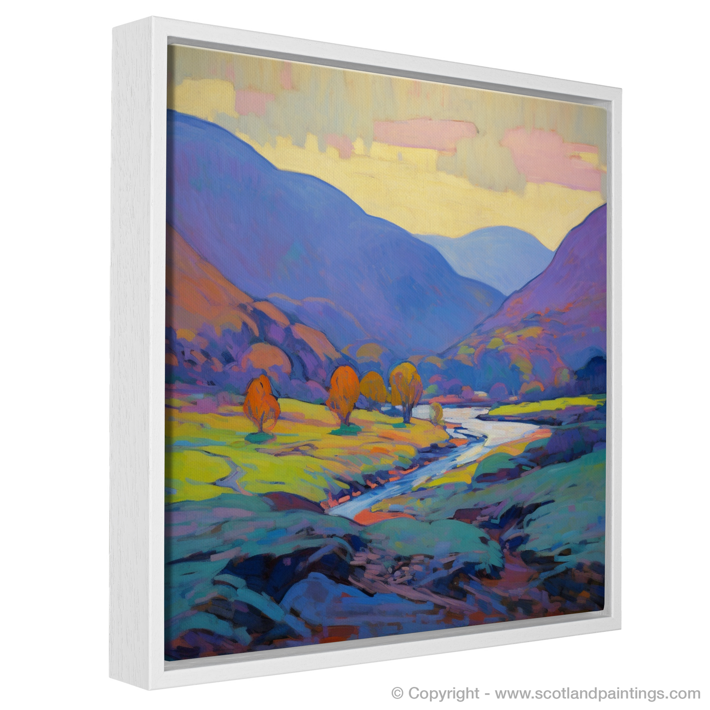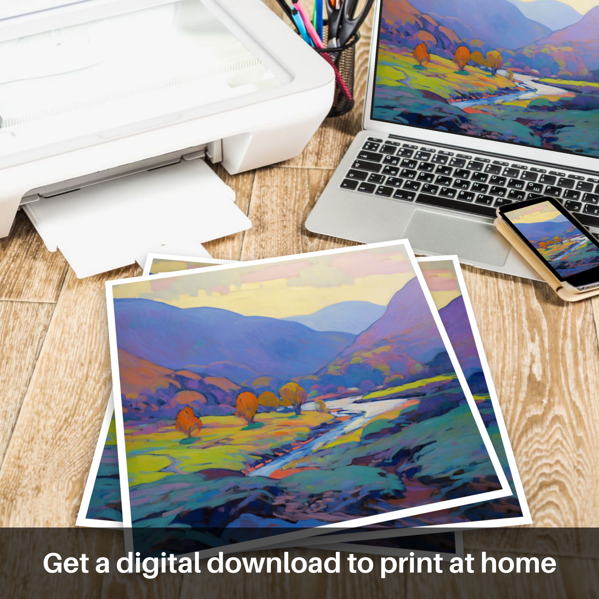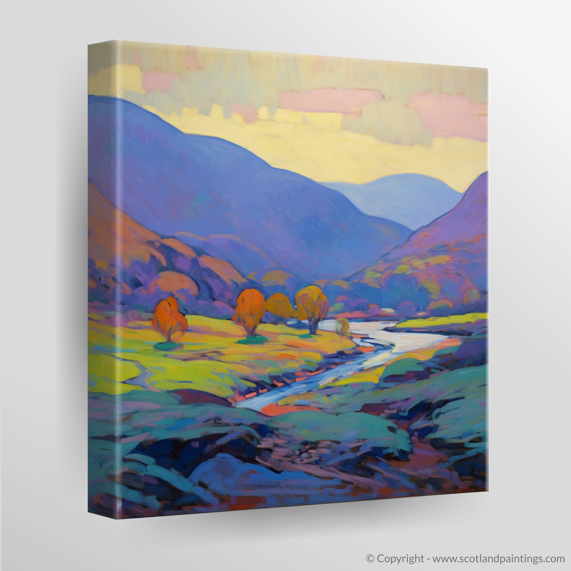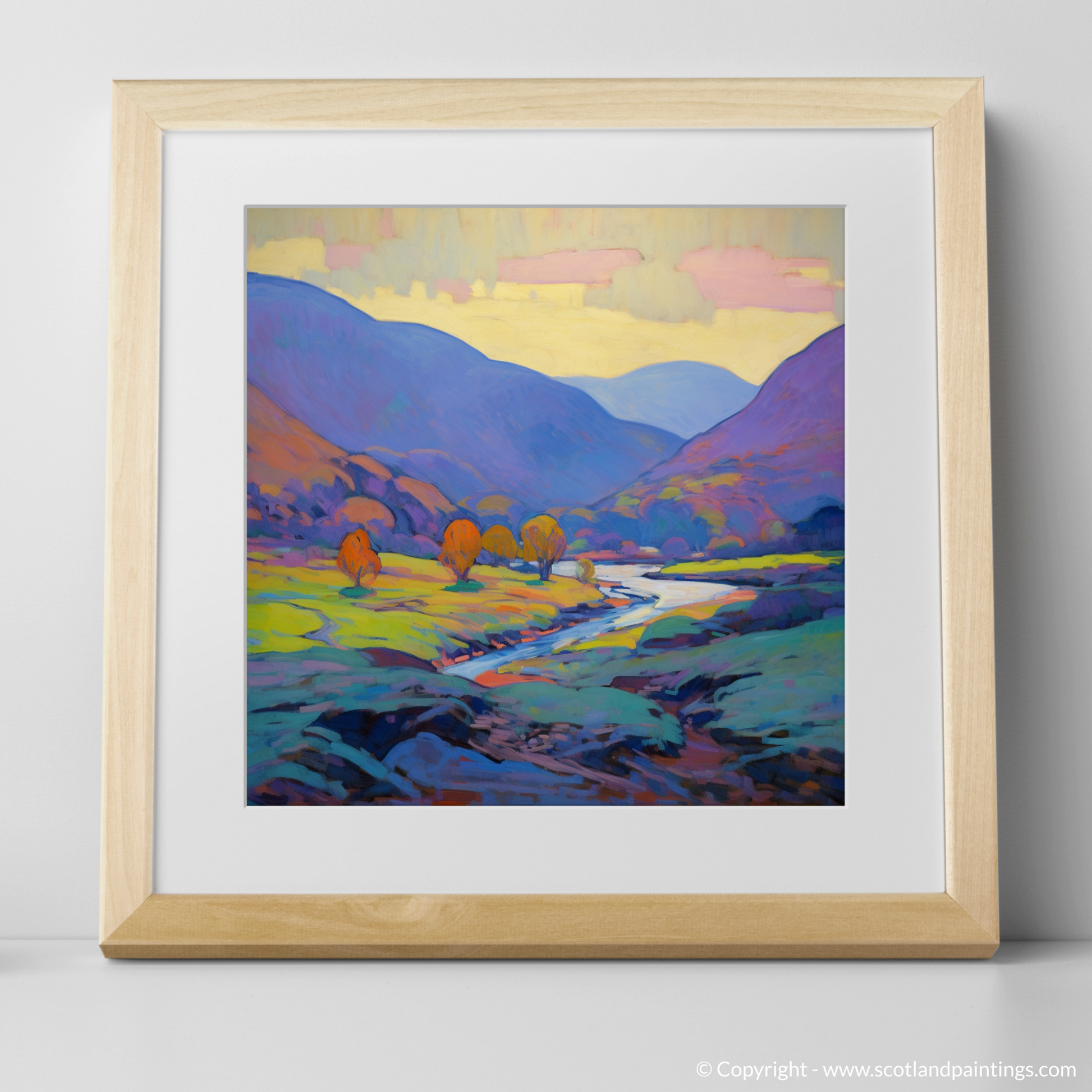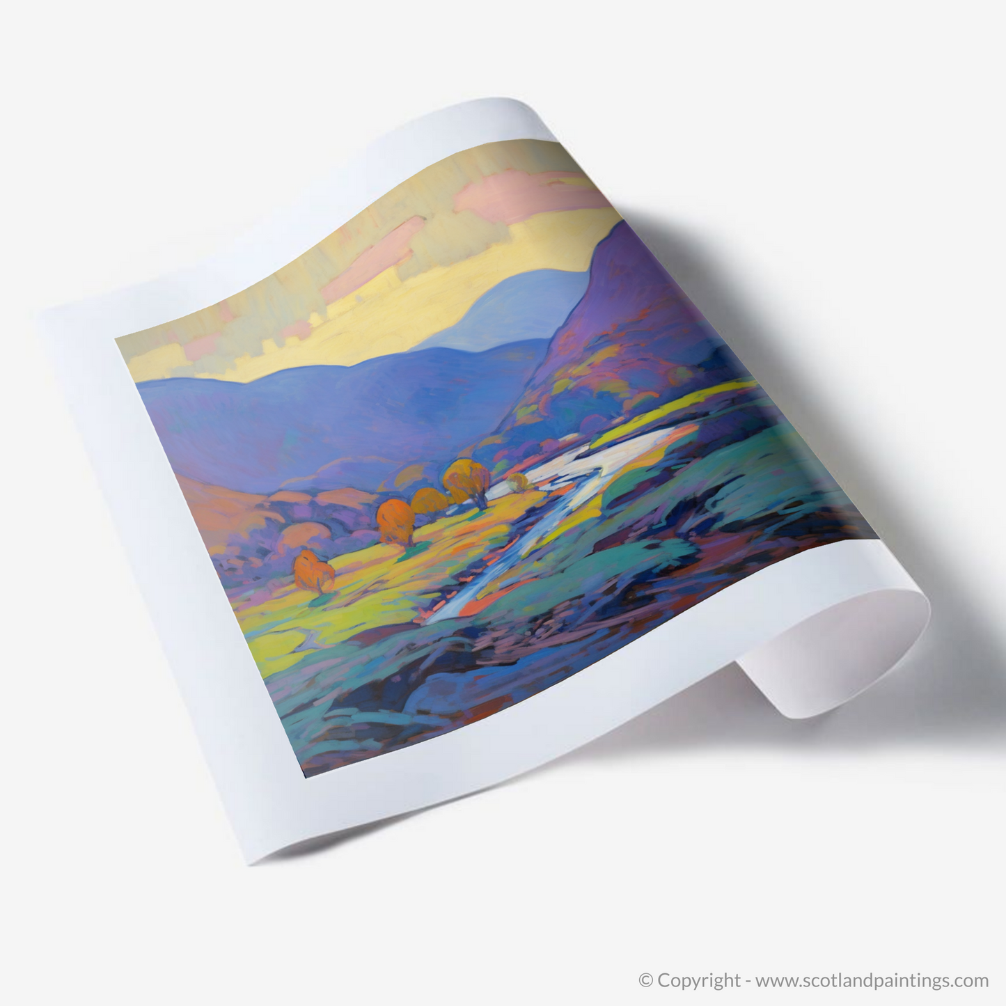 Textured strokes and bold color contrasts create a dynamic surface, luring the observer into a dance of light and movement, carrying with it the cool, crisp highland air and the soft murmur of the river. This print promises to captivate and stir the soul, offering a window to the wild, natural elegance of one of Scotland's most enchanting glens.