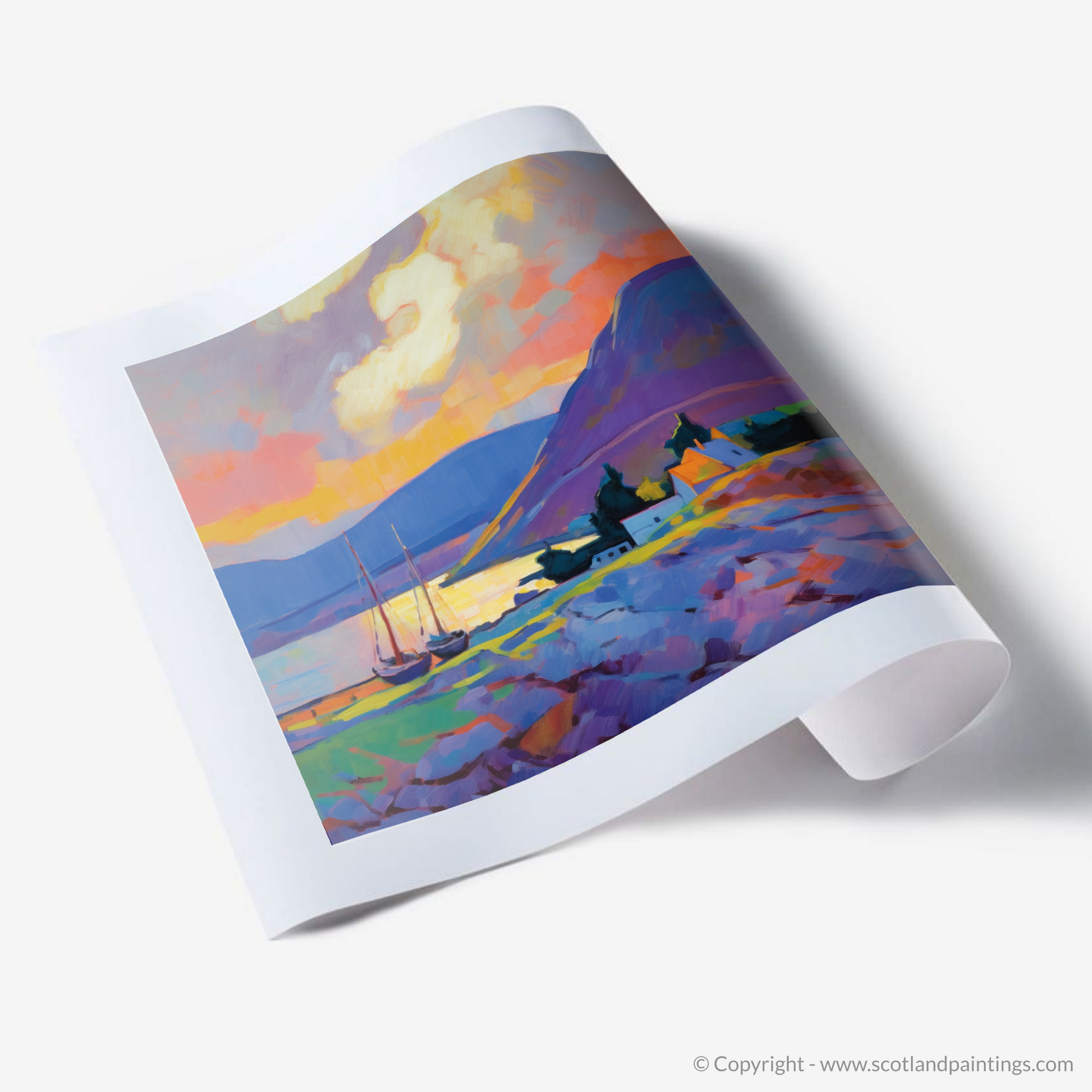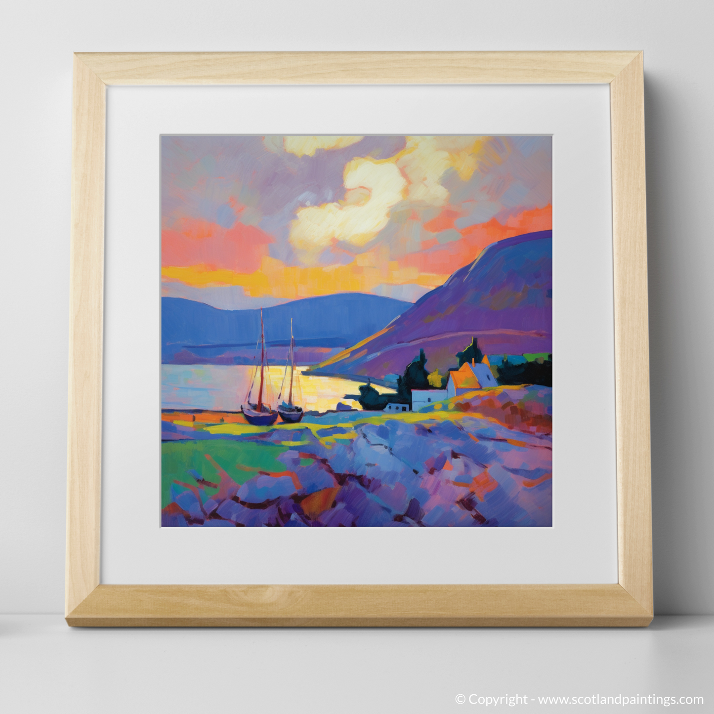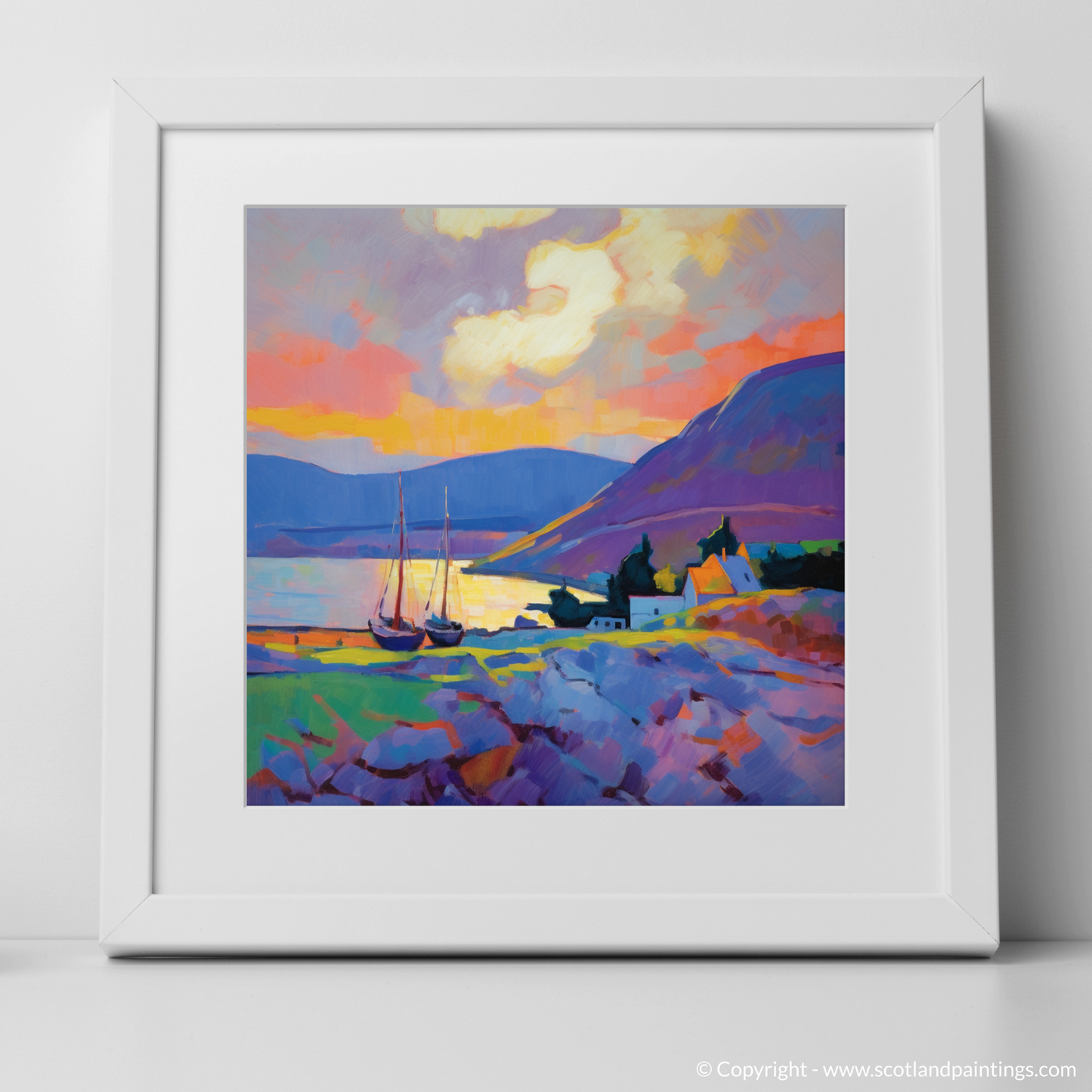 Capturing the essence of Cromarty Harbour, this exquisite piece brings the drama of a Scottish sky to life, whisking the viewer to the heart of the Highlands. The scene is vibrant with the fervour of a stormy sky; swirling clouds roll overhead in a dance of purples, blues, and fiery oranges, blanketing the scene with a dynamic, moving energy that captures the unpredictable nature of Scotland's weather.