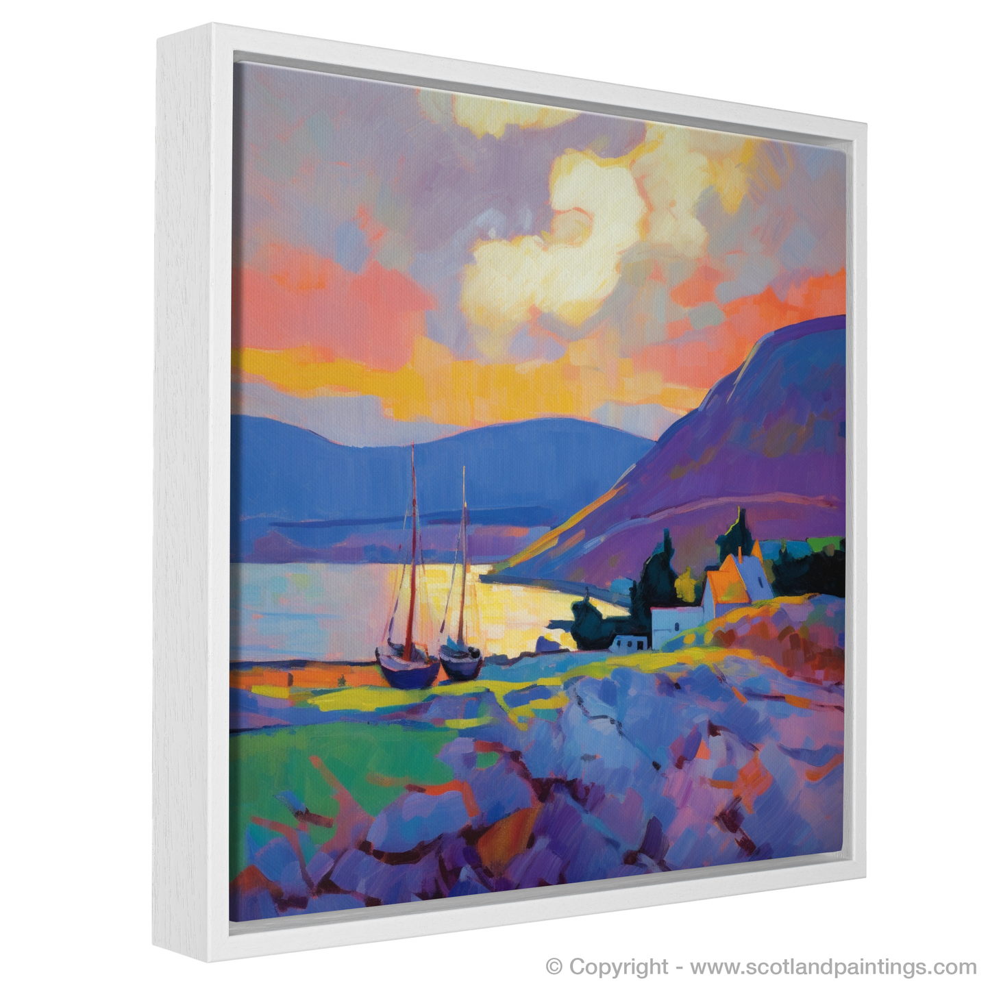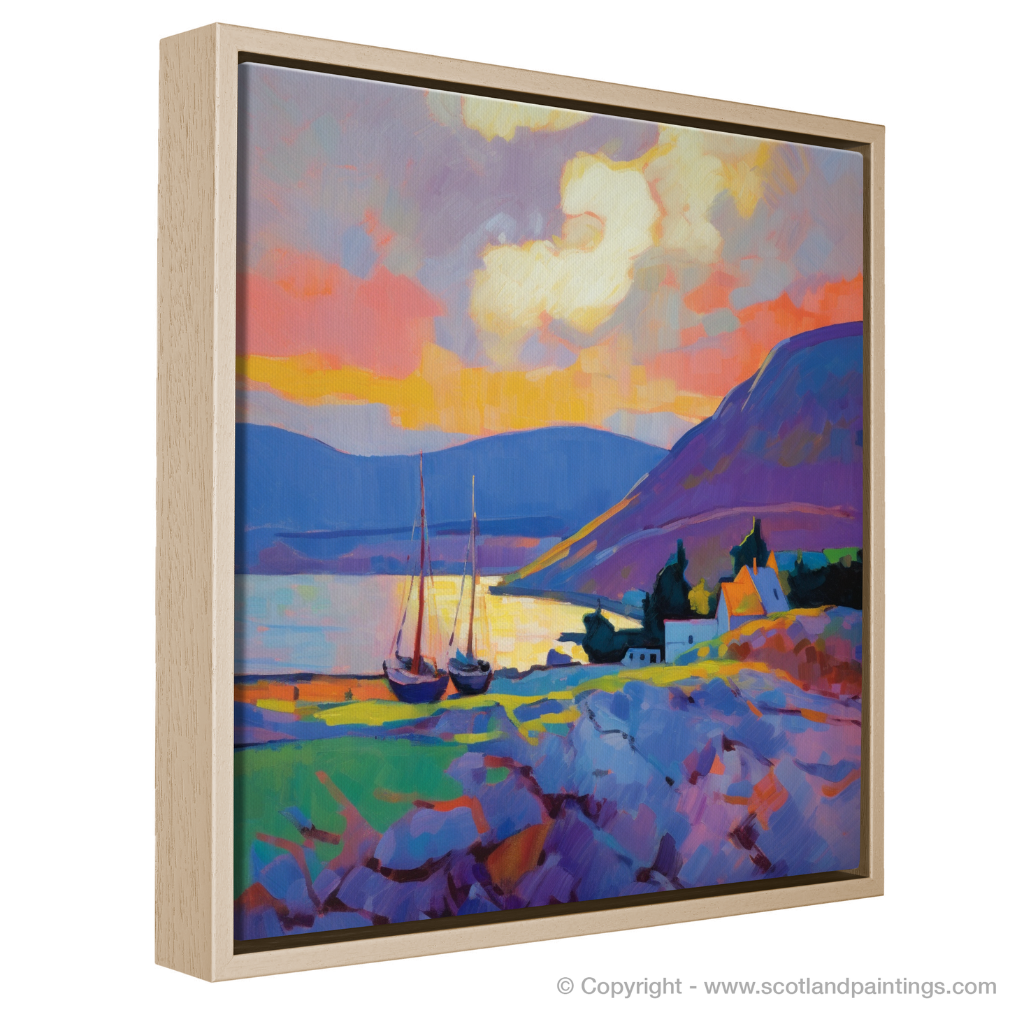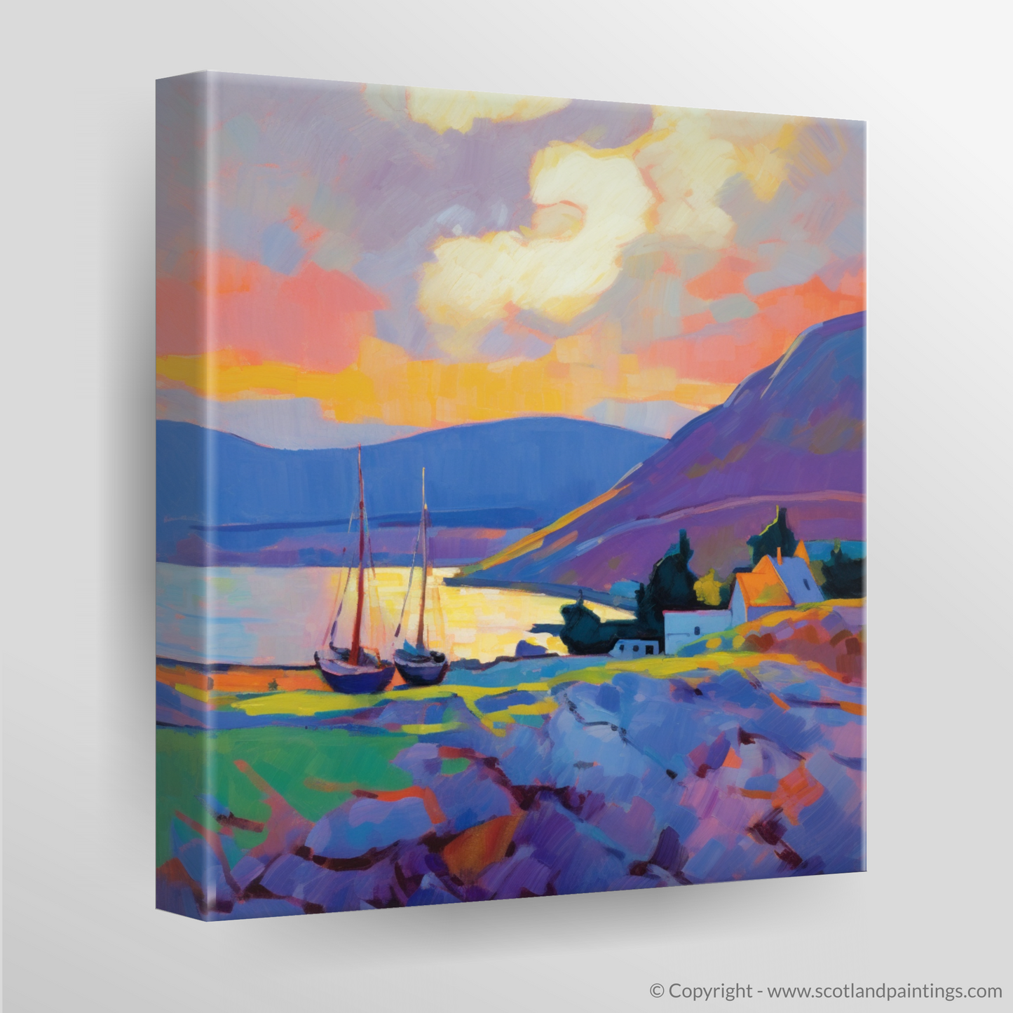 Capturing the essence of Cromarty Harbour, this exquisite piece brings the drama of a Scottish sky to life, whisking the viewer to the heart of the Highlands. The scene is vibrant with the fervour of a stormy sky; swirling clouds roll overhead in a dance of purples, blues, and fiery oranges, blanketing the scene with a dynamic, moving energy that captures the unpredictable nature of Scotland's weather.