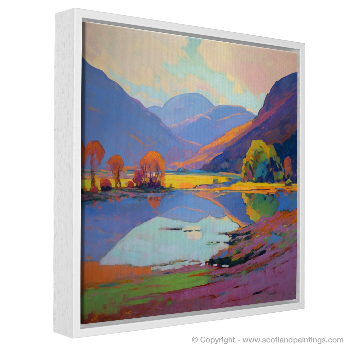 The canvas is alive with a palette of rich oranges and luminous yellows, reflecting the warmth of a fleeting sunset as it kisses the landscape. The atmosphere is redolent of calm and nostalgia, with broad, expressive brushstrokes defining the contours of the loch and the undulating hills that cradle its waters. Wisps of magenta and blush tinge the sky, lending it an ethereal glow that harmonises with the reflective sheen on the water's surface.