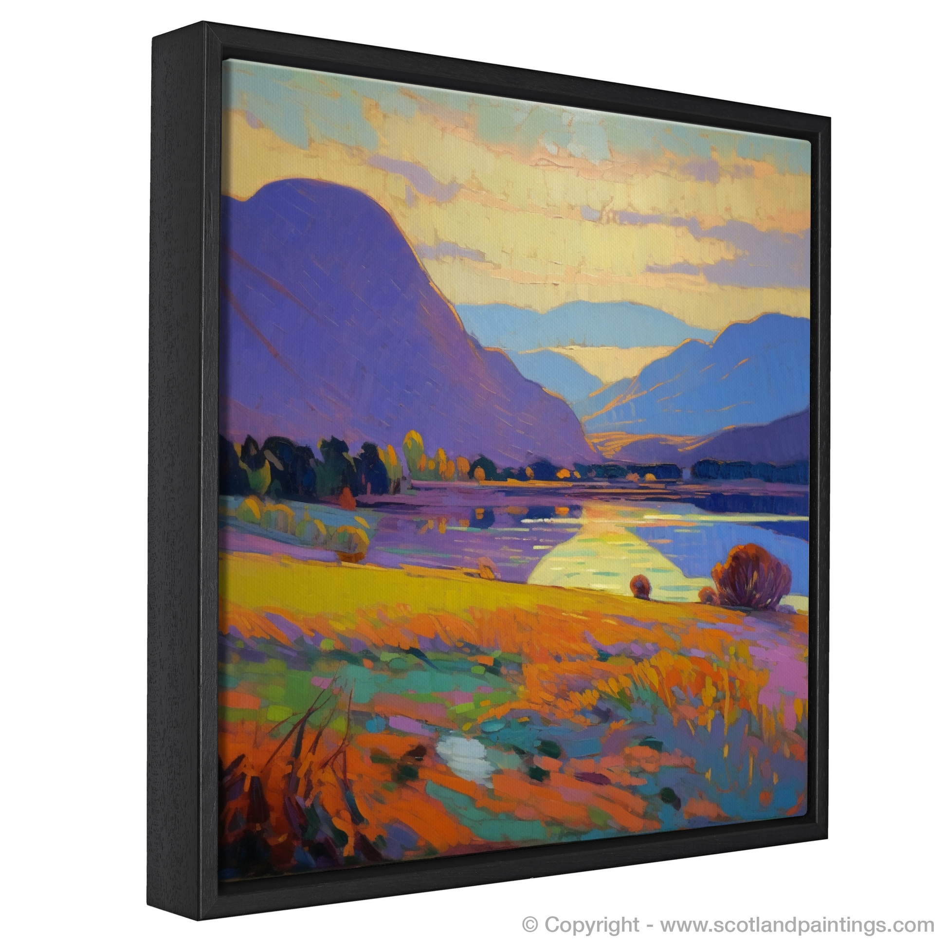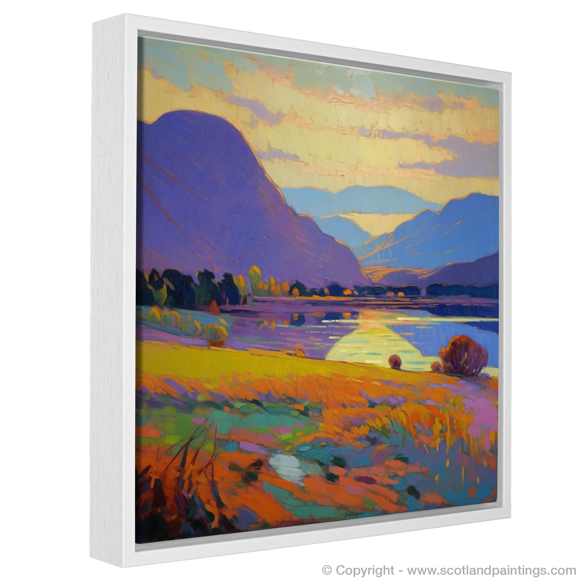 Awash with the serene palette of dusk, the print showcases a dance of purples and blues across the majestic hills that guard the loch. The waters reflect the pastel hues of the twilight sky with occasional strokes of gold where the sun kisses the rippled surface, creating a path of light that leads the eye through the composition.