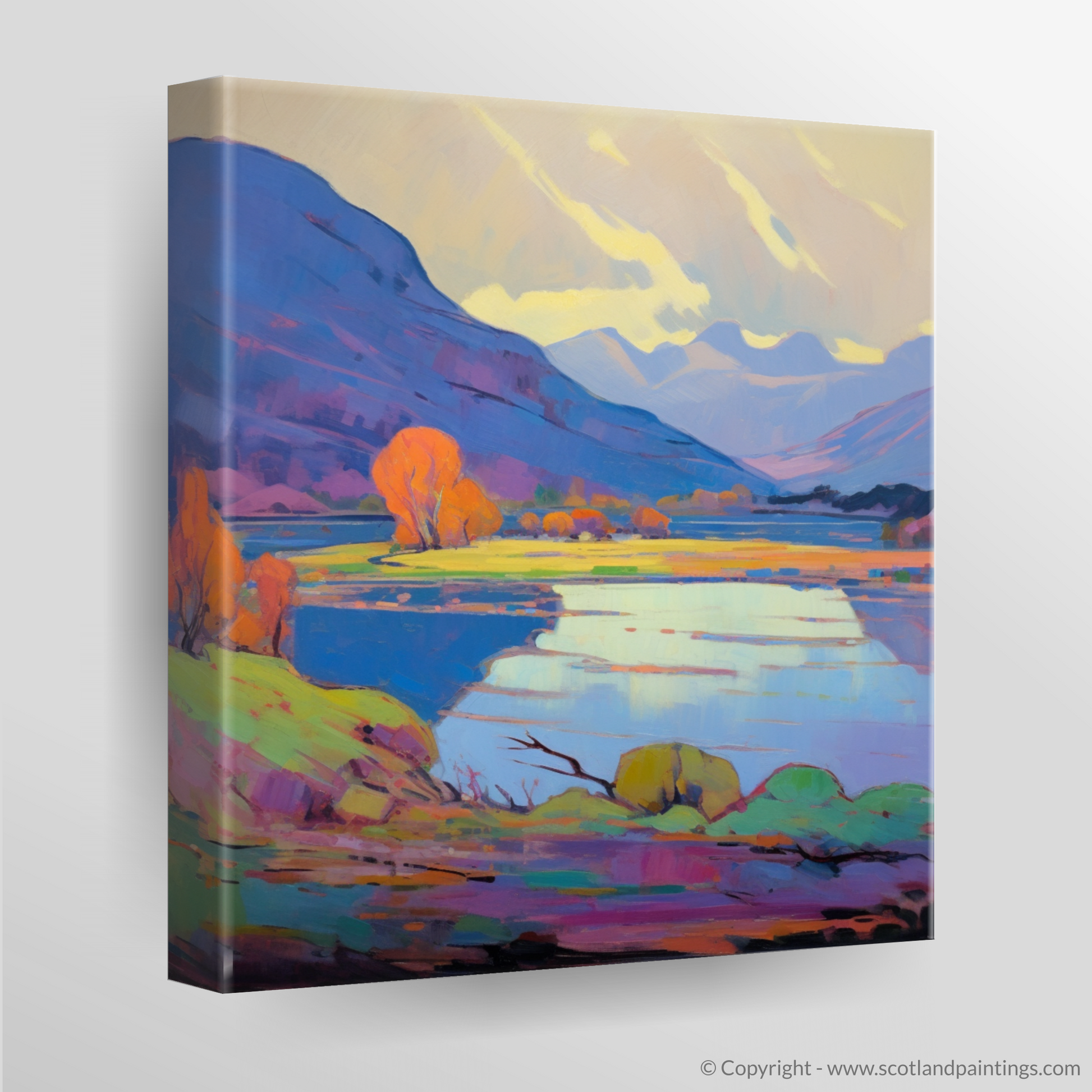 The painter's brushwork imbues the calm surface of the loch with gentle ripples, reflecting a kaleidoscope of dawn or dusk light. Shades of purples, blues, and pinks skate across the watery canvas, dancing between the realistic and the dreamlike.