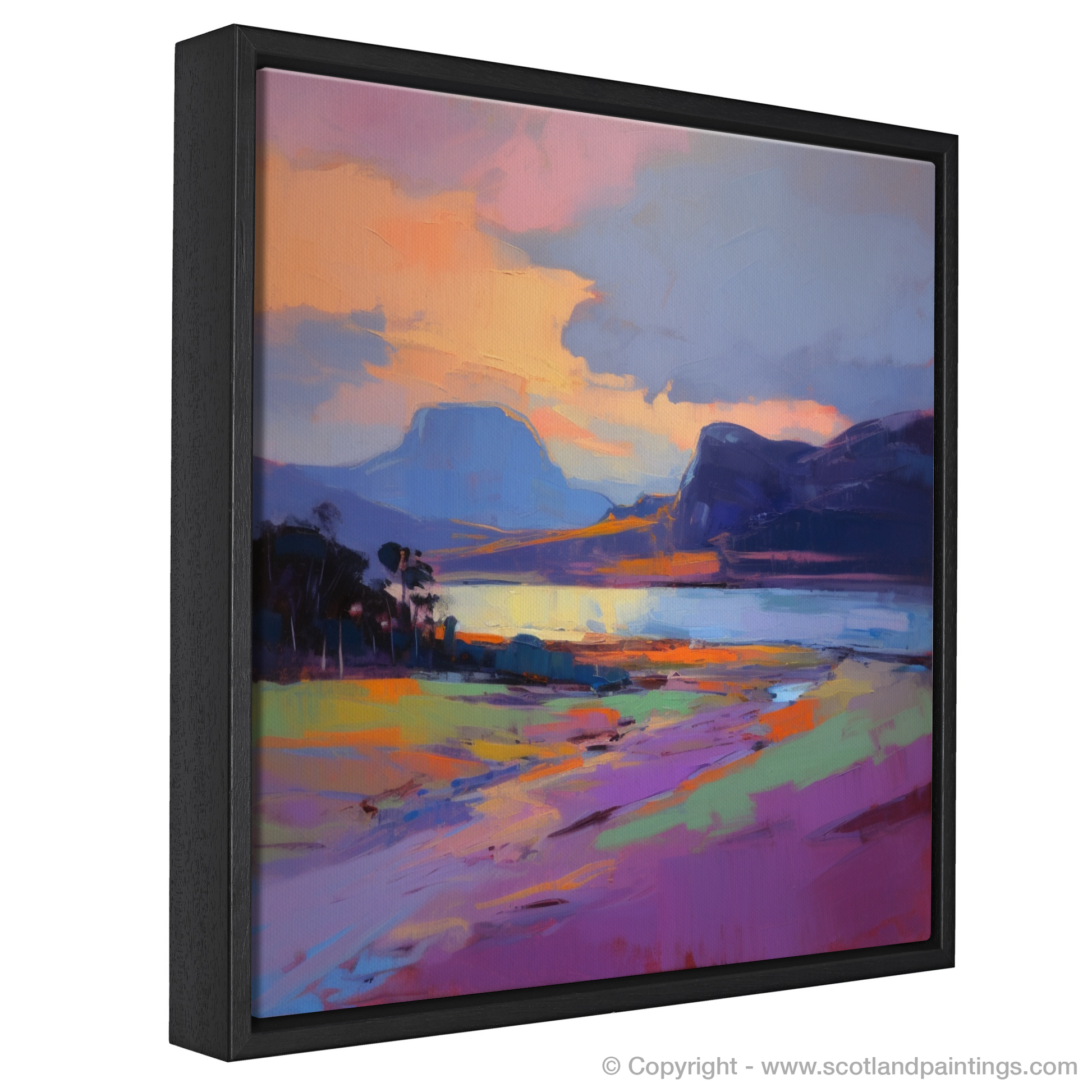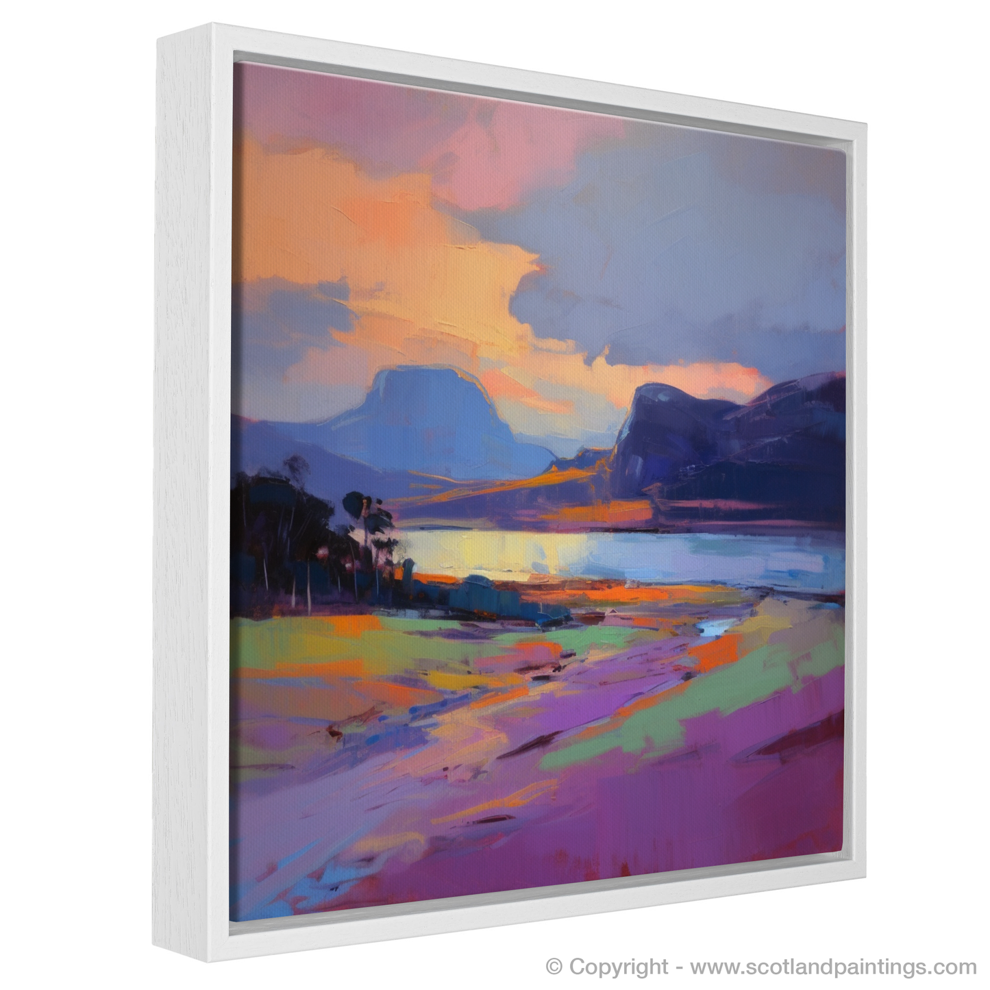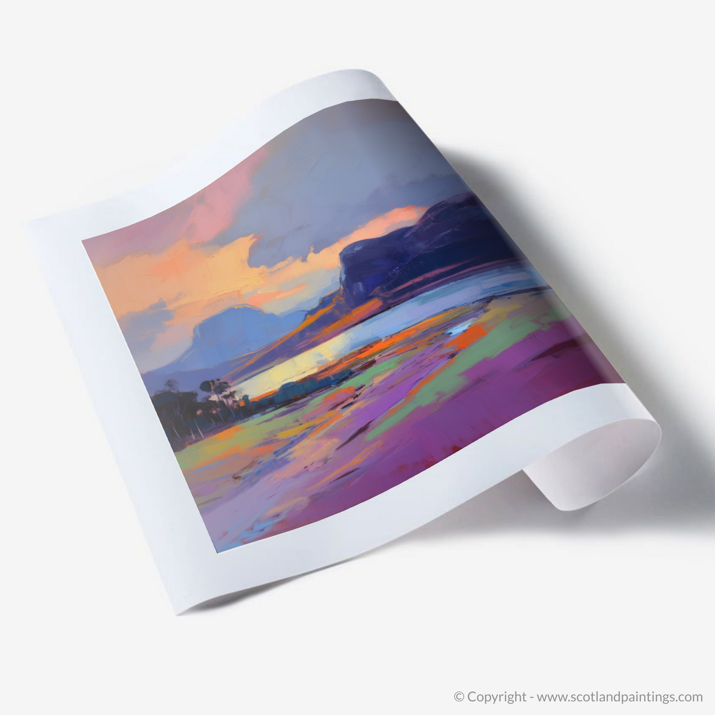On the shore, the remnants of daylight dance upon the water's surface, creating shimmering reflections that seem to defy the encroaching evening. The expressive lines and bold colours give a sense of nature's dynamic performance at the end of the day, offering viewers a stirring testament to the untamed beauty found along Scotland's coastal landscapes.