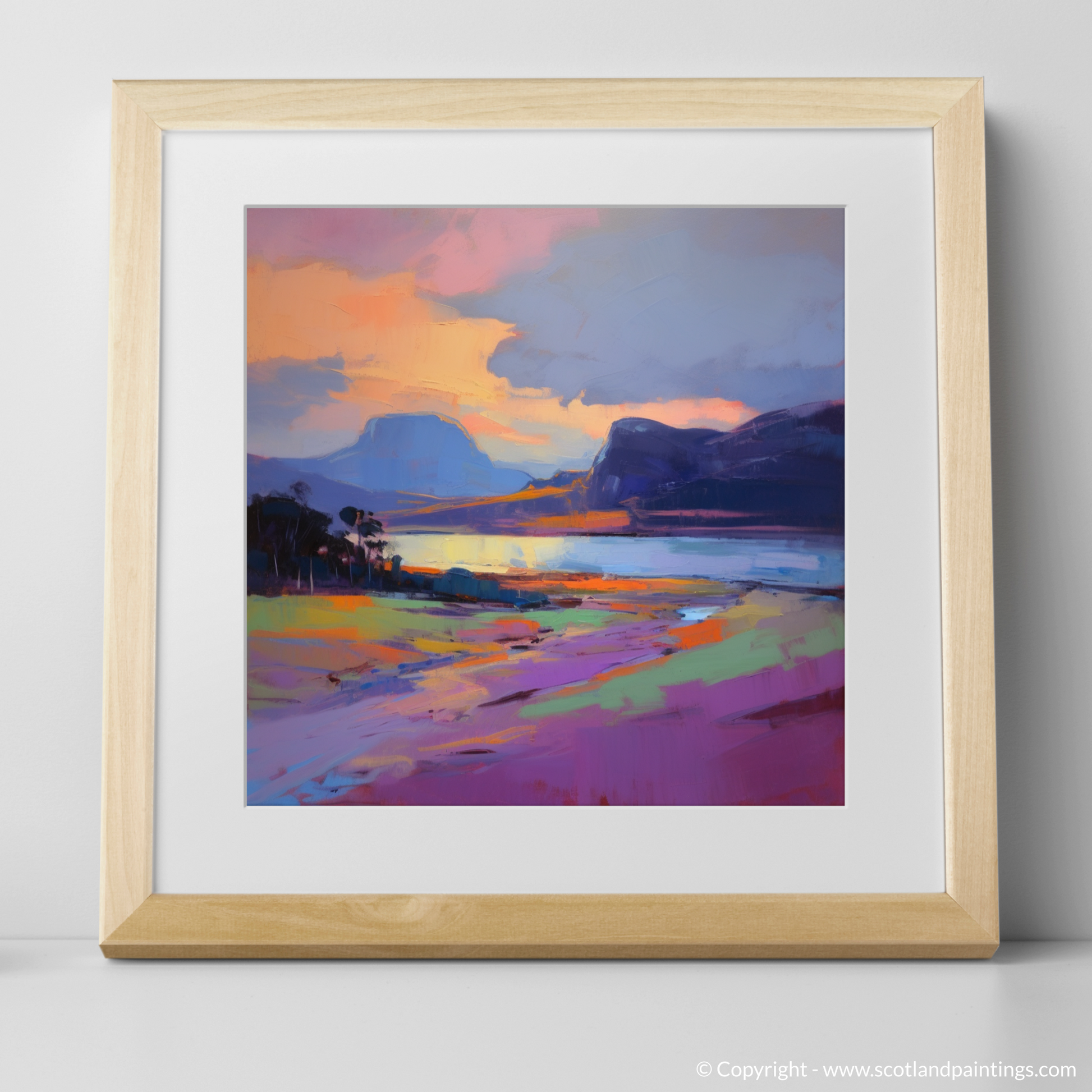 Immerse yourself in the vibrant hues of Kiloran Bay at the day's end with this evocative expressionist print from our 'Scottish Beaches' collection. The artwork captures the raw, emotional essence of sunset, as the sky's canvas is washed in a glorious fusion of warm oranges, pinks, and purples, contrasting eloquently against the cool blues and silhouetted landforms.
