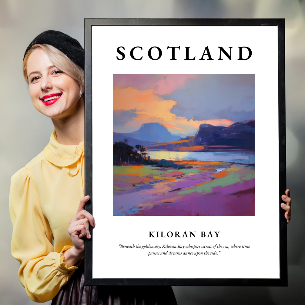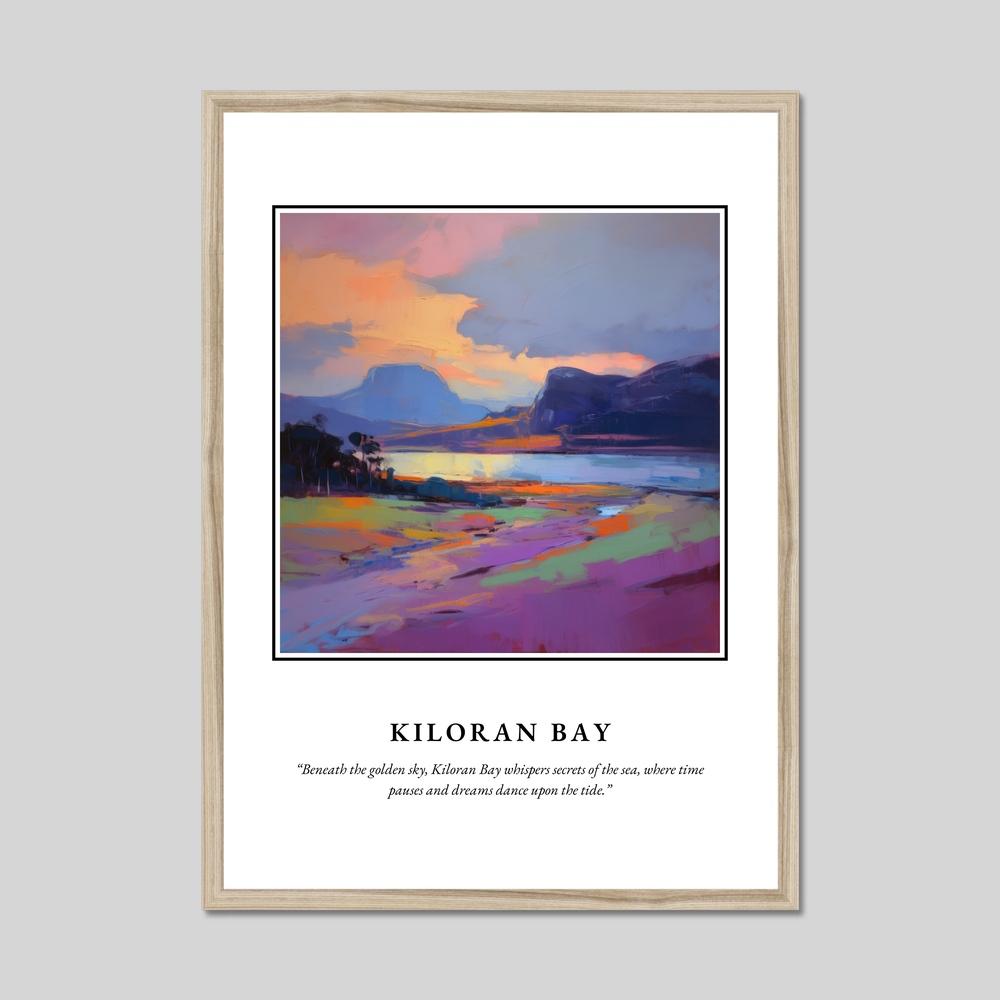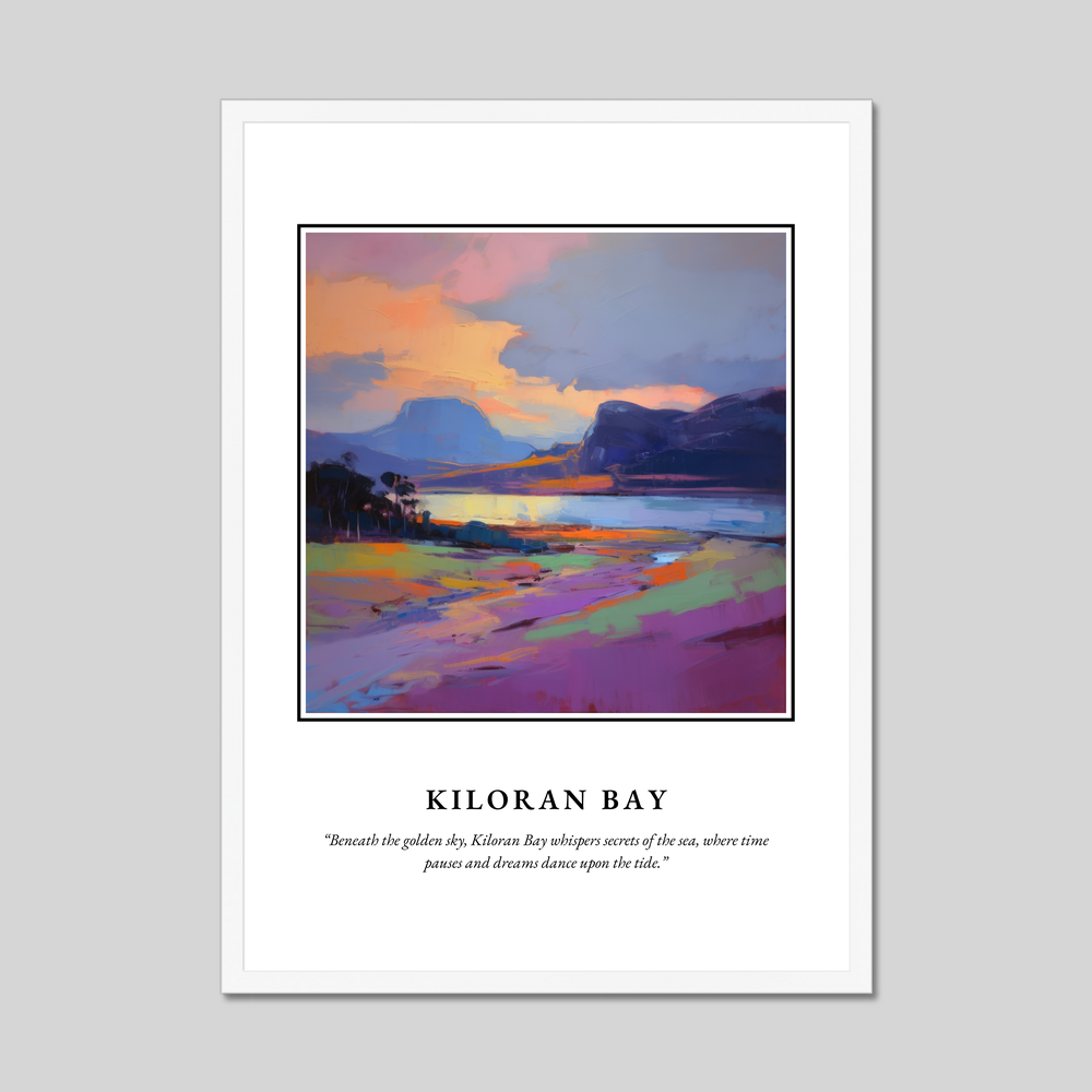 At the heart of the poster is a mesmerising expressionist painting of Kiloran Bay, where vibrant hues blend harmoniously to portray the bay’s tranquil beauty. The brushstrokes sweep across the canvas, capturing the ethereal light of a Scottish sunset that casts a dreamlike glow over the rich landscape. Beneath the painting, the quote “Beneath the golden sky, Kiloran Bay whispers secrets of the sea, where time pauses and dreams dance upon the tide,” imbues the piece with a sense of poetic wonder, resonating with anyone who has ever been enchanted by the sea.