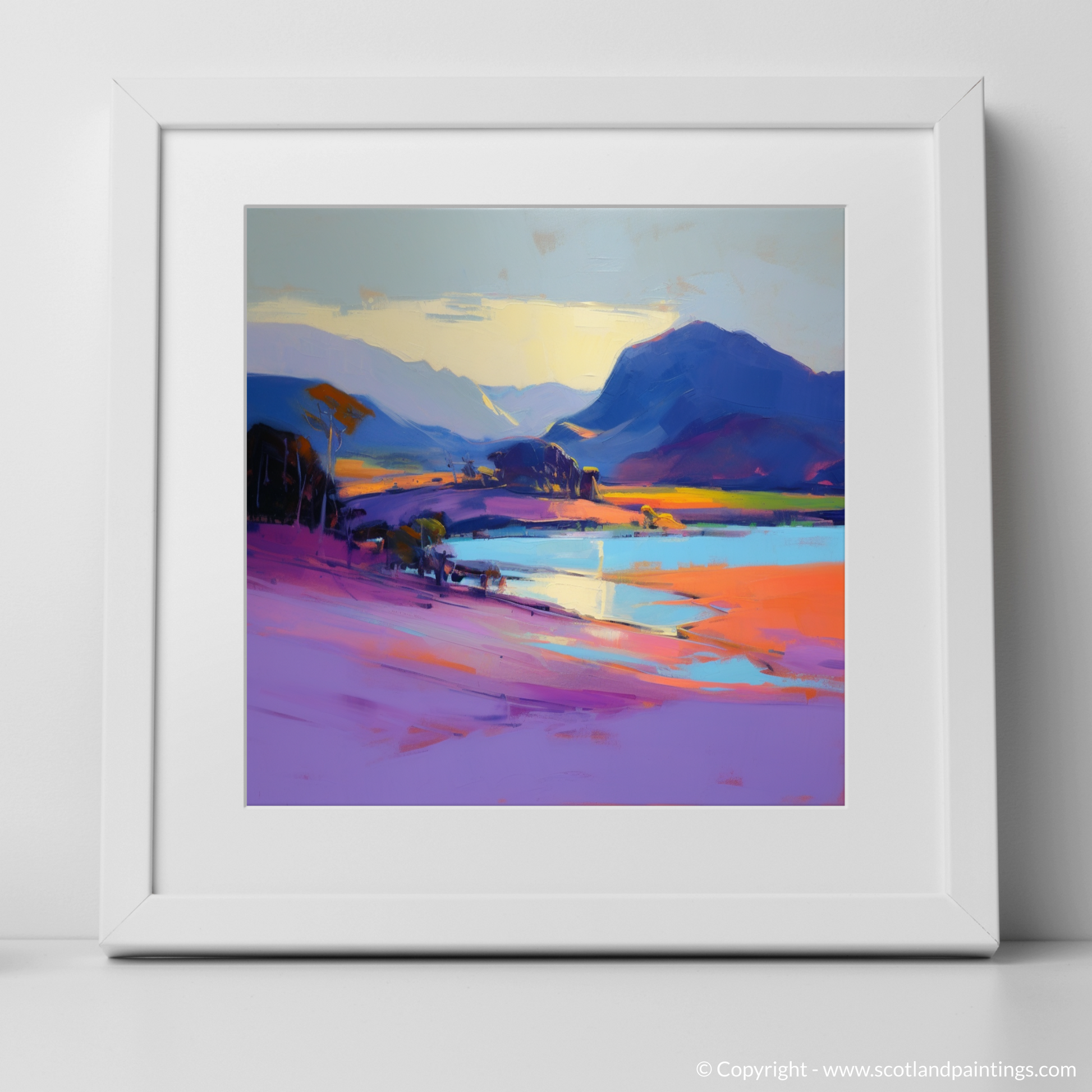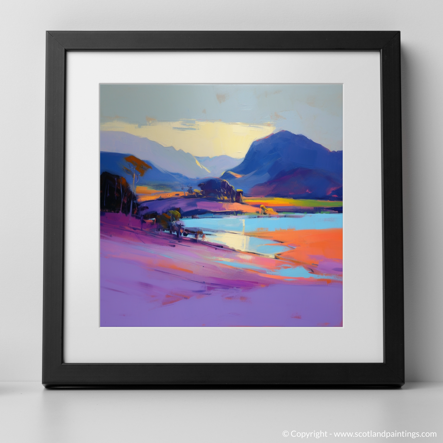 Immerse yourself in the vibrant hues and passionate brushstrokes of a stunning print that captures the raw beauty of Kiloran Bay at the cusp of nightfall. This expressive piece sets the scene with an evocative display of rich purples, fiery oranges, and soothing blues, painting an image of a Scottish beach as the sun makes its majestic descent.