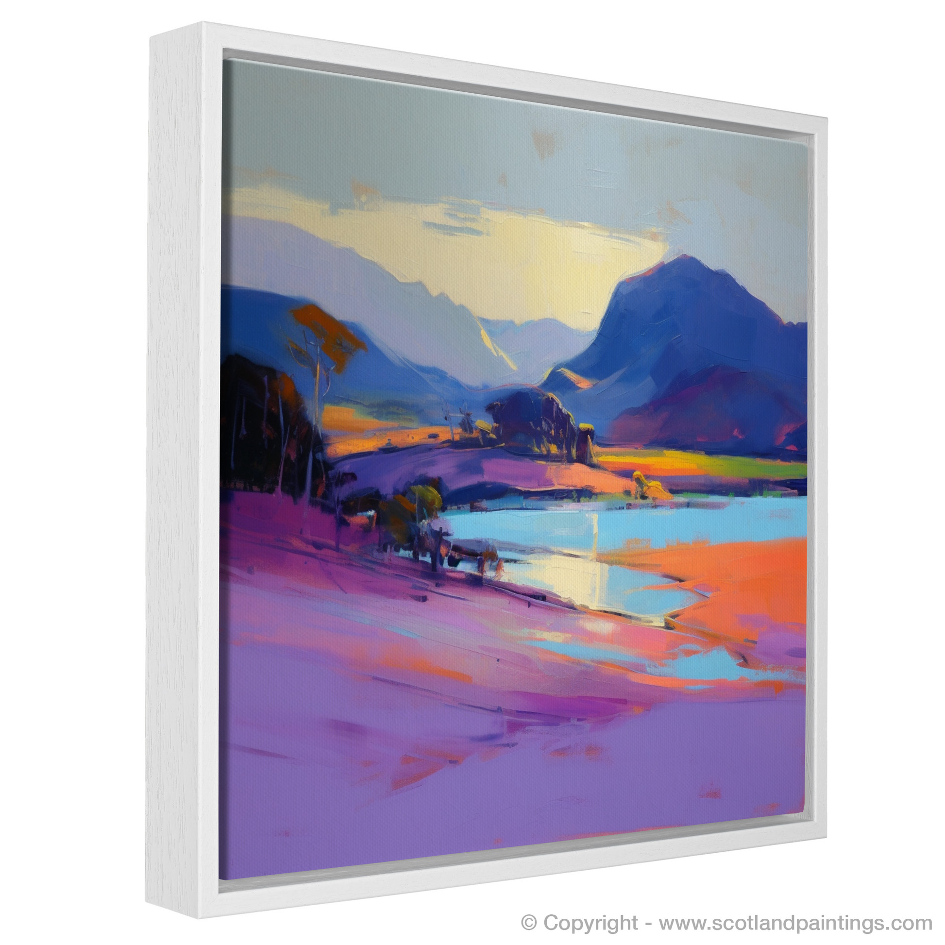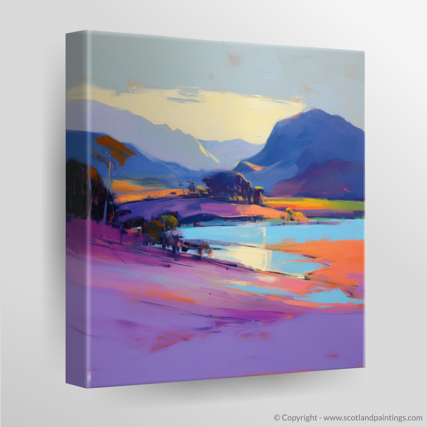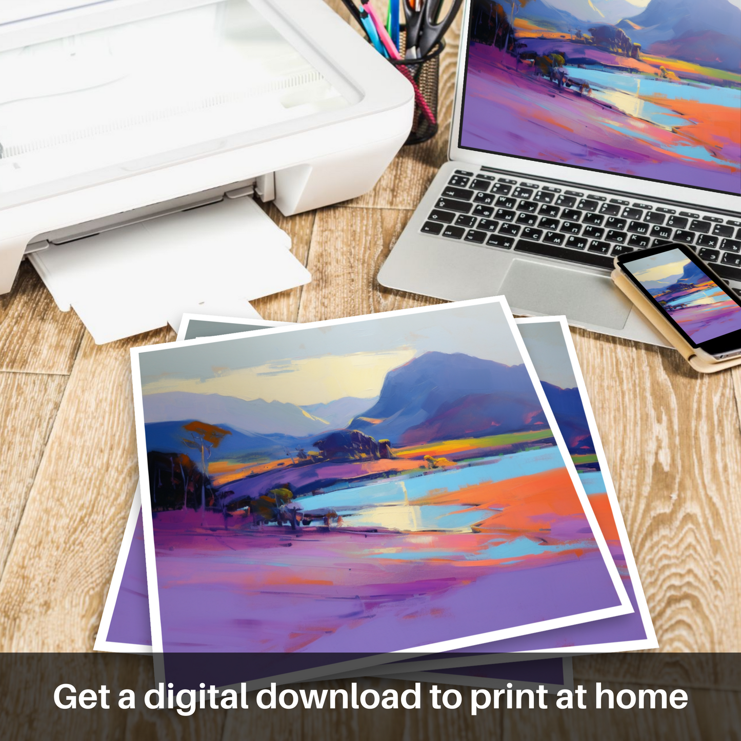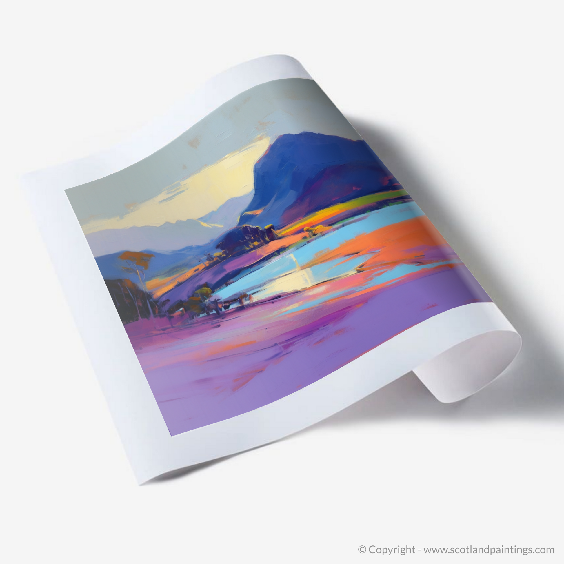 In the middle distance, rolling hills emerge in silhouettes softened by the emotive power of expressionism, while scattered trees are etched against the encroaching dusk, their forms swaying to an unseen breeze—a testament to the untamed spirit of the Scottish landscape.