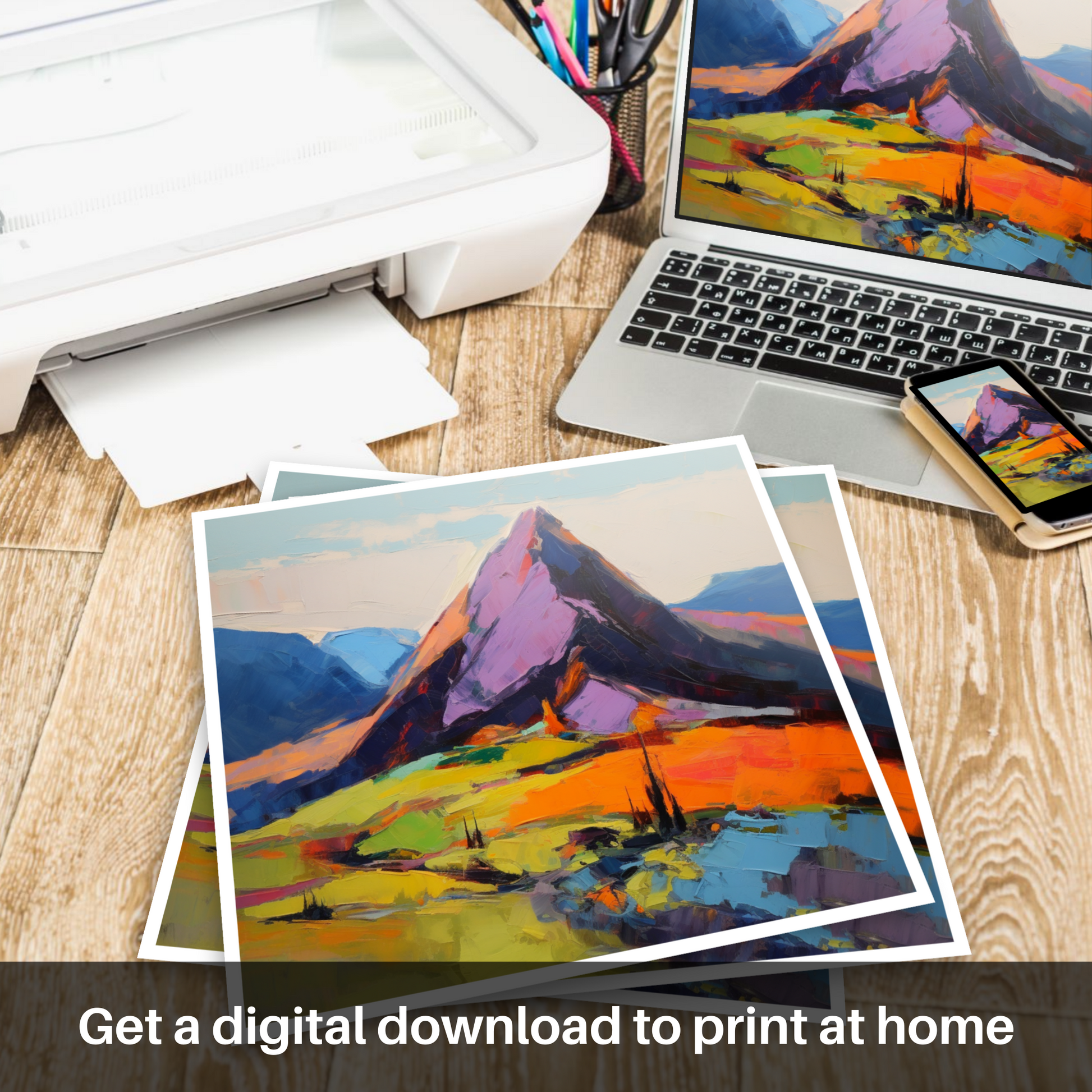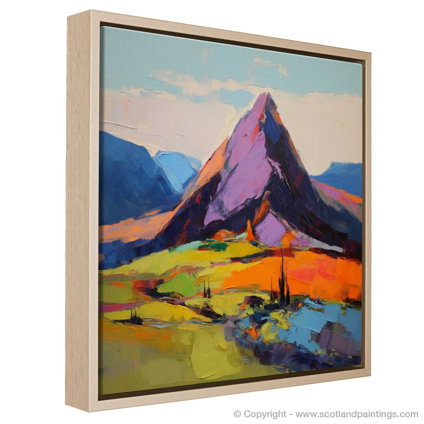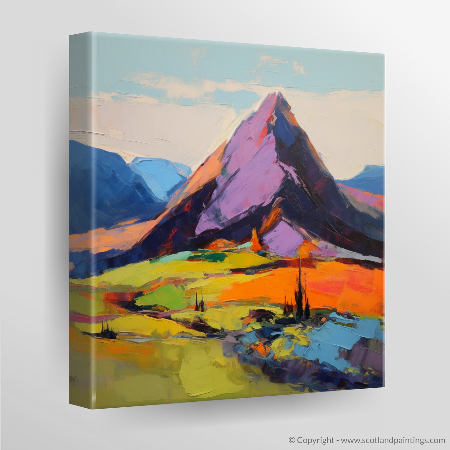 Sweep your gaze across the vivid and dynamic landscape that evokes the untamed beauty of Cairn Gorm, one of Scotland's most majestic Munros. This expressionist piece captures the viewer with its bold and robust brushstrokes that dance across the canvas, constructing a stirring visual poem of the highlands. The palette is a symphony of striking colours where intense oranges and fiery reds melt into the lush greens and blues, portraying the mountain's presence as both foreboding and inviting.