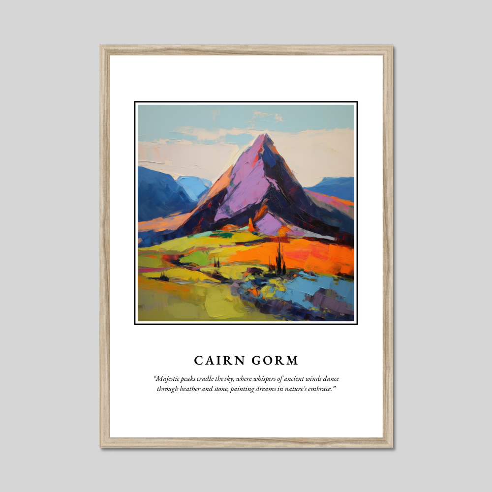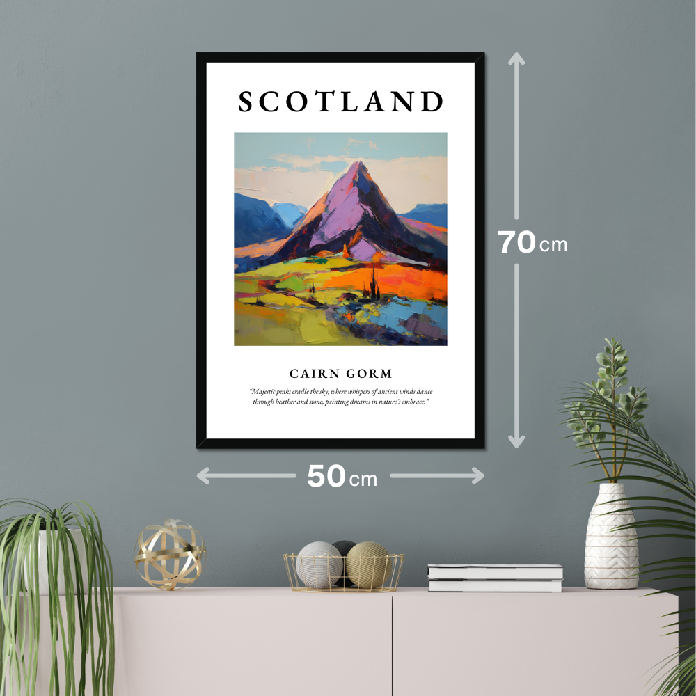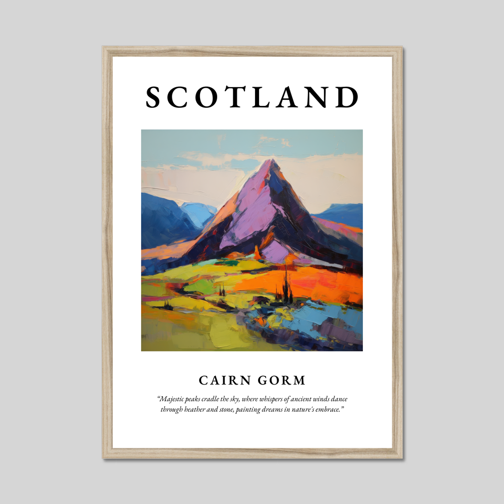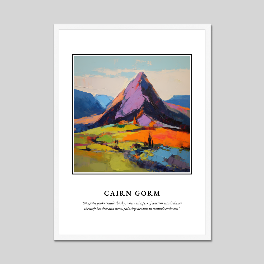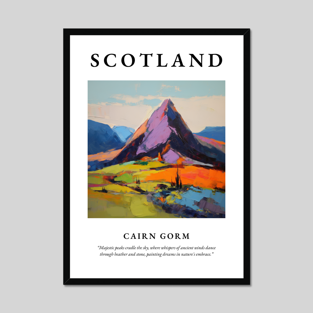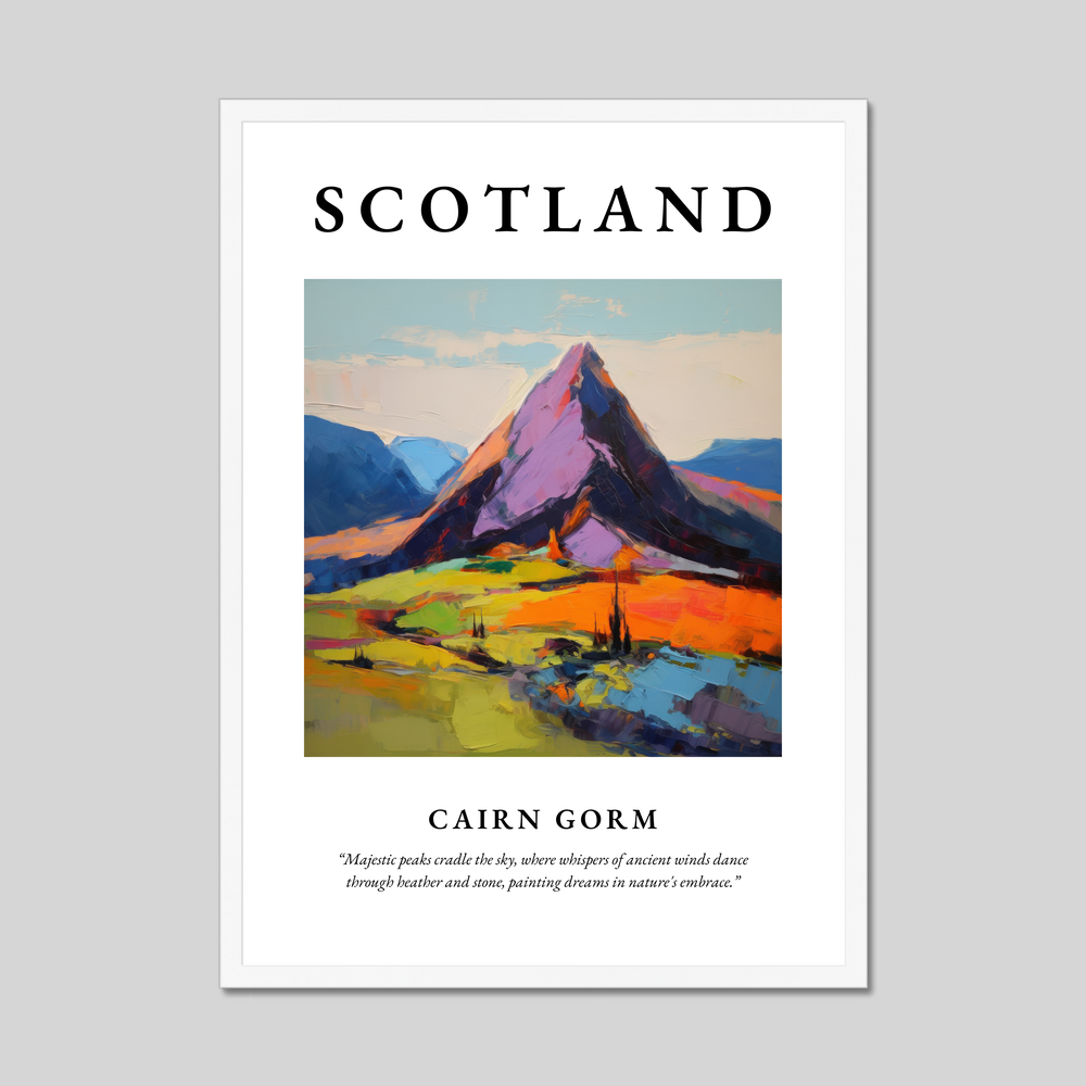 Available in elegant black, classic white, or a natural wood-effect frame, this poster seamlessly complements any décor style. The word “SCOTLAND” stands proudly at the top in bold lettering, inviting you to delve deeper into the beauty below. The painting, filled with vibrant colours and dynamic brushstrokes, vividly presents Cairn Gorm's grandeur. Beneath the artwork, the evocative quote, “Majestic peaks cradle the sky, where whispers of ancient winds dance through heather and stone, painting dreams in nature's embrace,” captures the spirit of the Scottish wilderness.