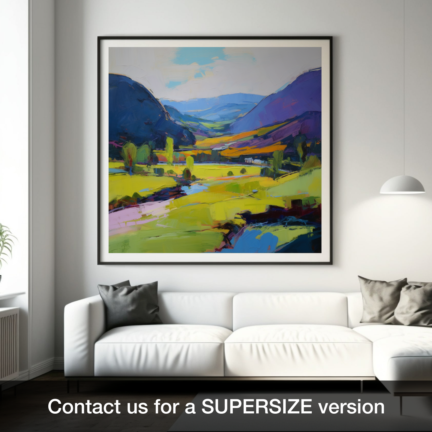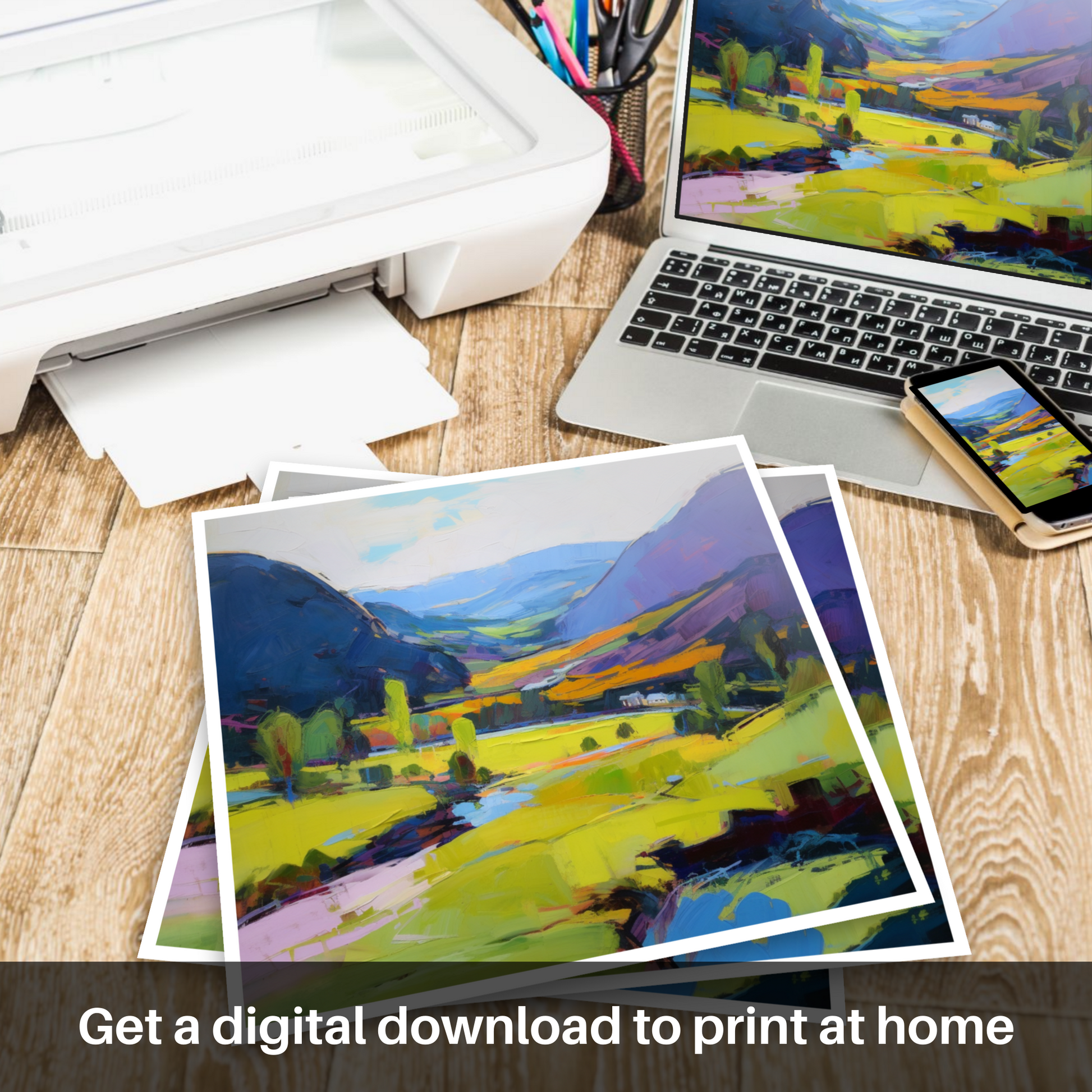 Immerse yourself in the vibrant hues and bold brushstrokes of our captivating Glen Roy-inspired print, an expressionist interpretation of the Scottish Highlands at the peak of summertime. The artwork exudes the raw beauty and dramatic contrasts inherent to the region, with a focus on the interaction of light and colour that breathes life into the landscape.