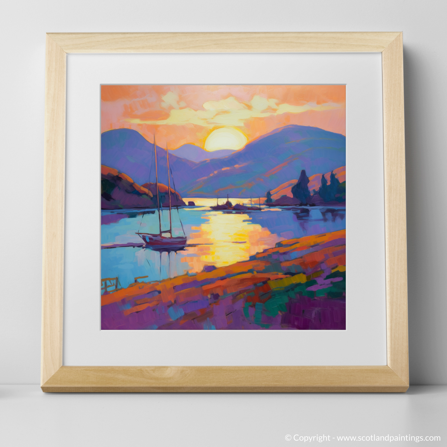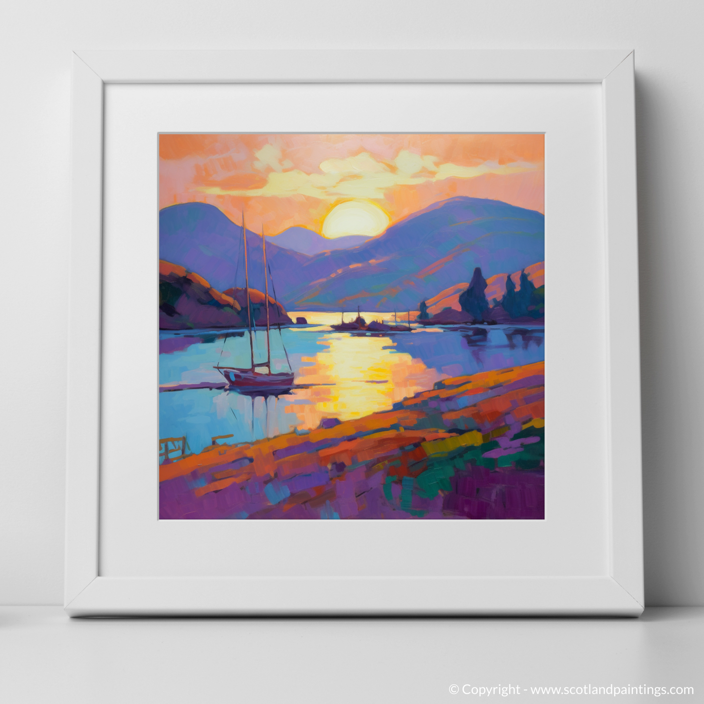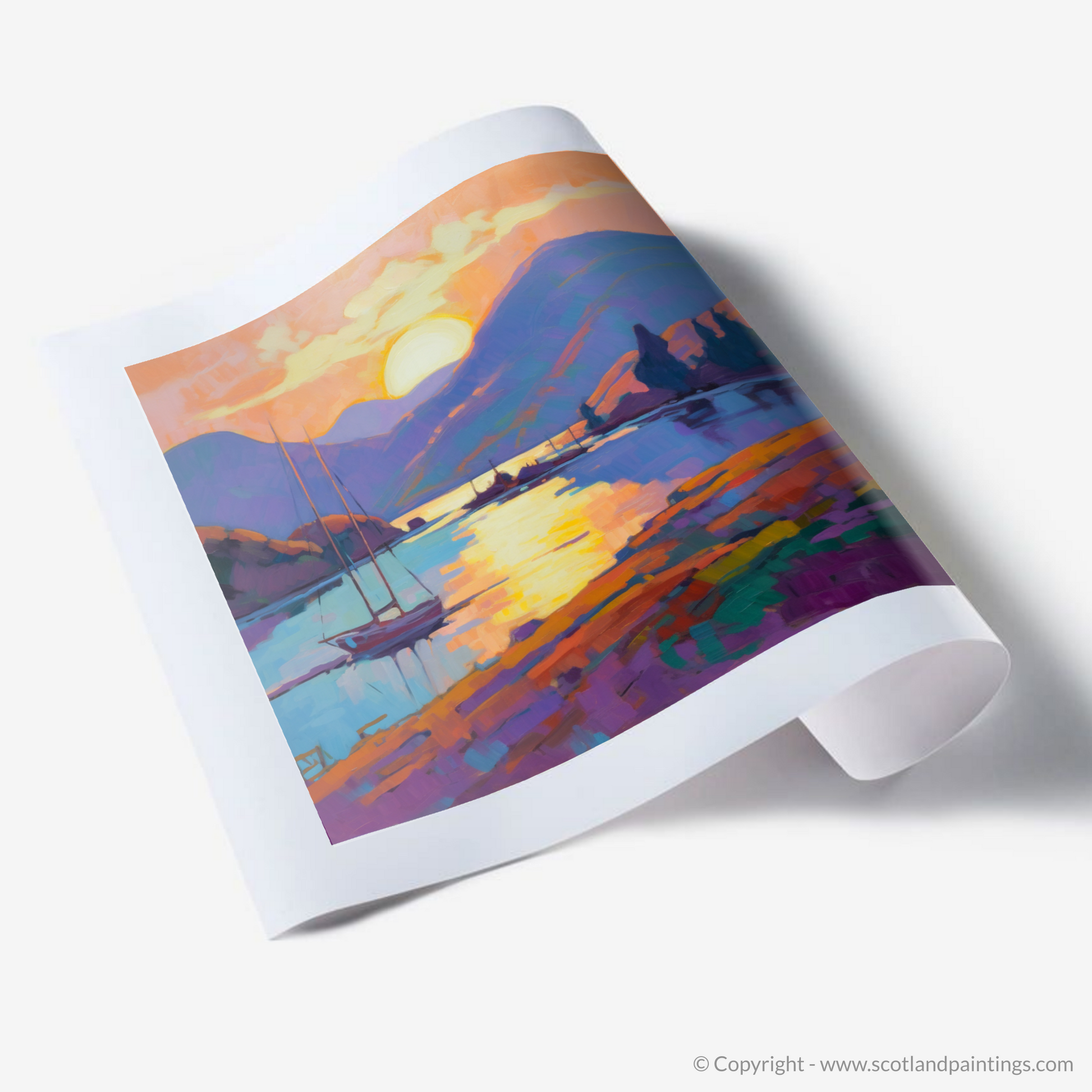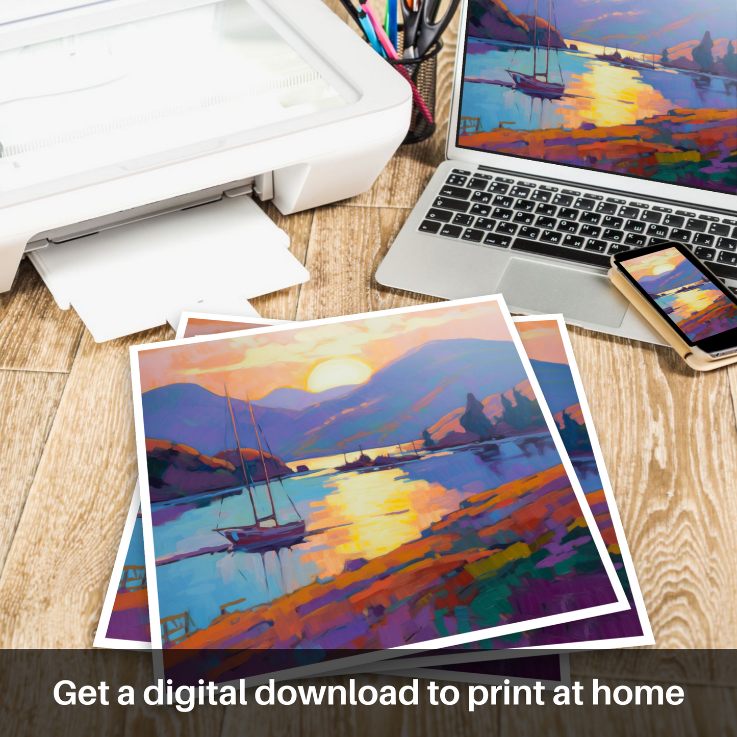 As the sun dips towards the horizon, casting a warm glow over Balmaha Harbour, this enchanting print captures the essence of a tranquil Scottish evening. With an impressionistic touch, the scene is illuminated by the waning light of day, giving life to the rich purples, vibrant corals, and luminous yellows that dance across the canvas.