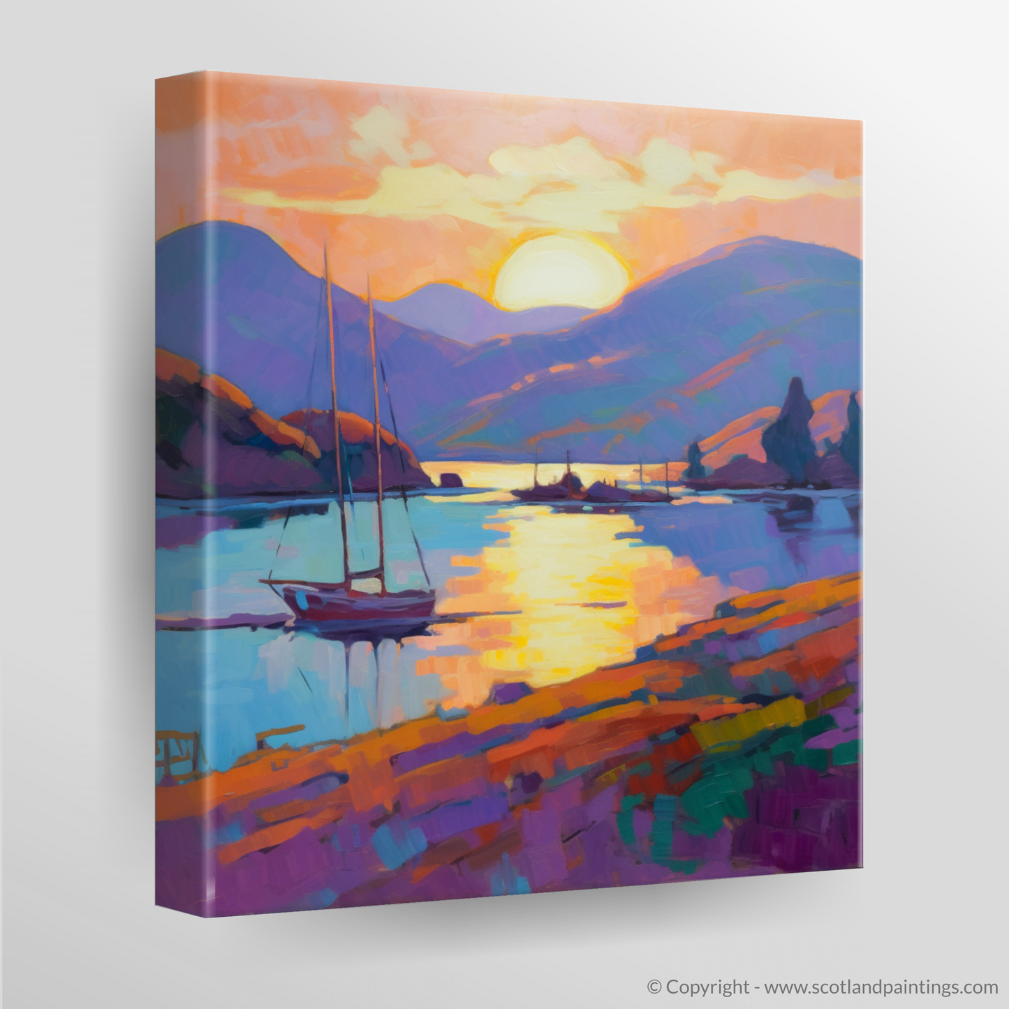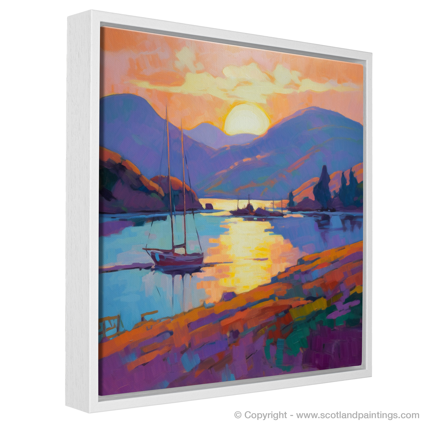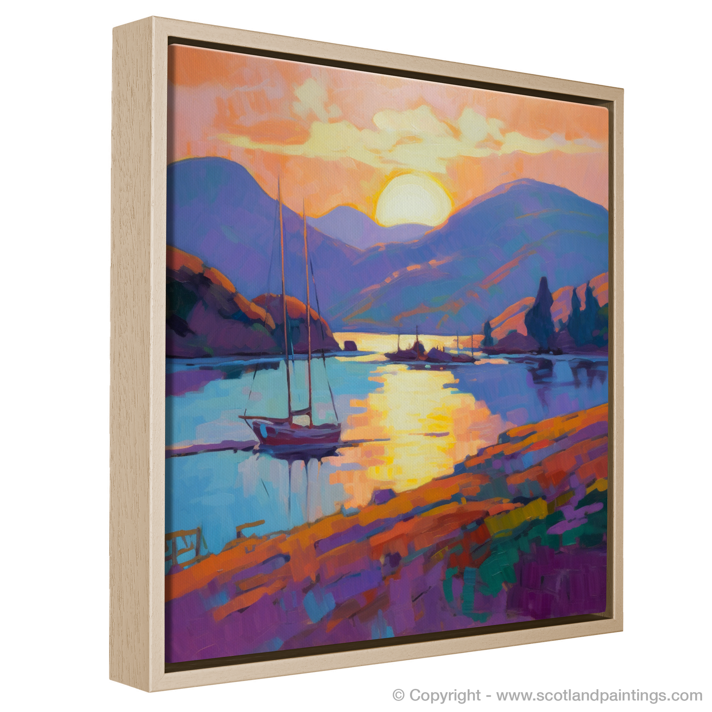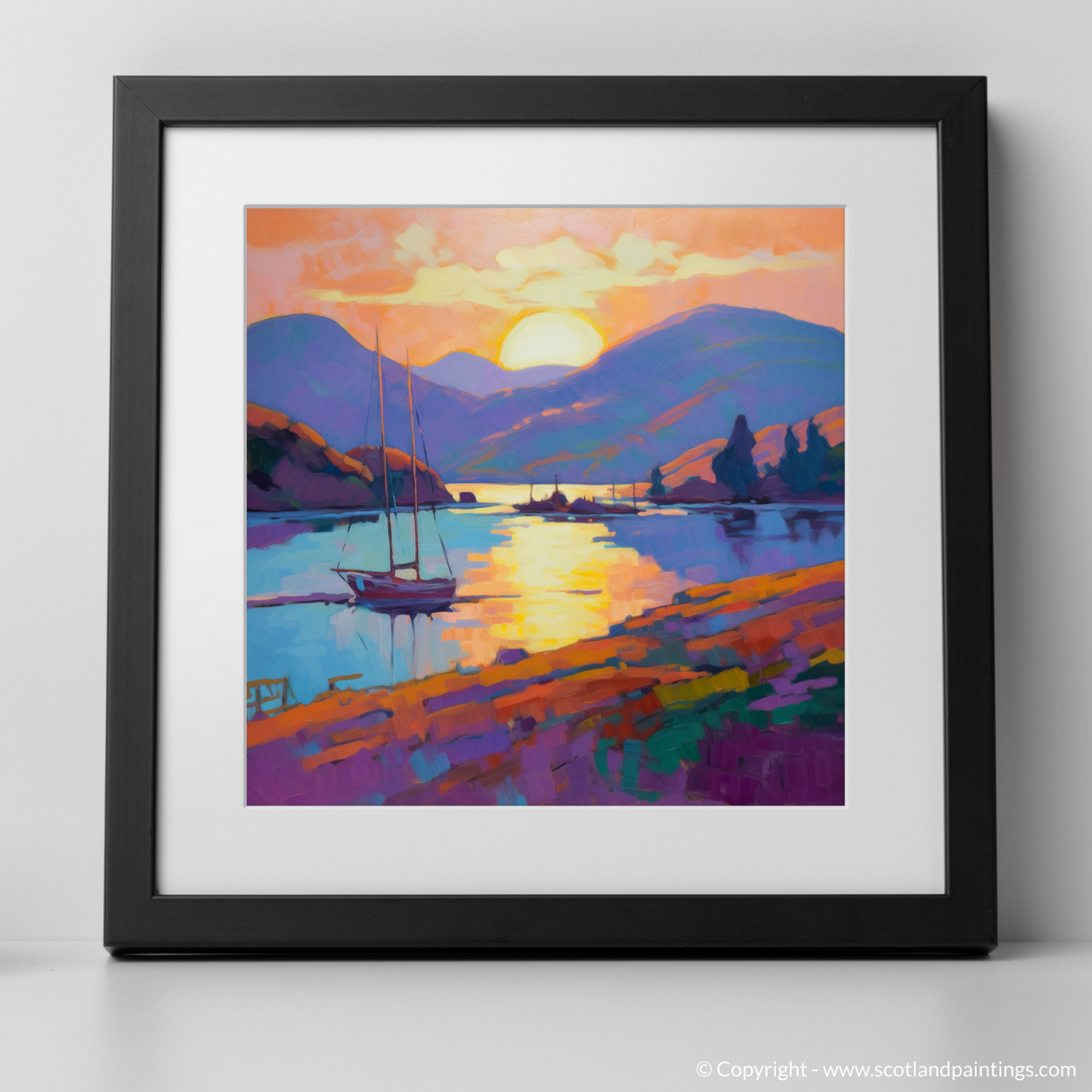 As the sun dips towards the horizon, casting a warm glow over Balmaha Harbour, this enchanting print captures the essence of a tranquil Scottish evening. With an impressionistic touch, the scene is illuminated by the waning light of day, giving life to the rich purples, vibrant corals, and luminous yellows that dance across the canvas.