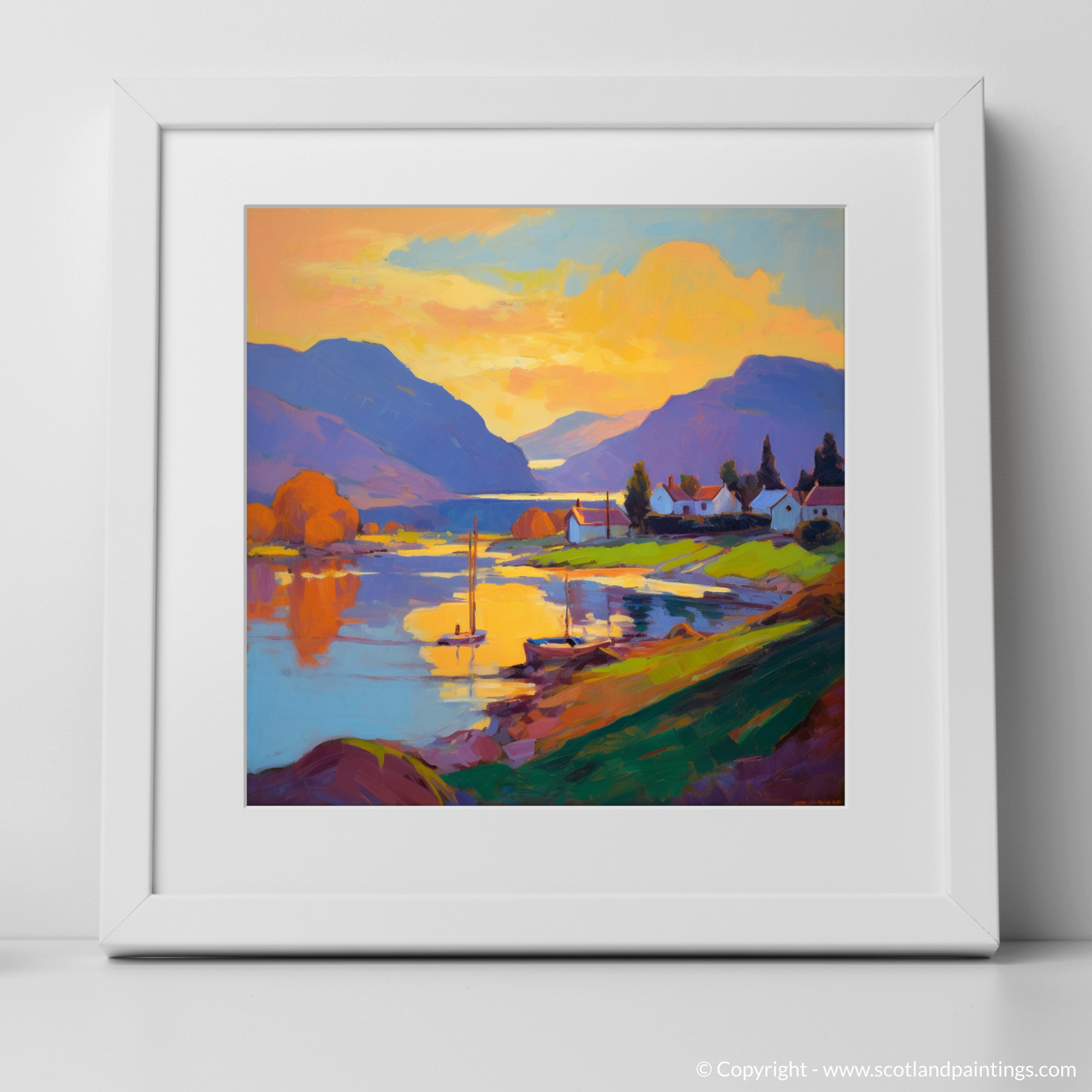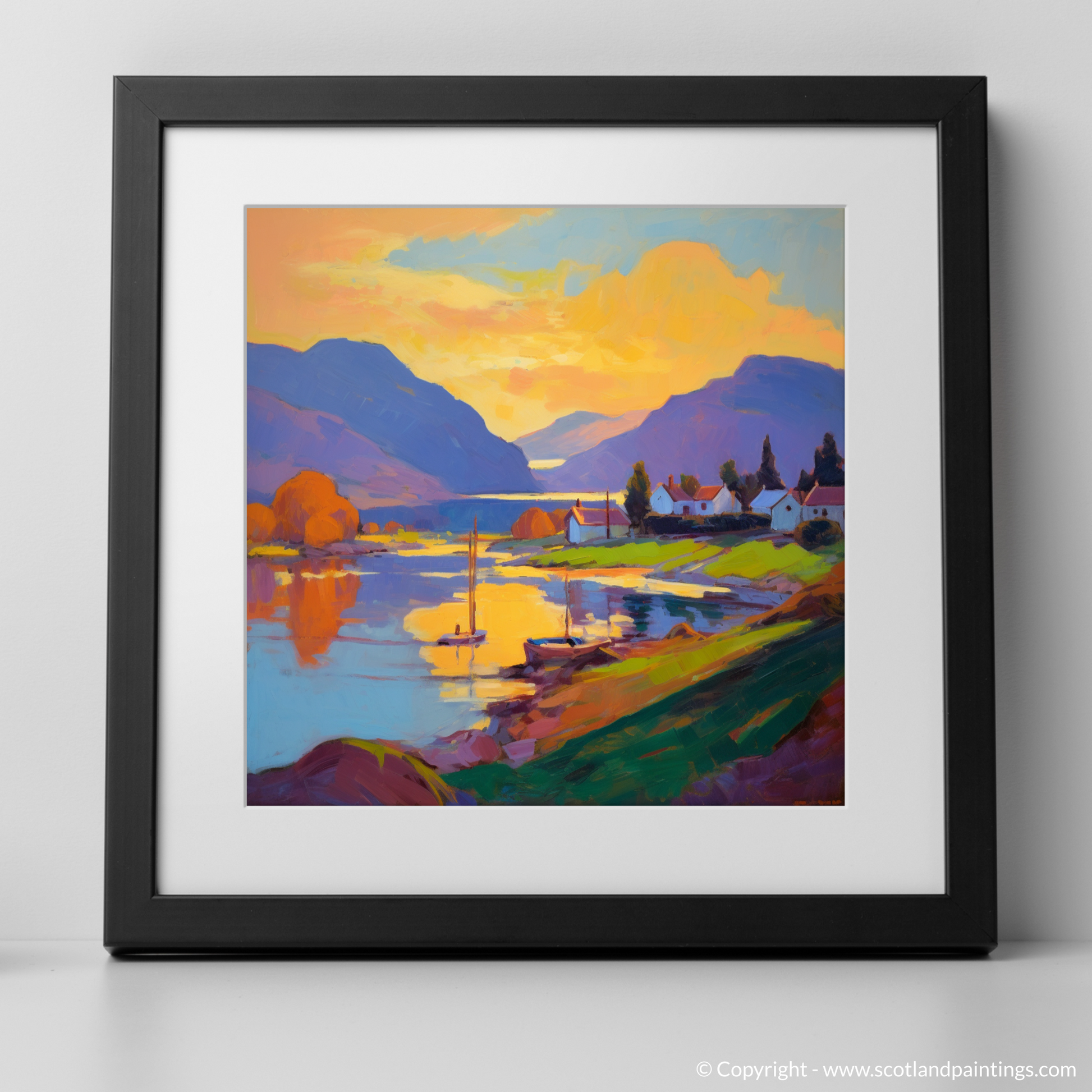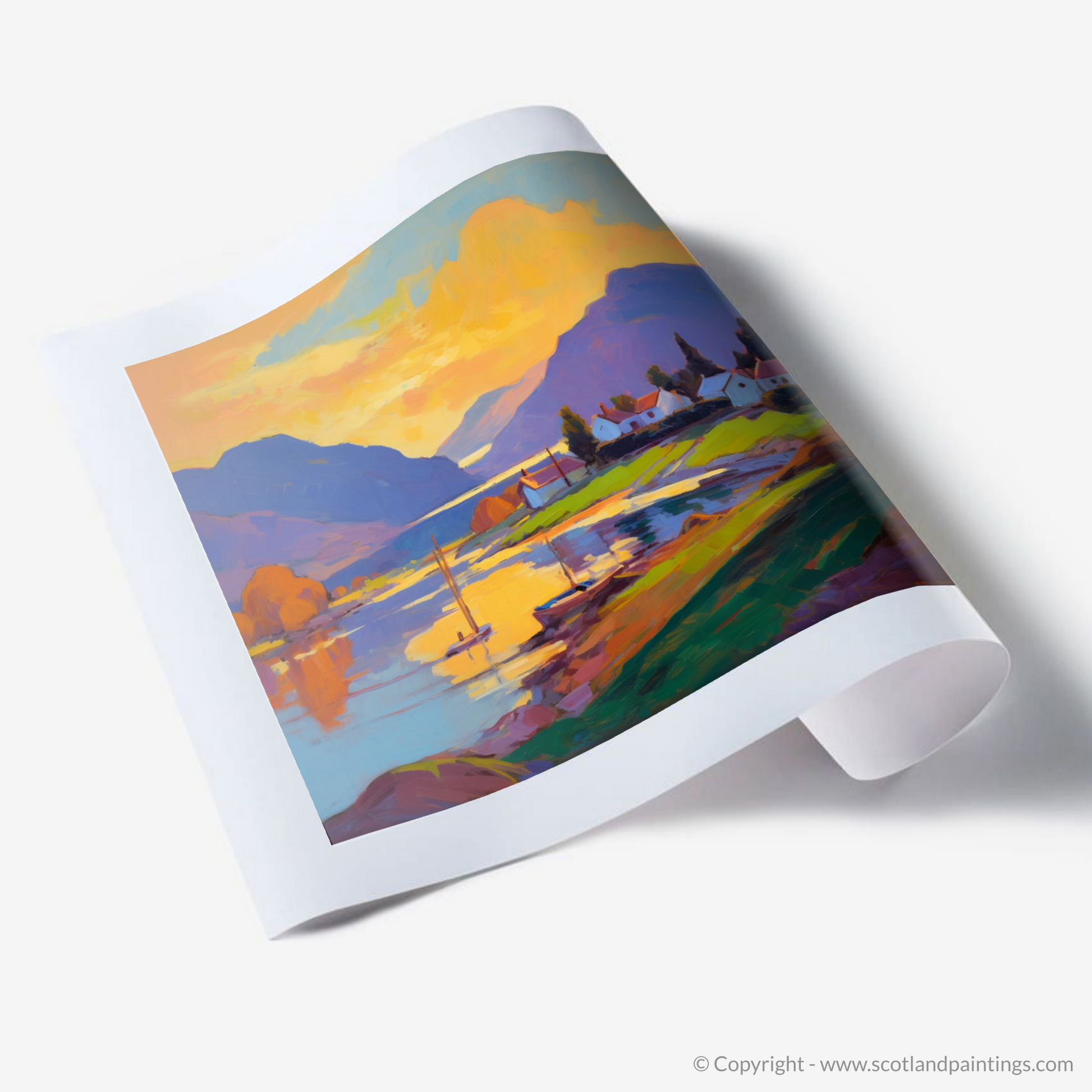 Bathed in the warm glow of the setting sun, this exquisite impressionist-inspired print captures the serene beauty of Plockton Harbour during the magical golden hour. The vibrant hues dance across the canvas, mirroring the tranquil waters which reflect the rich oranges and pinks of the twilight sky. In the background, majestic hills rise gracefully, their silhouettes softened by the fading light.
