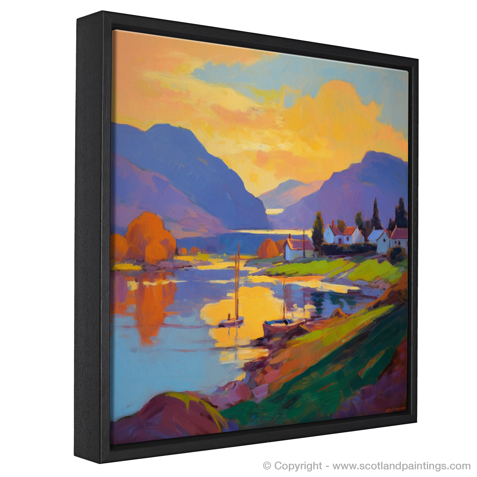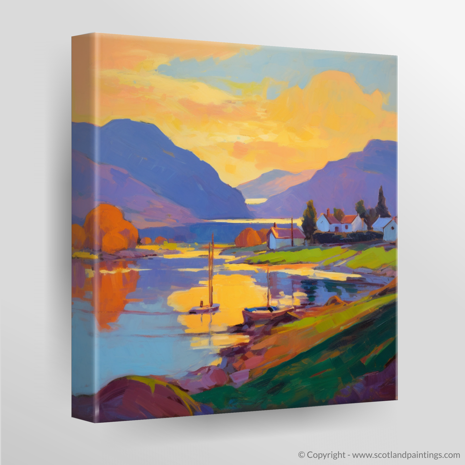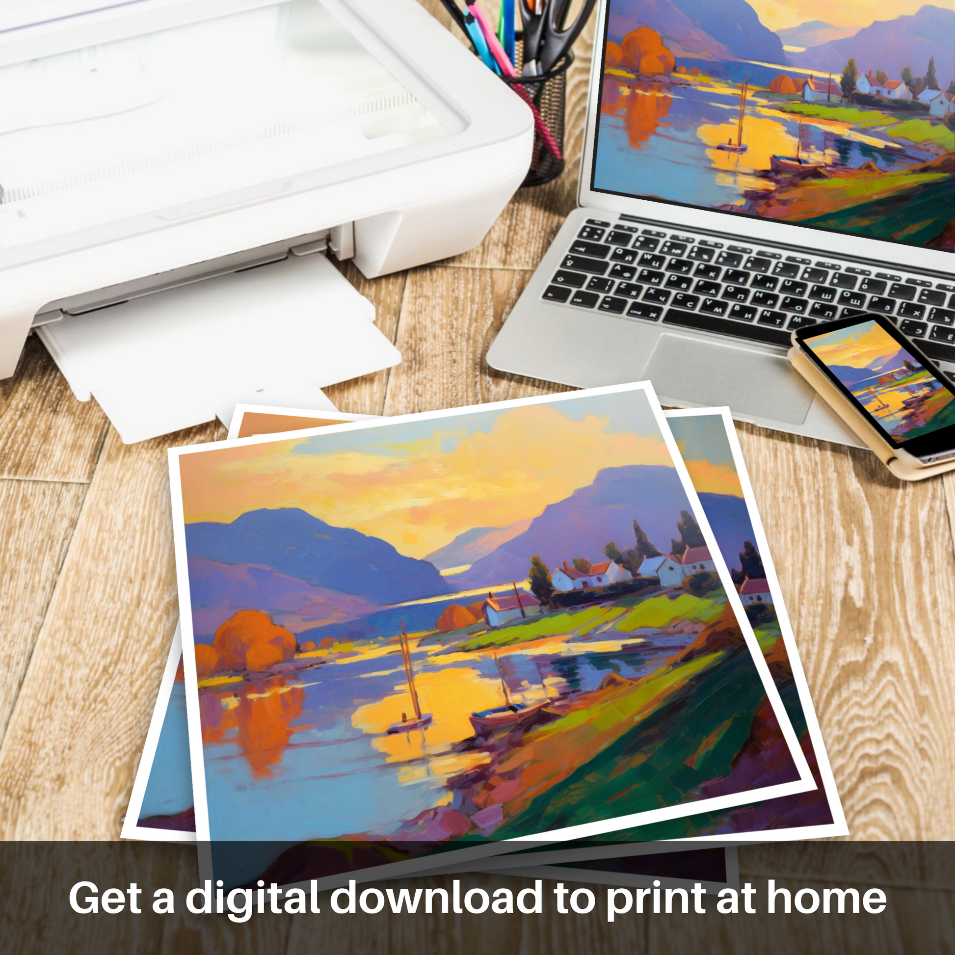 Bathed in the warm glow of the setting sun, this exquisite impressionist-inspired print captures the serene beauty of Plockton Harbour during the magical golden hour. The vibrant hues dance across the canvas, mirroring the tranquil waters which reflect the rich oranges and pinks of the twilight sky. In the background, majestic hills rise gracefully, their silhouettes softened by the fading light.