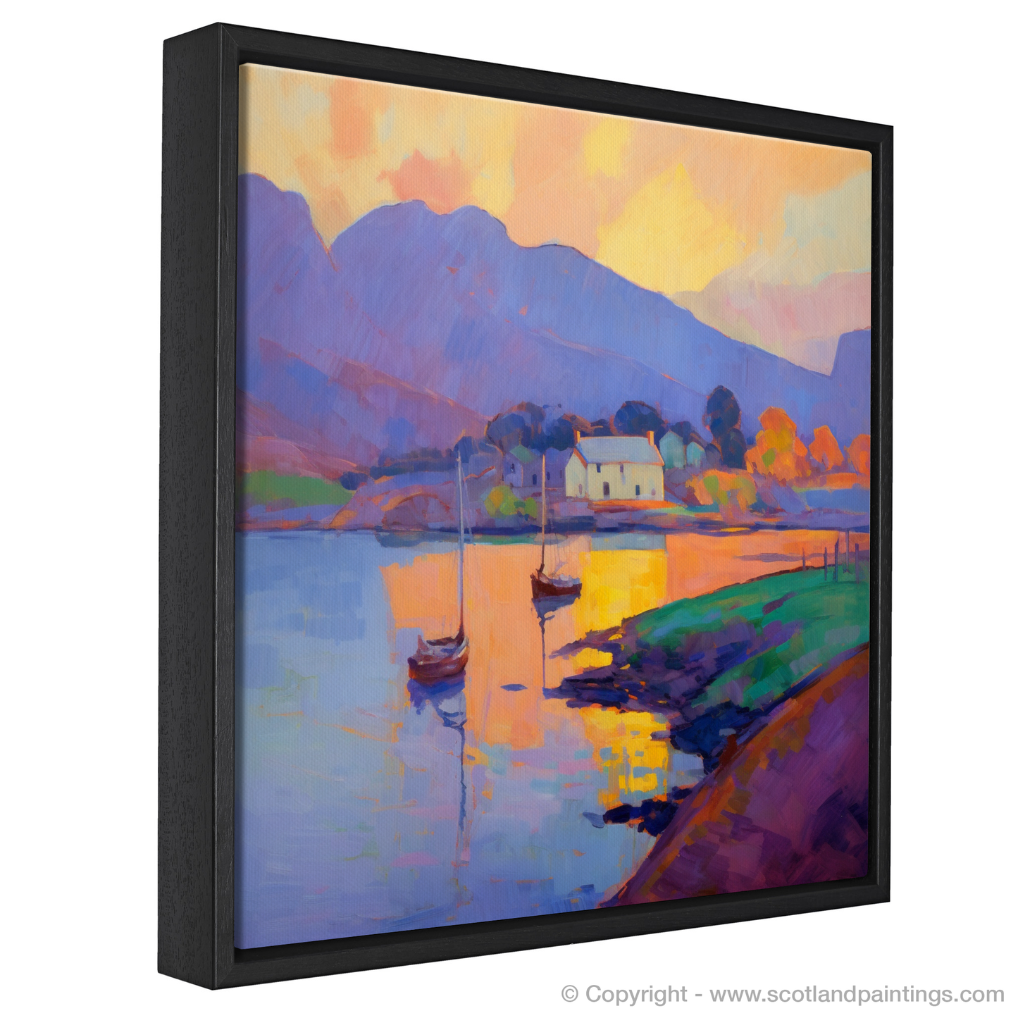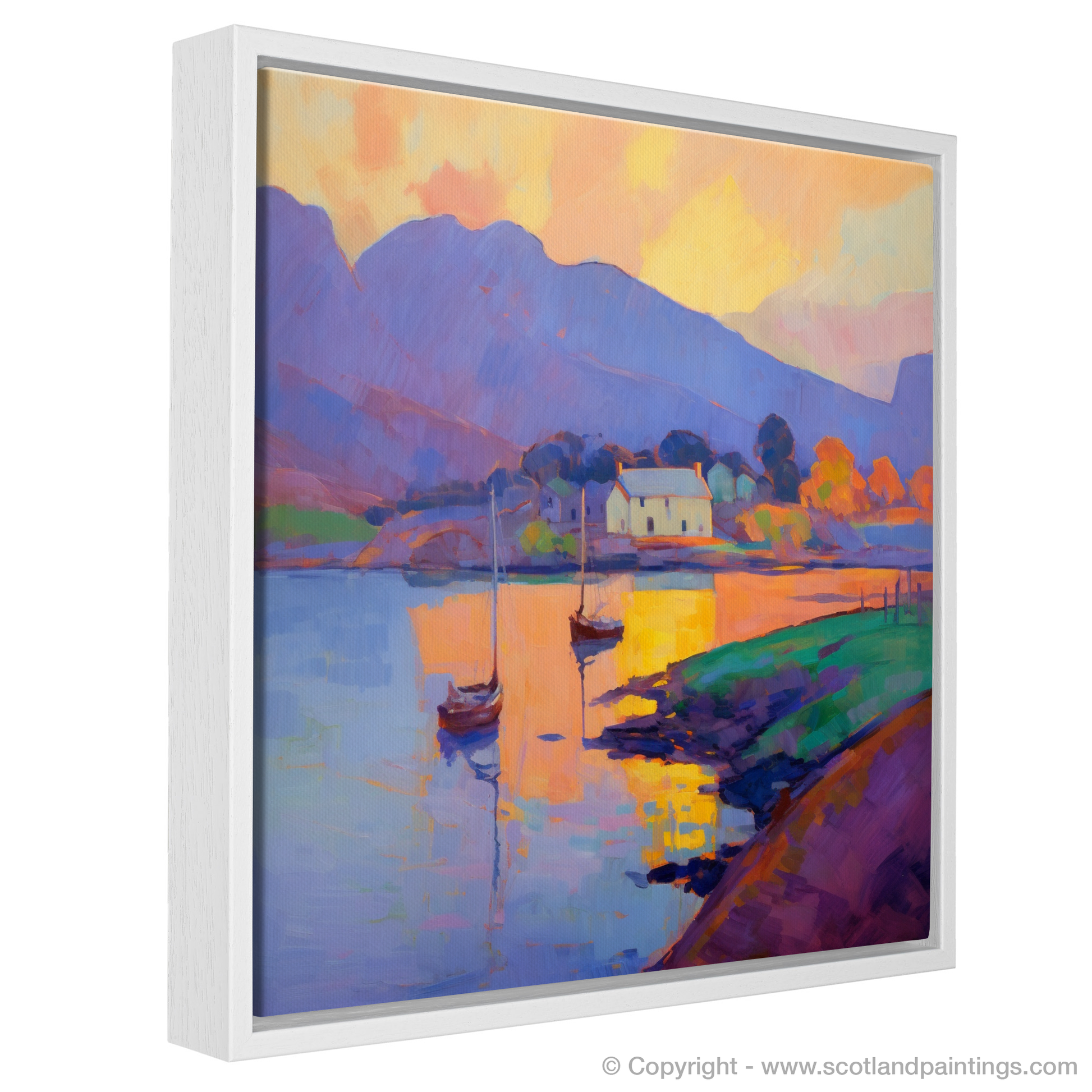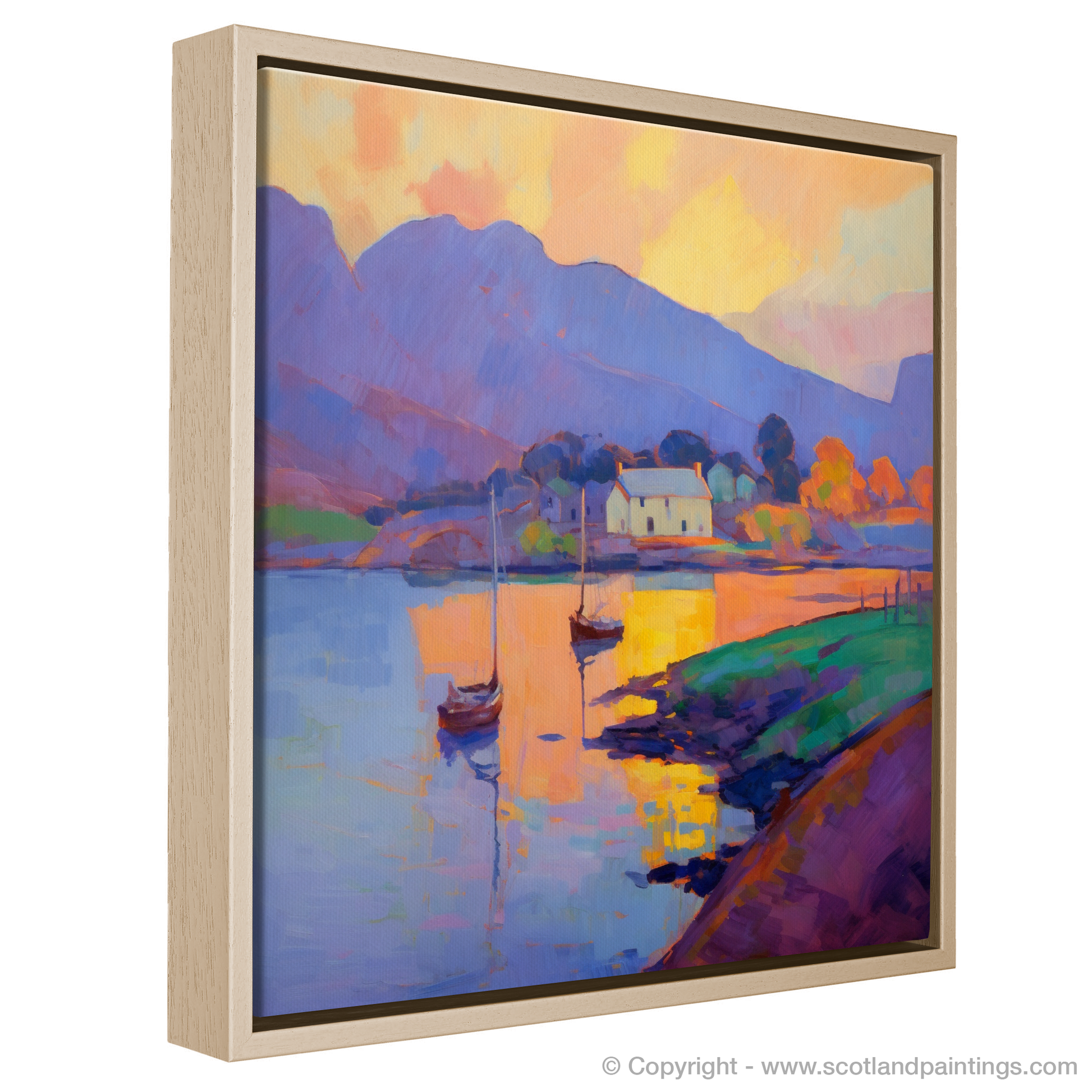 As the sun lays its golden mantle over Mallaig Harbour, this evocative print captures the essence of a serene Scottish evening. The radiant sky, a tableau of warm corals and gentle lilacs, seamlessly blends into the mirrored waters, which cradle the reflections of docked boats and the silhouetted landscape. The houses smeared with a buttery yellow glow suggest the cosy harbourside life, accentuating the idyllic charm of the scene.