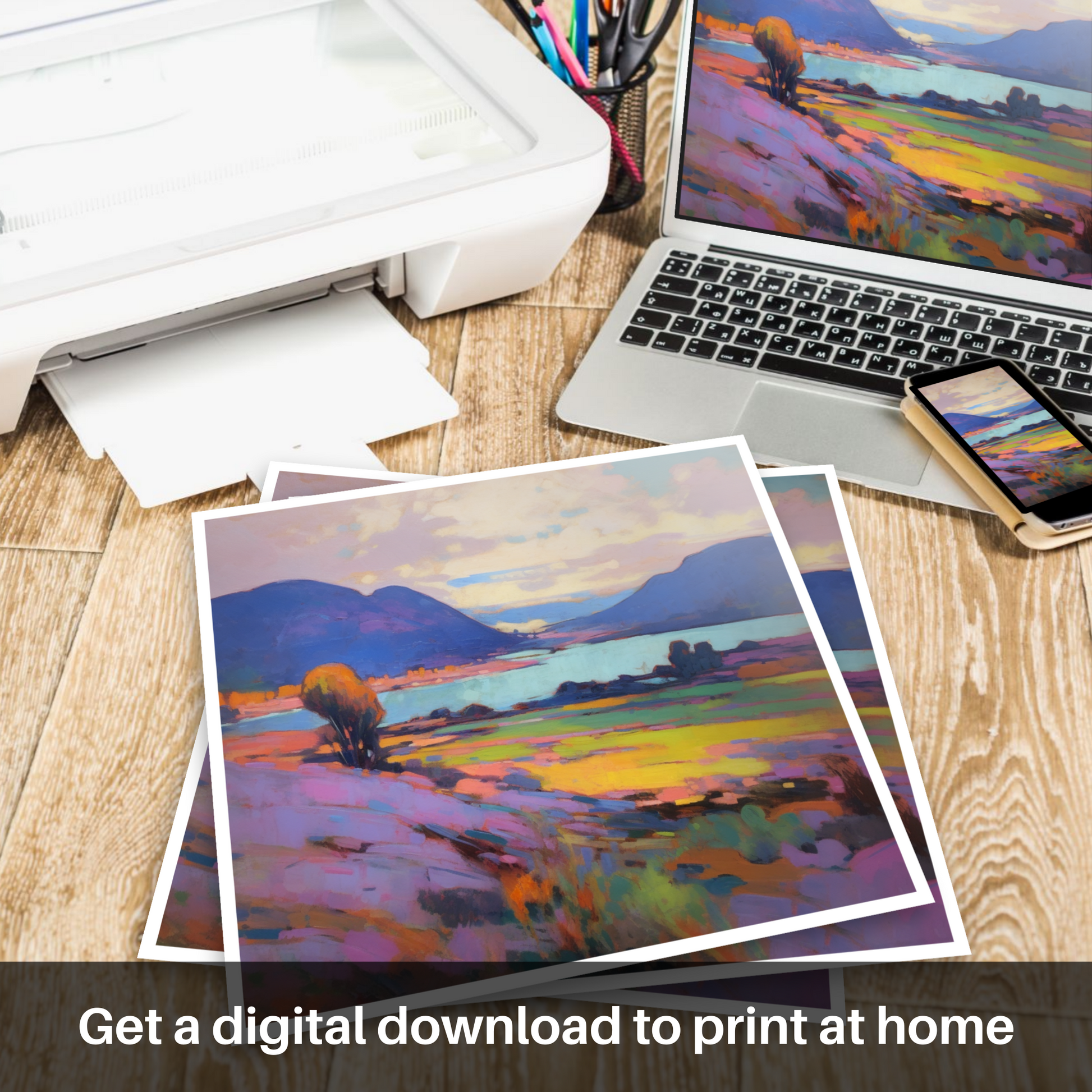 Capturing the ephemeral beauty of the Scottish Highlands, this evocative print invites viewers to bask in the serene splendour of Loch Insh. Swathes of vibrant hues spread across the canvas, embodying the dynamic play of light and colour that is the essence of Impressionist art. The foreground is adorned with a tapestry of warm yellows, rich purples, and deep blues, conjuring images of heather-laden moors that come alive beneath the capricious Scottish sky.