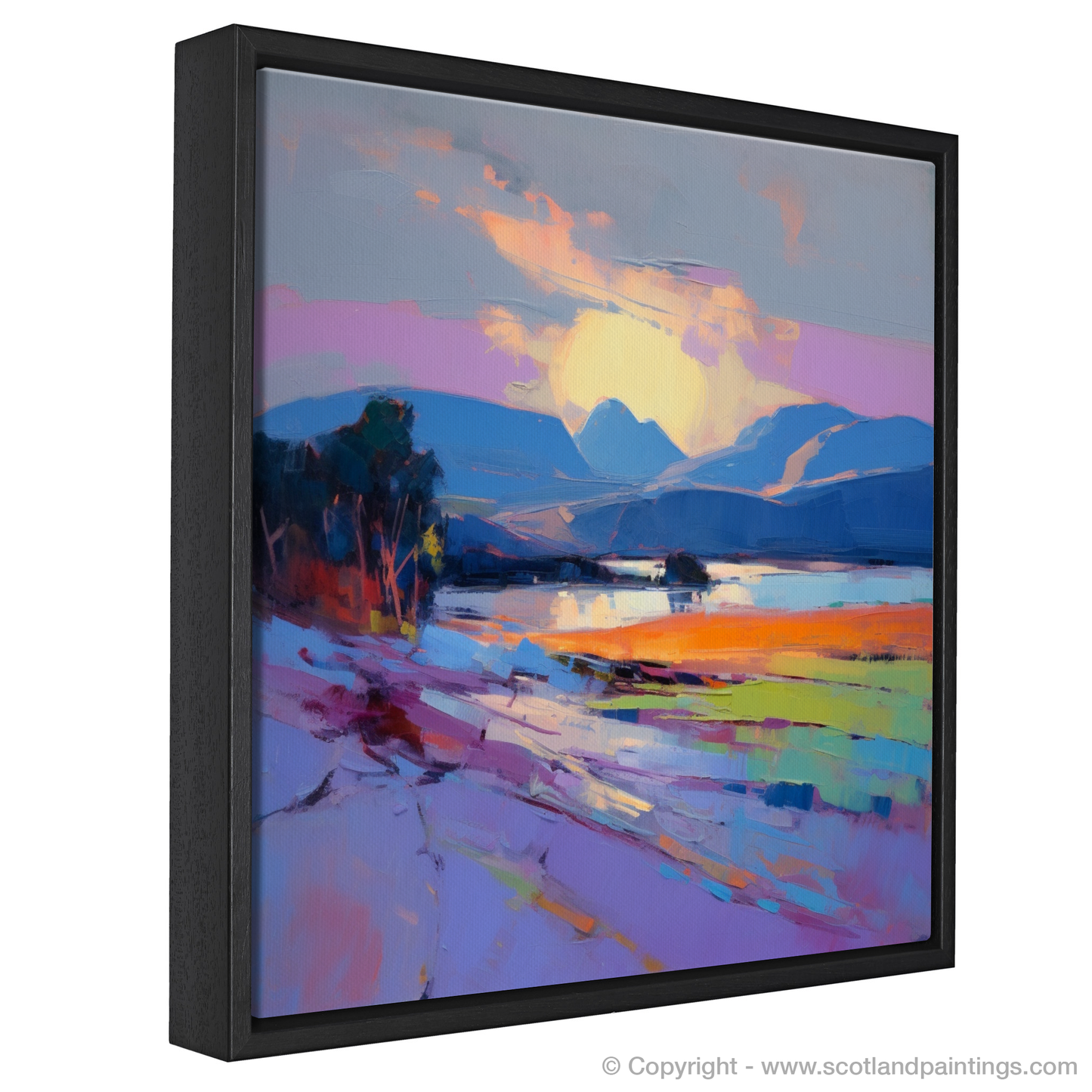 In the foreground, deep shadows and highlights suggest a rugged shoreline adorned with foliage, hinting at the wild beauty of the Scottish landscapes. The crescendo of colours not only represents the visual spectacle of dusk but also seems to convey the palpable chill of the evening air and the gentle sound of lapping waves.