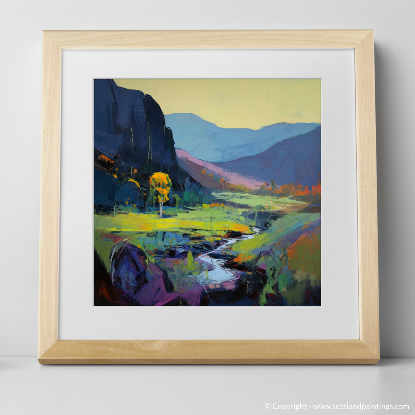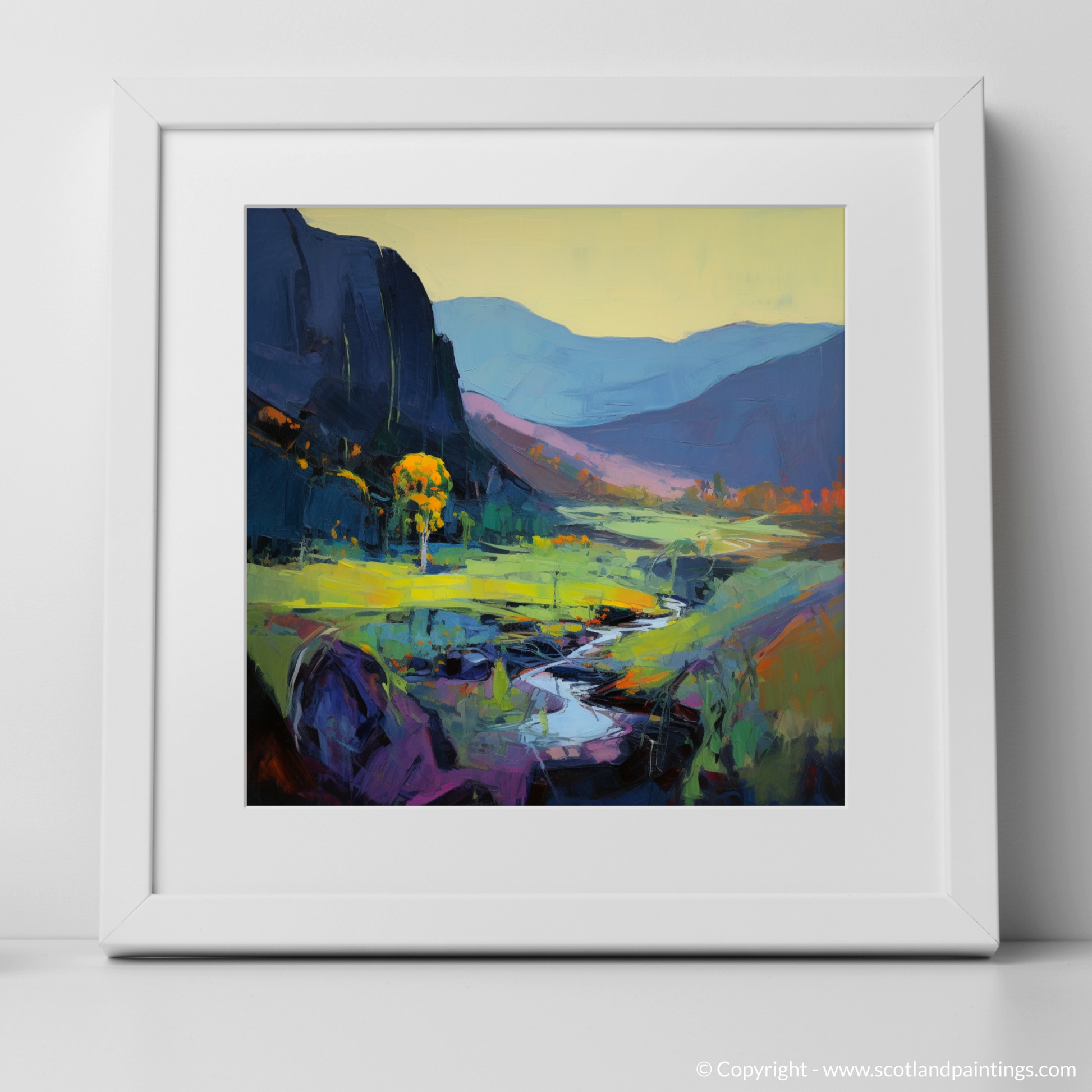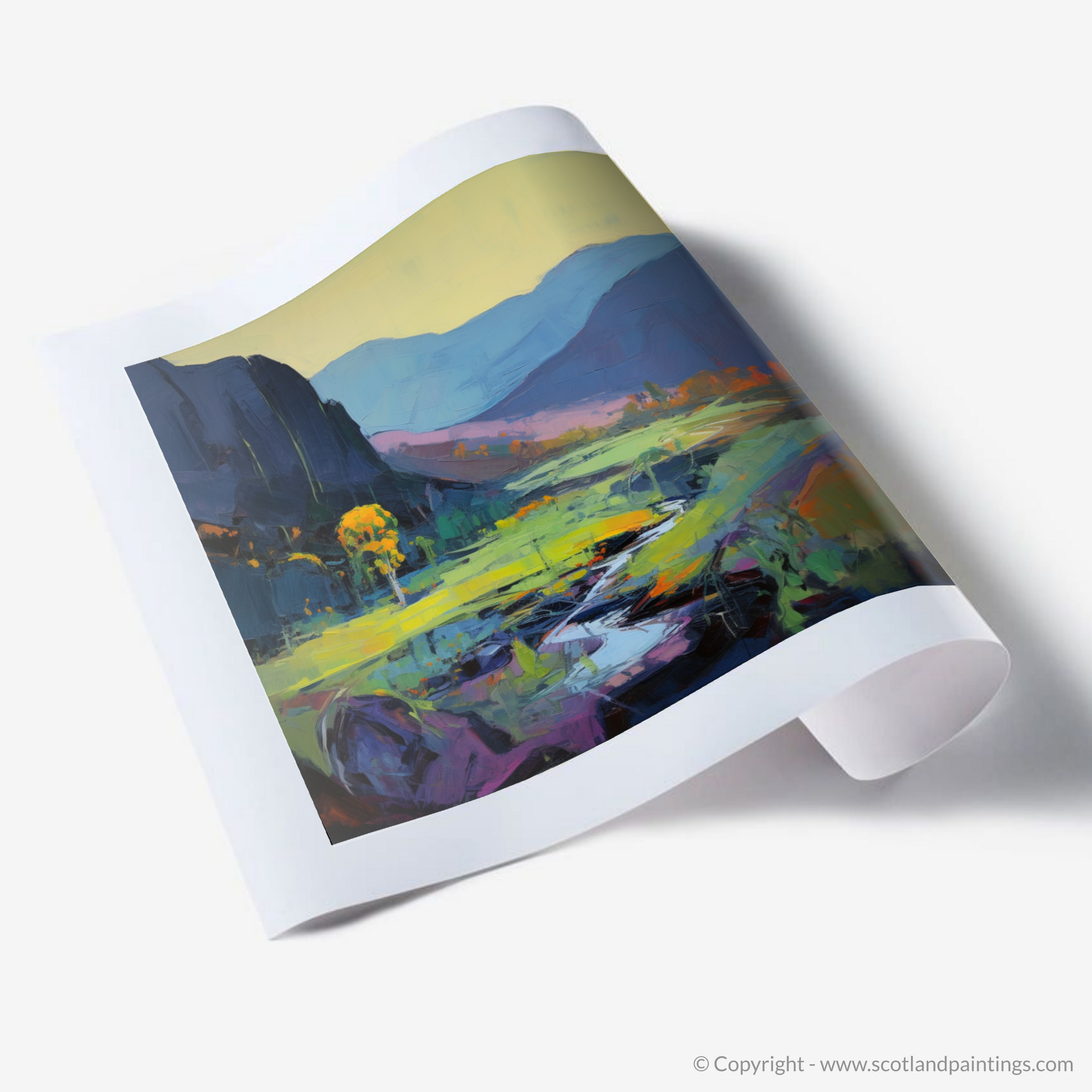 Immerse yourself in the vibrant hues and emotive brushstrokes of this captivating print, where the rugged beauty of Glencoe is reimagined through the passionate lens of Expressionism. At the heart of the scene, the resplendent Lady’s-mantle draws the eye, its golden tones a stark contrast to the cool backdrop, as if nature's own spotlight highlights its delicate presence. The plant, bathed in a soft, ambient light, appears to dance with vivid vitality at the water's edge.
