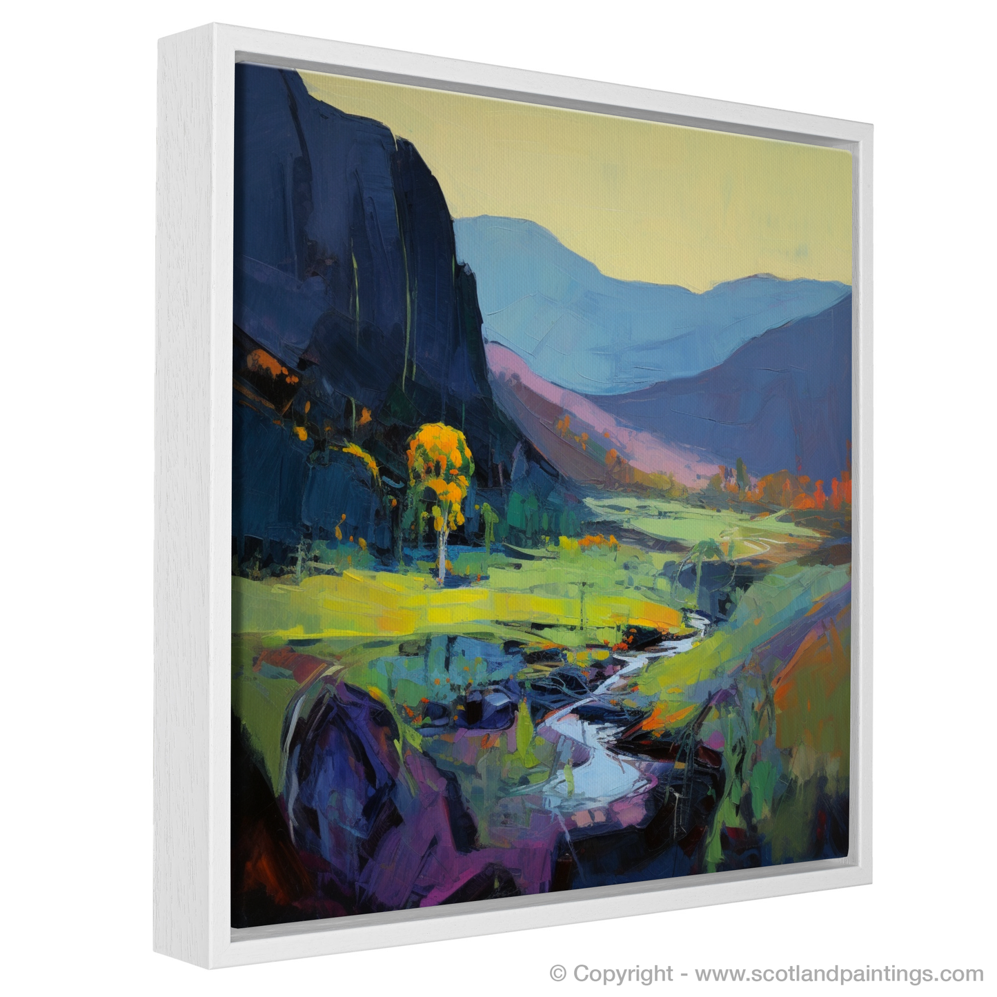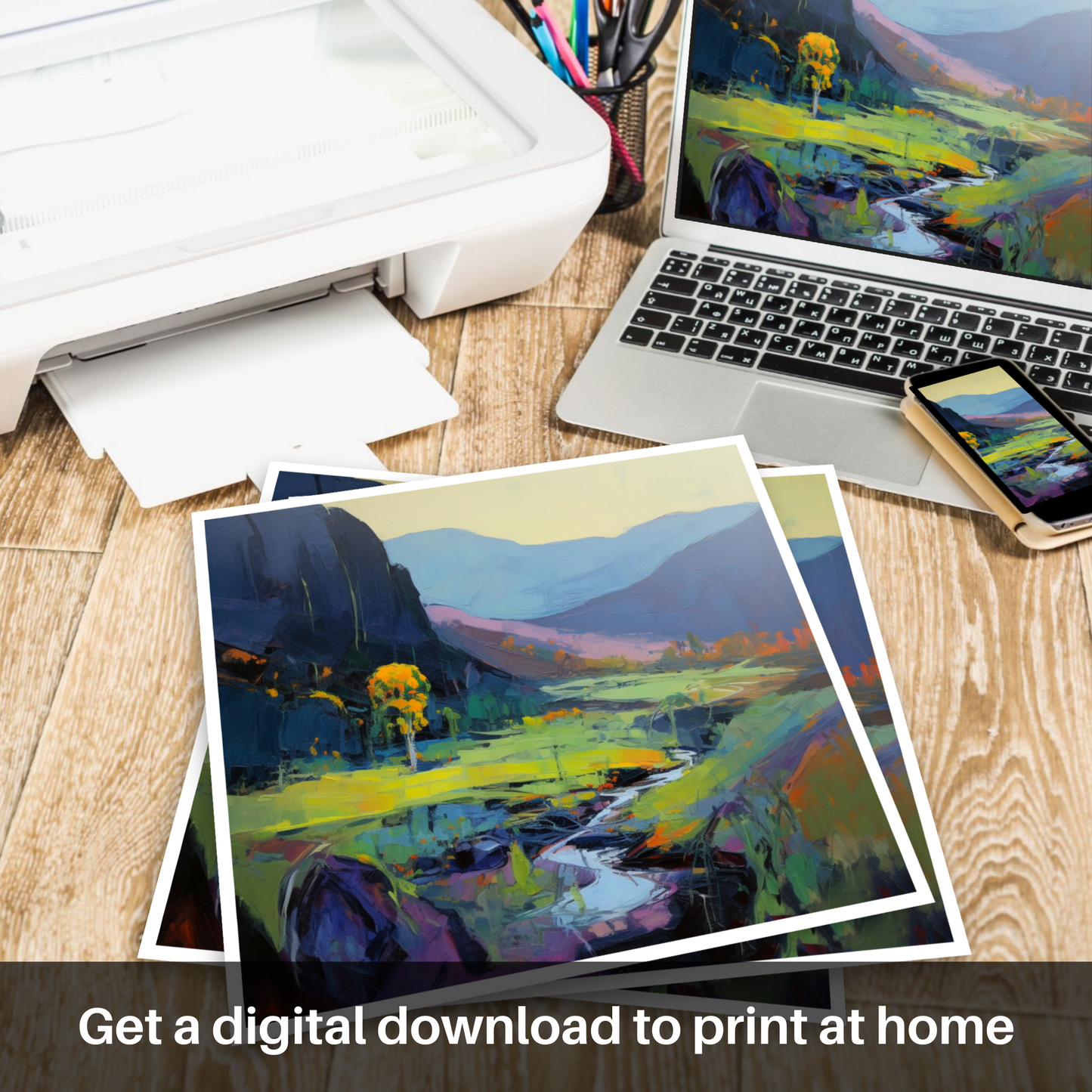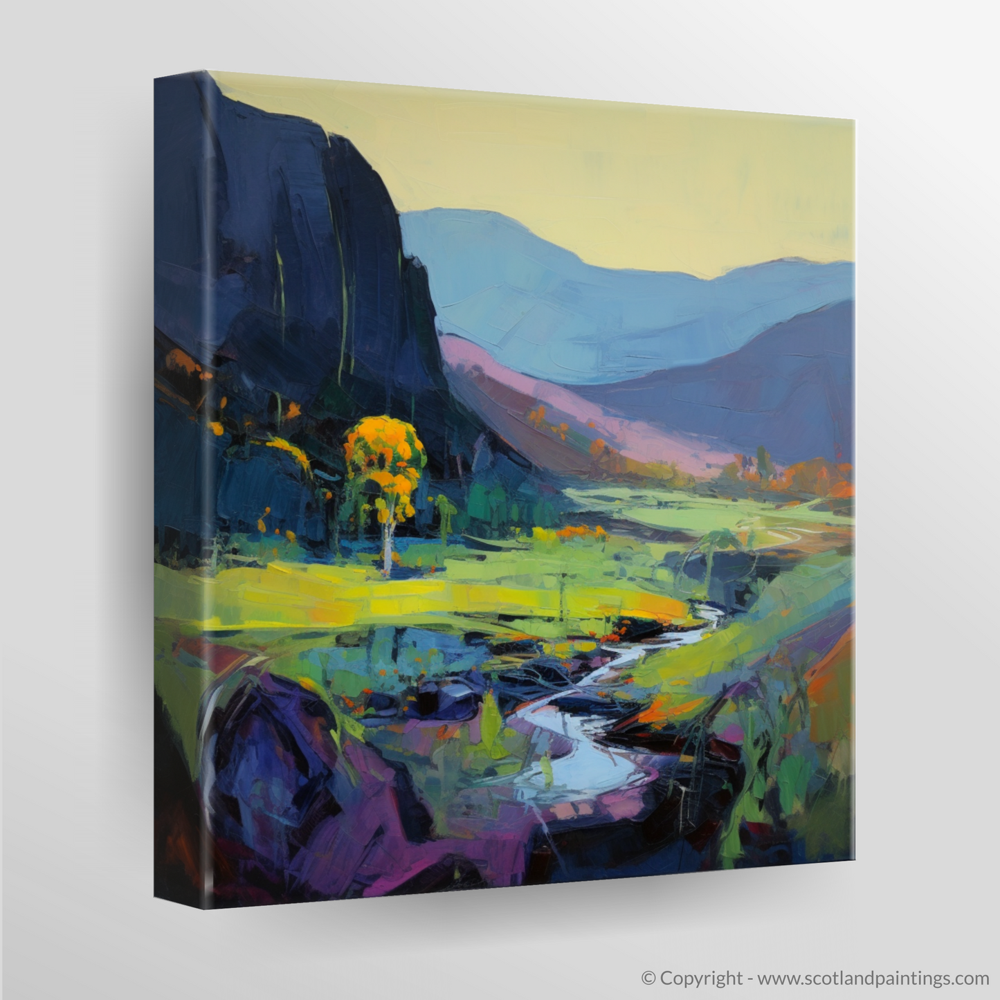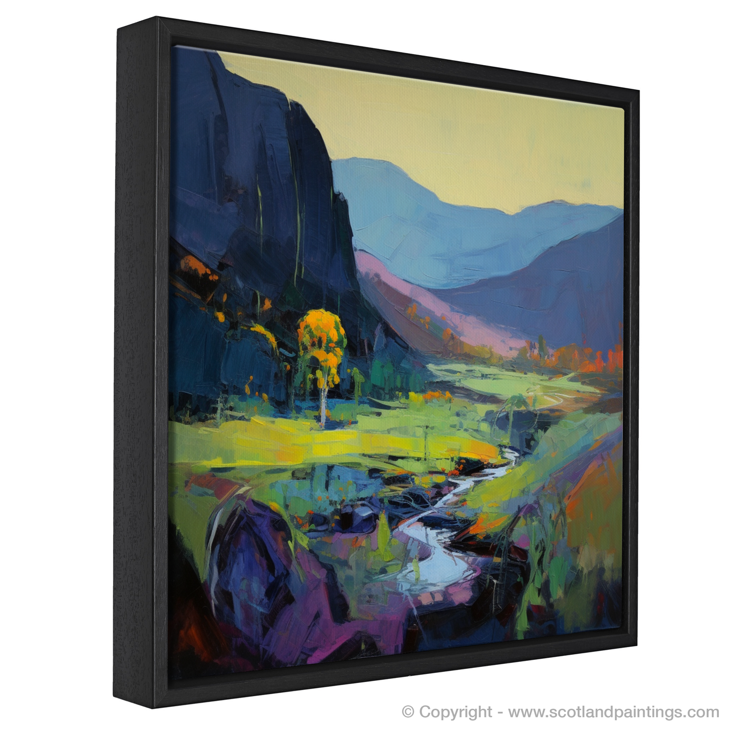 Immerse yourself in the vibrant hues and emotive brushstrokes of this captivating print, where the rugged beauty of Glencoe is reimagined through the passionate lens of Expressionism. At the heart of the scene, the resplendent Lady’s-mantle draws the eye, its golden tones a stark contrast to the cool backdrop, as if nature's own spotlight highlights its delicate presence. The plant, bathed in a soft, ambient light, appears to dance with vivid vitality at the water's edge.