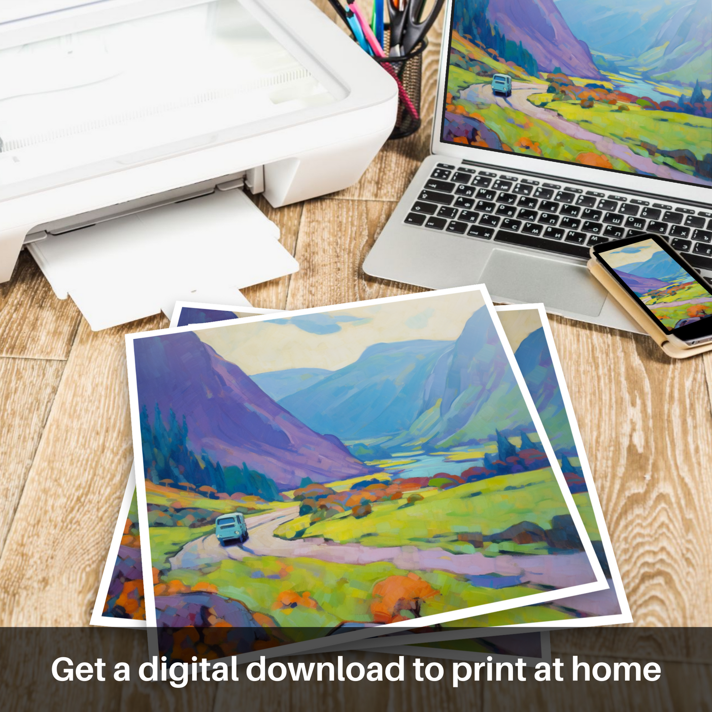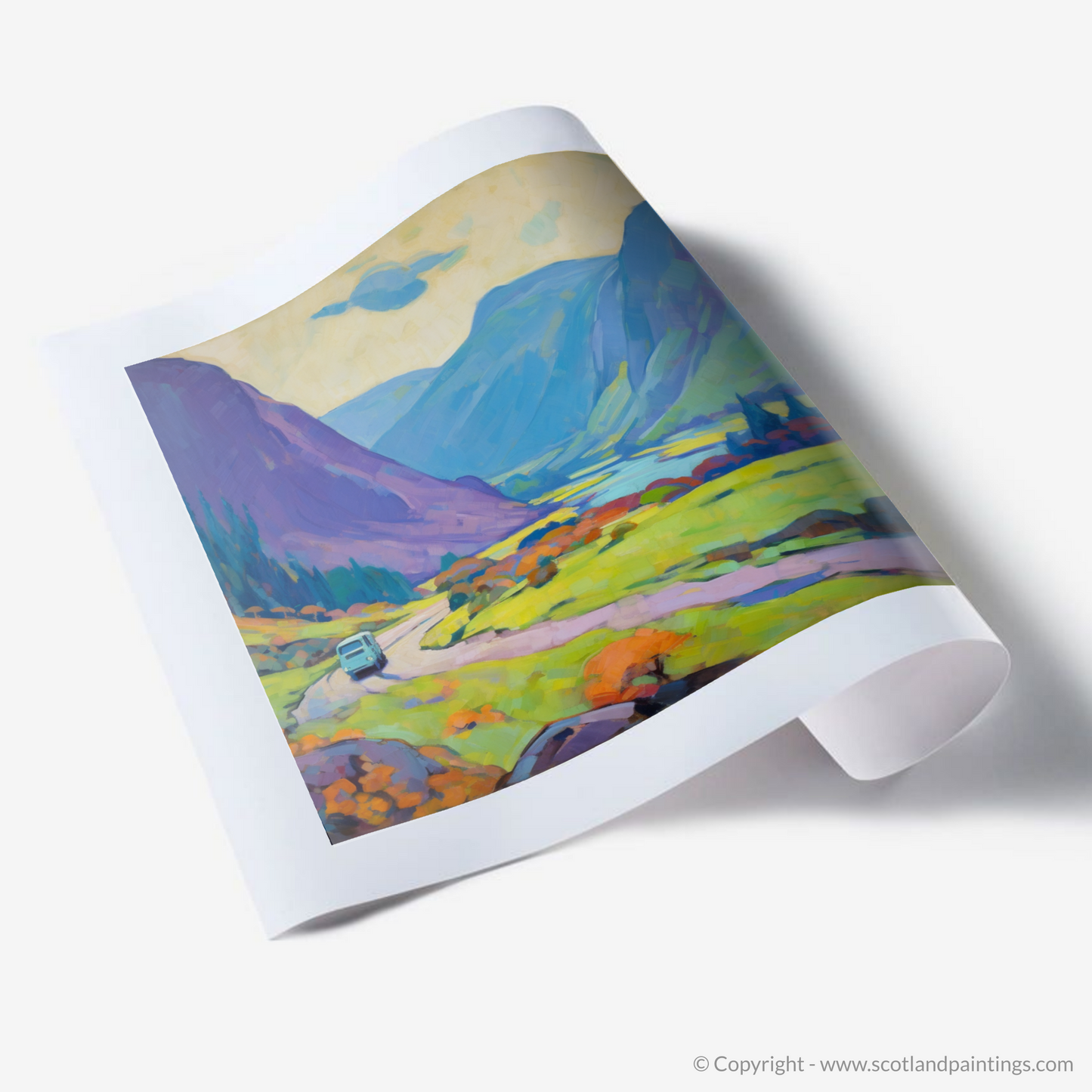 Captured within this vibrant impressionistic print is a quintessential summer's day in the heart of Glencoe, where the spirit of Scotland's natural grandeur is brought to life through a symphony of colour and light. Your gaze is gently guided along a winding road with a solitary campervan making its leisurely journey amidst the expansive beauty, encapsulating the essence of freedom and the joy of exploration.