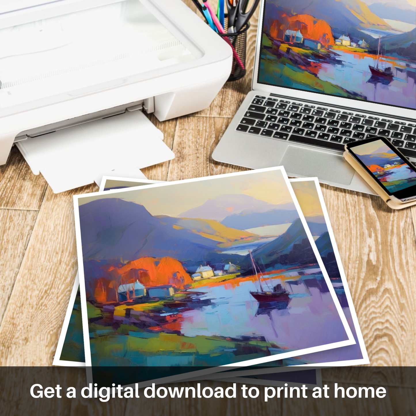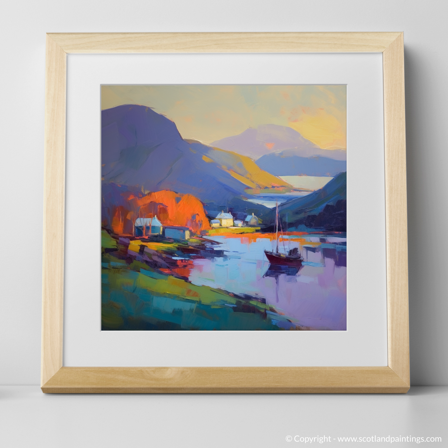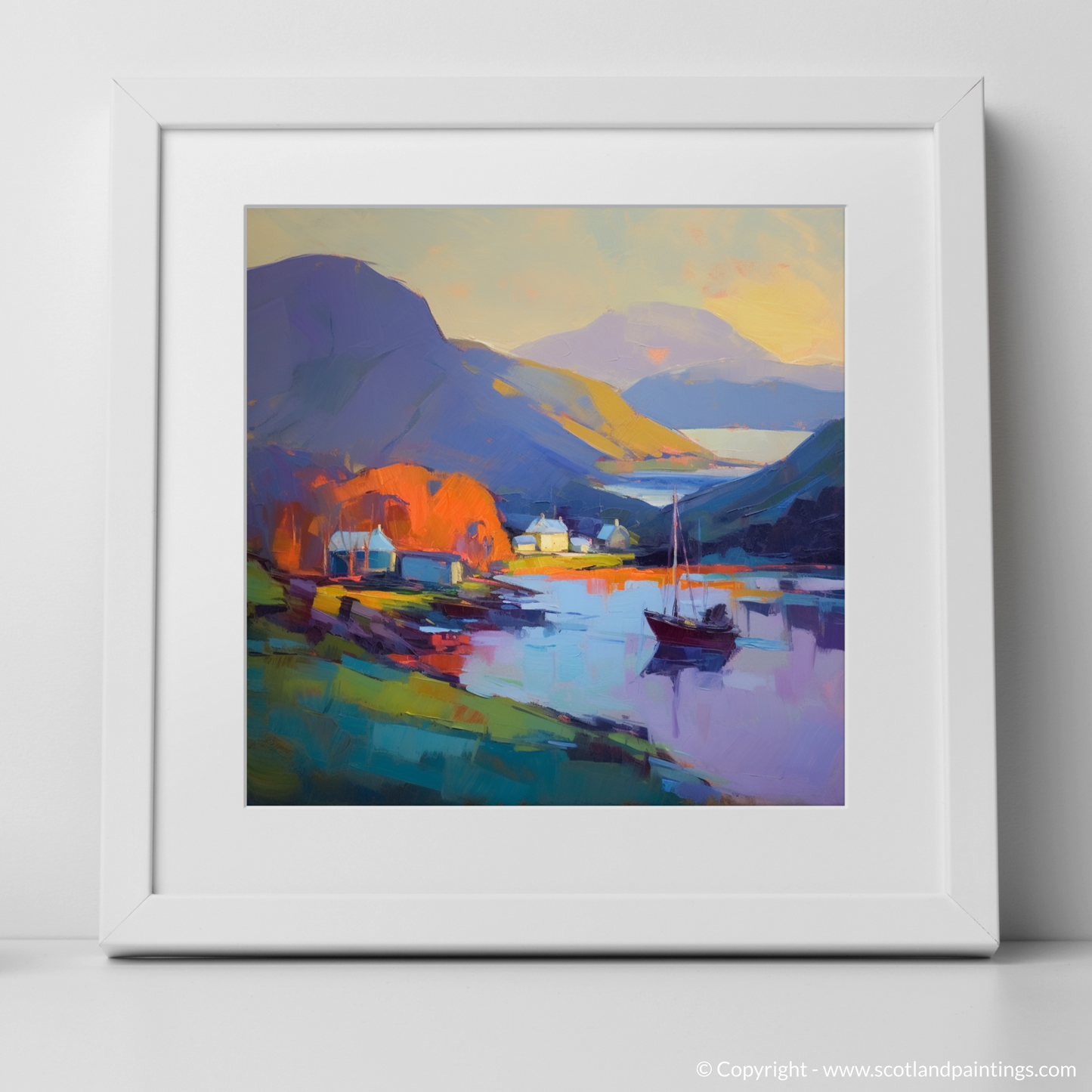 Immerse yourself in the vibrant hues and emotive strokes of this evocative interpretation of Mallaig Harbour at the magical golden hour. This exquisite print is a symphony of colour and emotion, capturing the enchanting play of light that dances across the serene waters and the quaint charm of the harbour.