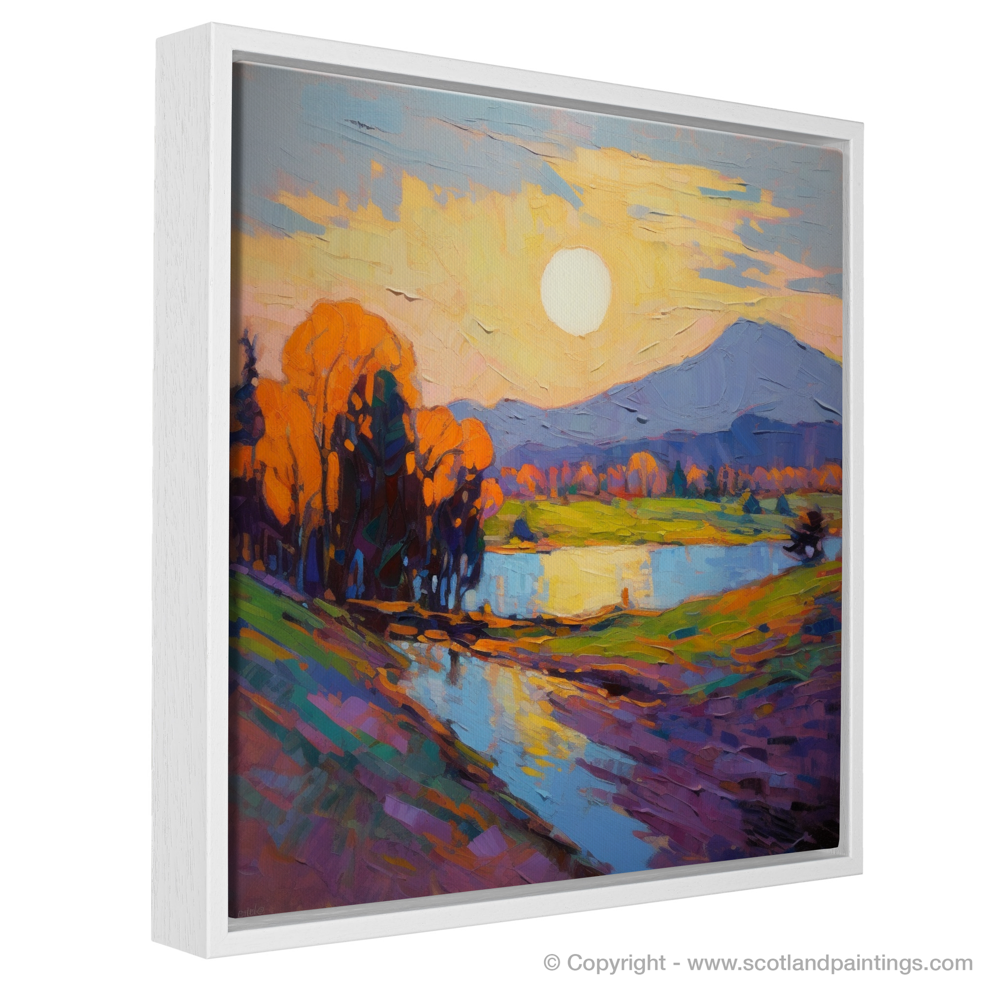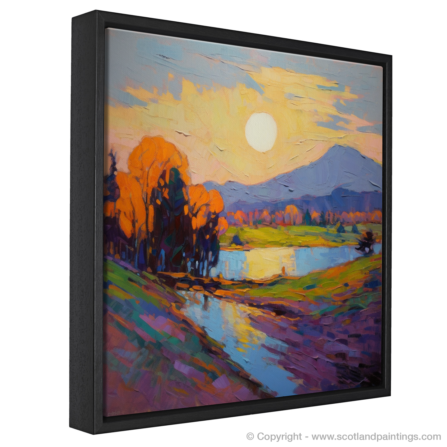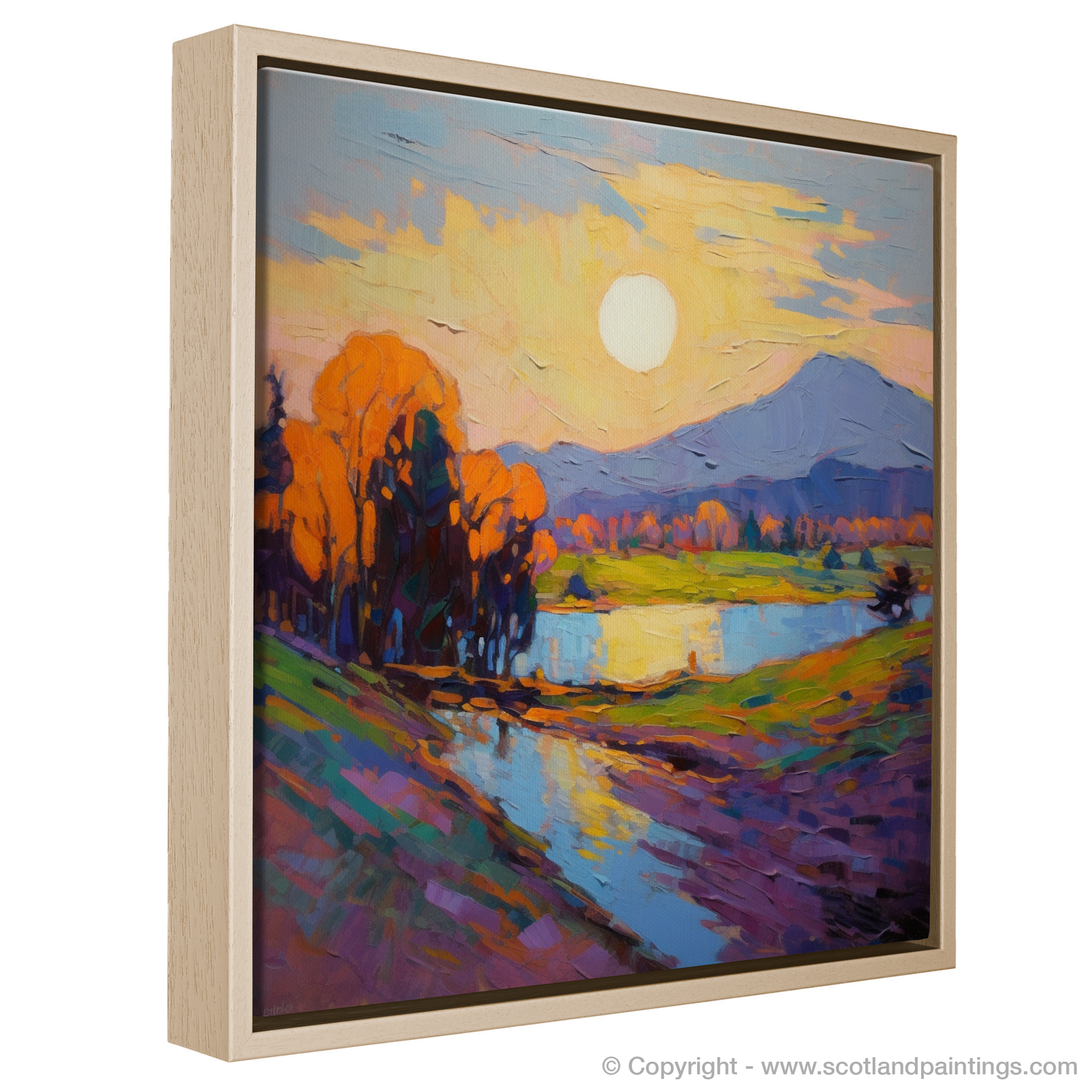 Impressionistic brush strokes masterfully convey the reflections of the sinking sun dancing on the water's surface, creating a shimmering tapestry of blues, purples, and oranges. In the foreground, a copse of trees adorned in vibrant autumnal hues of fiery orange and deep red stretch upwards towards the wistful sky, their edges softened as if by the gentle caress of the fading light.