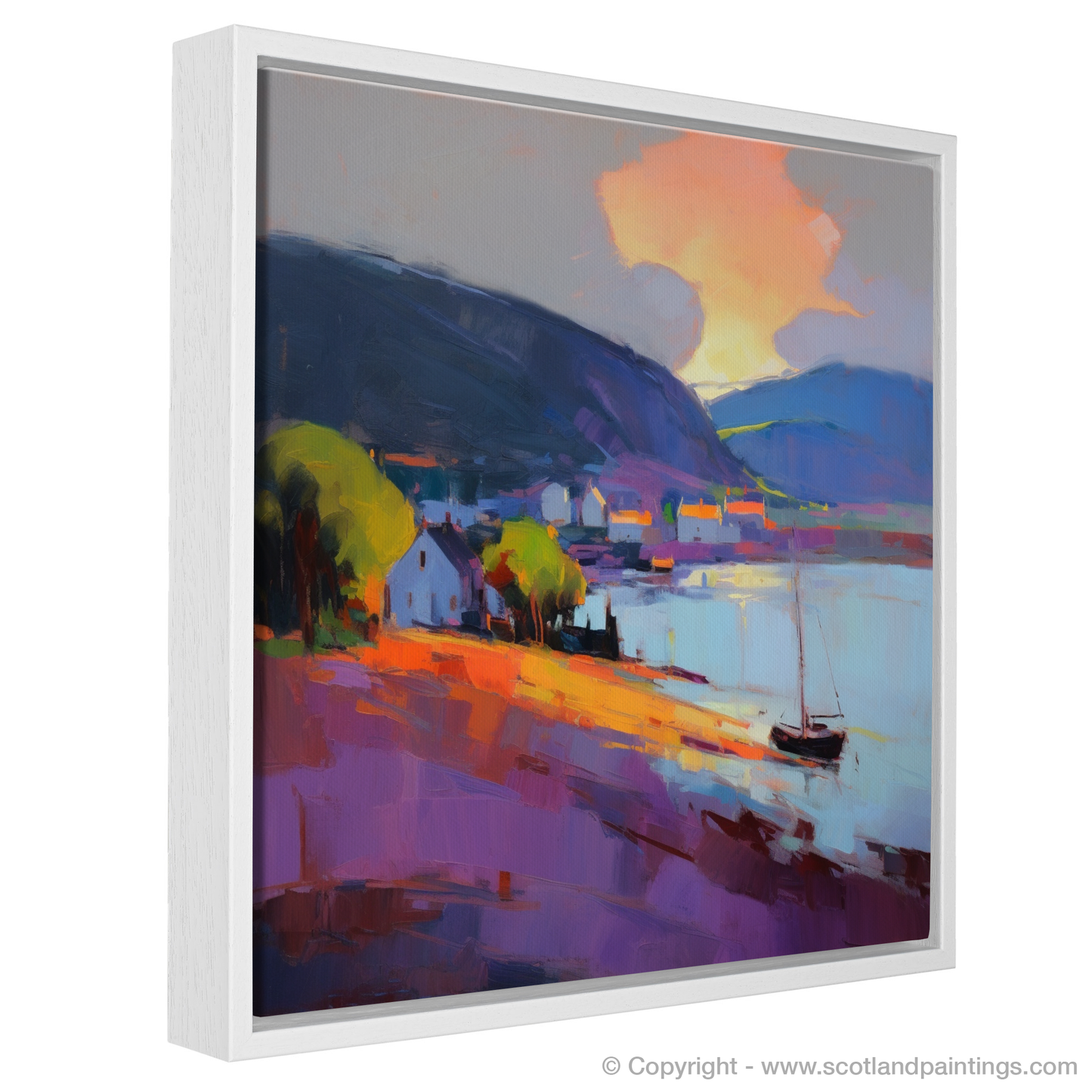 Bathe in the warmth exuded by the fiery clouds adrift in the amber skies, their reflections on the tranquil waters creating a symphony of colour that enthrals the senses. Against this captivating backdrop, the quaint harbour town nestles peacefully, its white cottages punctuated with sporadic bursts of colour – each a bold stroke of the artist's palette knife or brush which animates the scene with palpable energy.