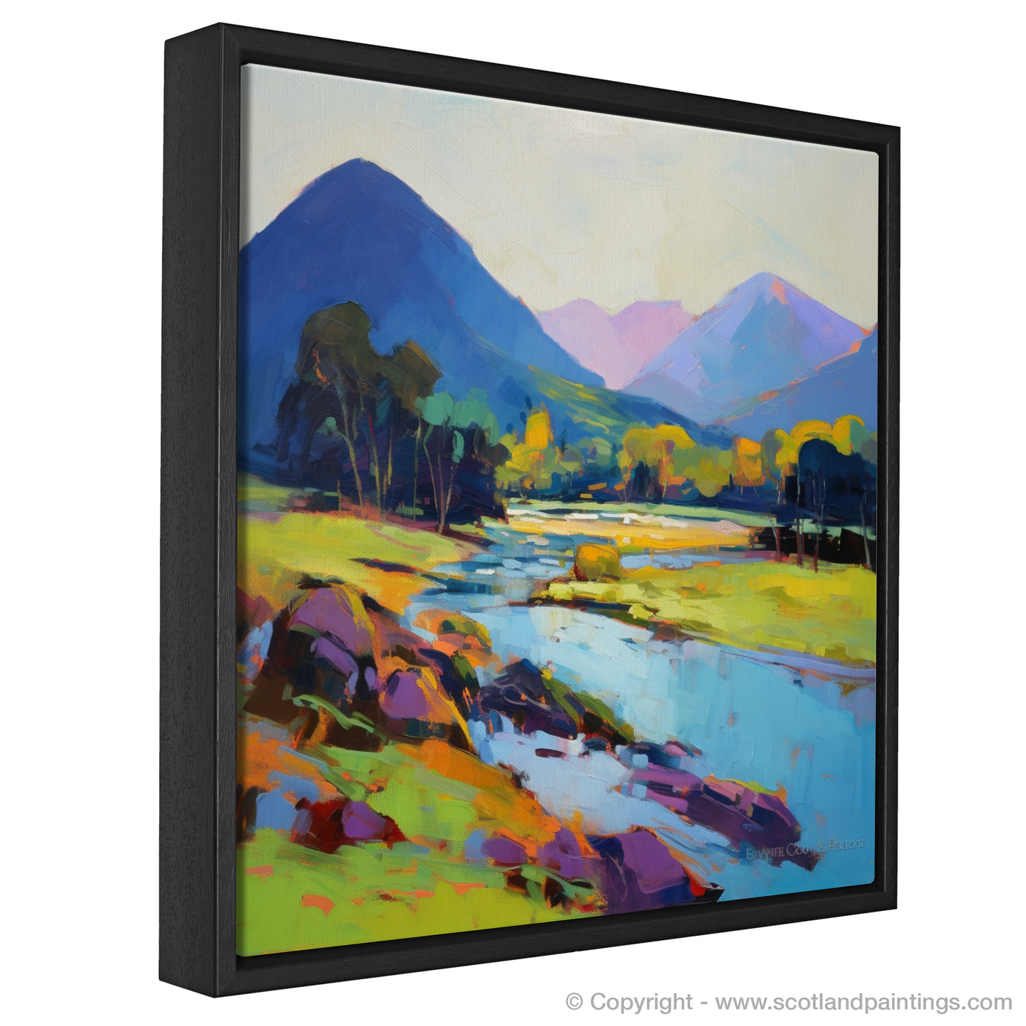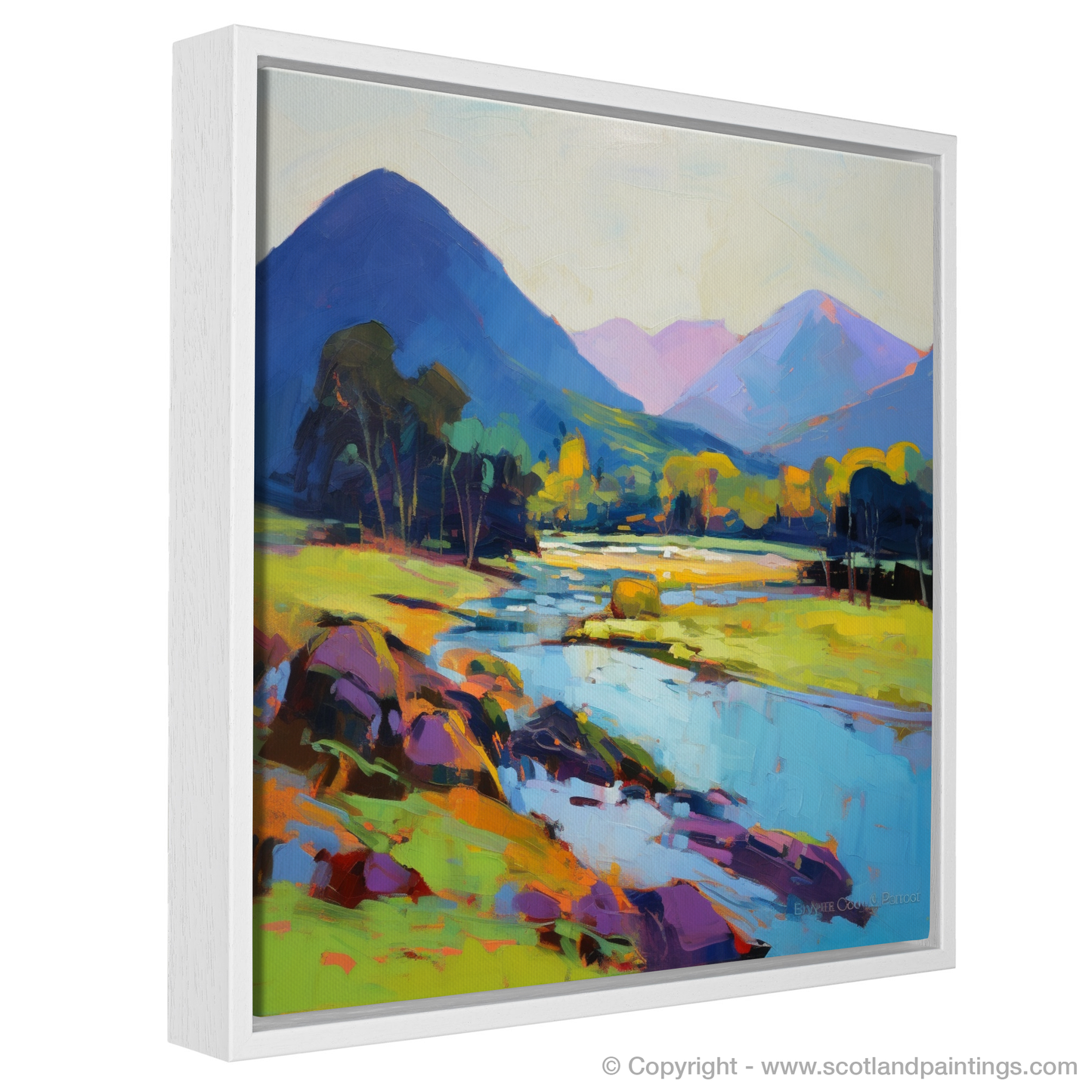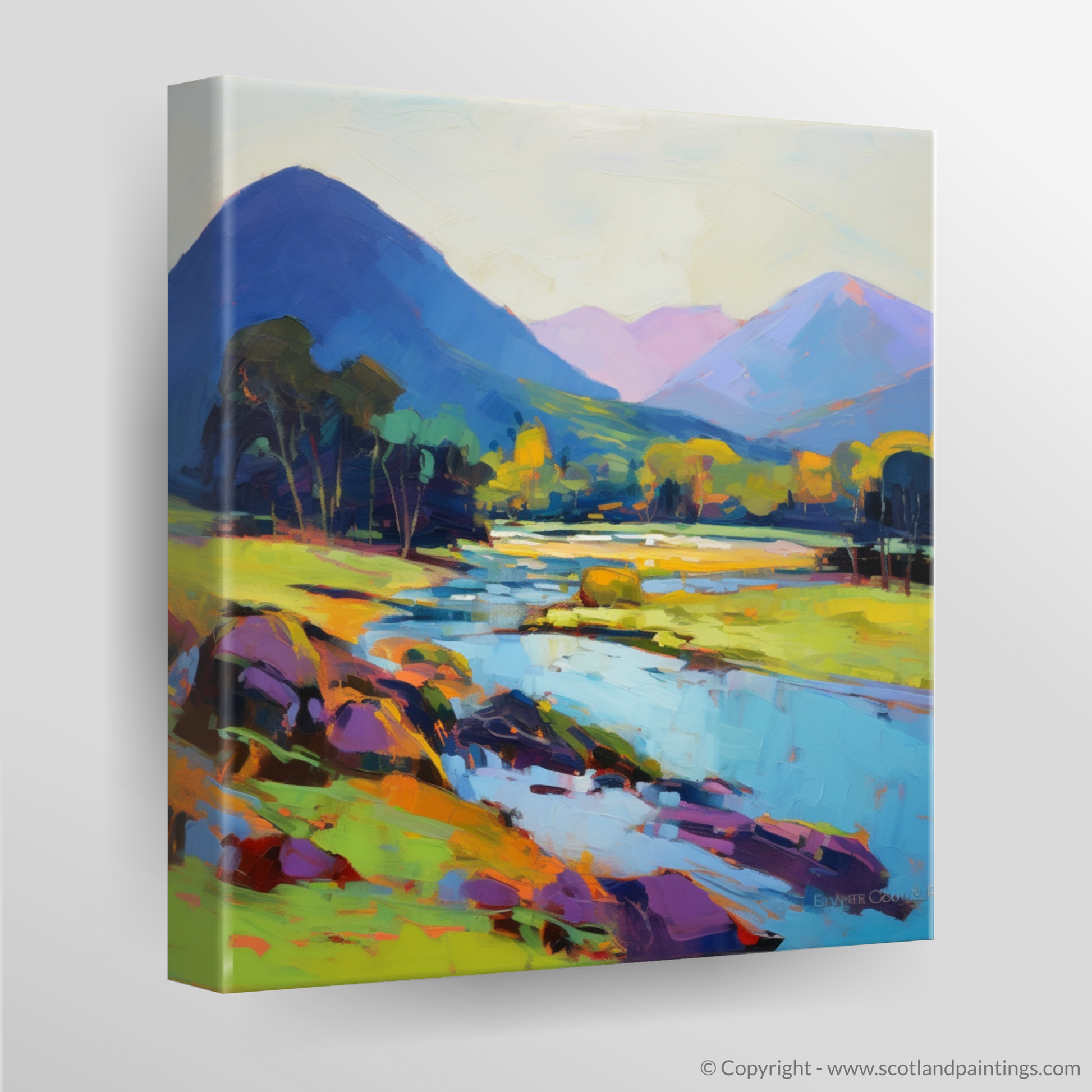 Immerse yourself in the evocative splendour of the Scottish highlands with this vibrant expressionist print that captures the bucolic charm of River Etive during the halcyon days of summer. This piece uses a bold and emotive colour palette where luminous yellows, intense blues, and lush greens converge to form a picturesque landscape teeming with vitality.