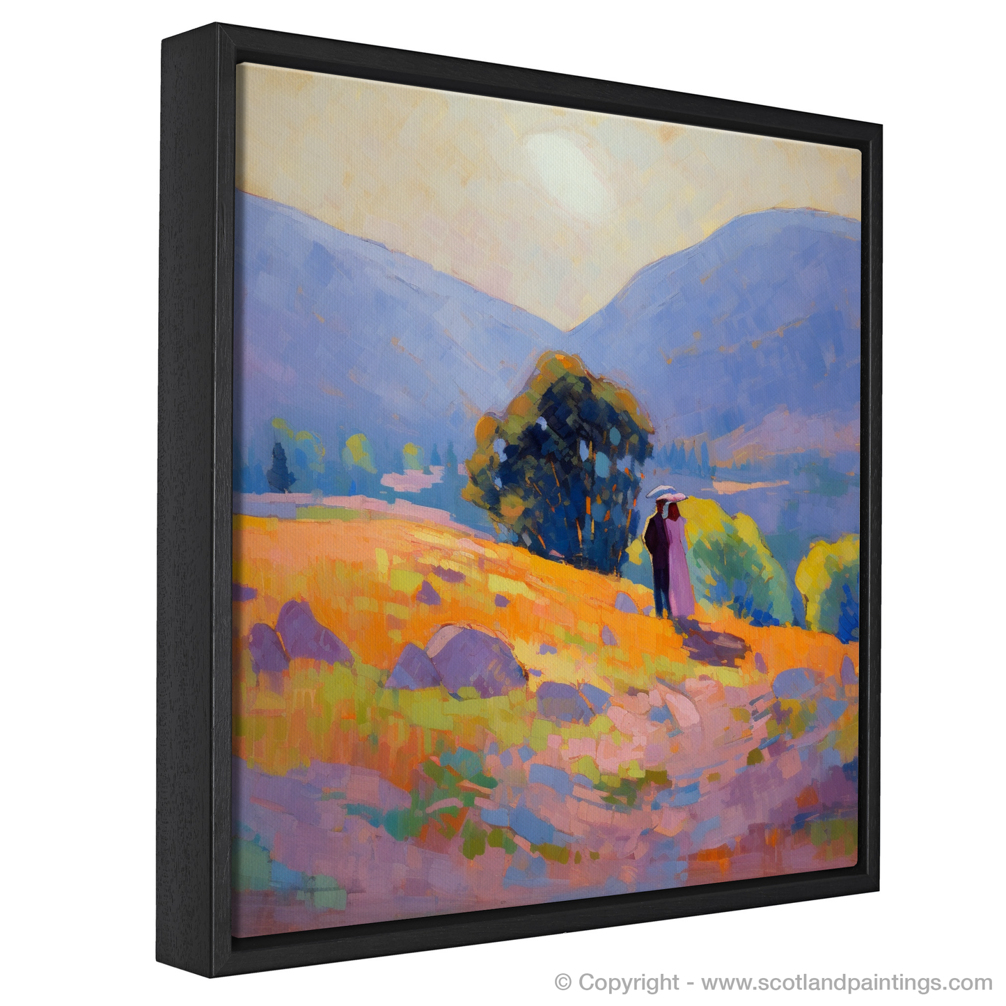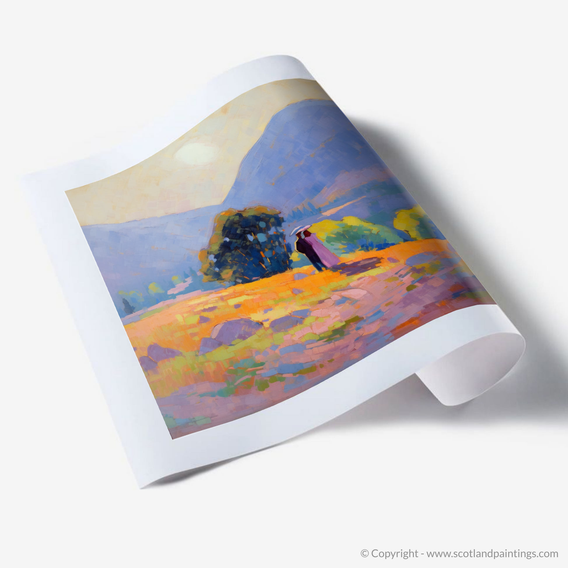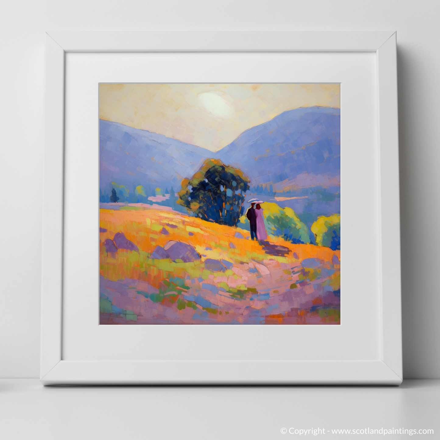 The tranquil atmosphere of this Highland retreat is delicately disturbed by the lightest brush of footsteps on the grassy slopes, where the couple finds solace under the shelter of a shared parasol. The dappled sunlight, masterfully depicted with vibrant, expressive brushstrokes, plays across the terrain, creating a sense of depth and movement. Flecks of light and shadow intermingle, giving the print a lively texture that seems almost tangible.