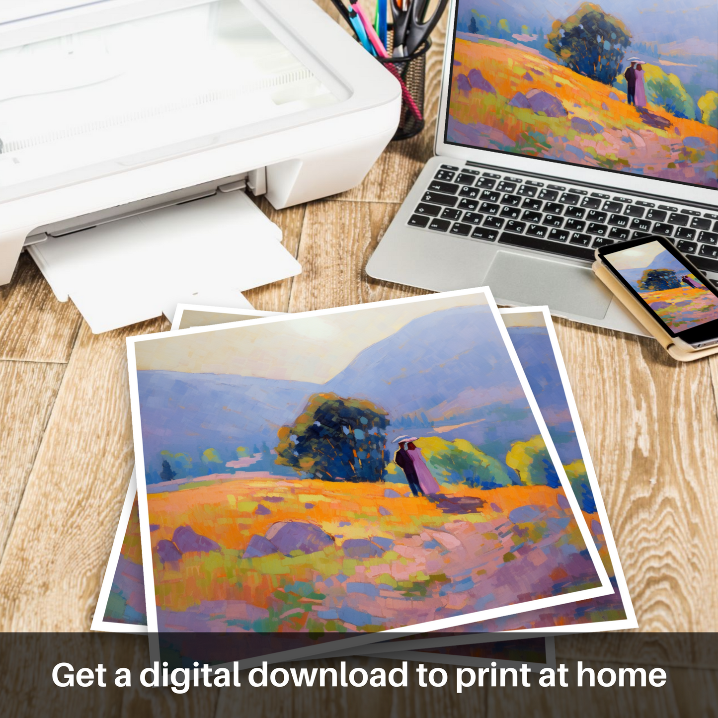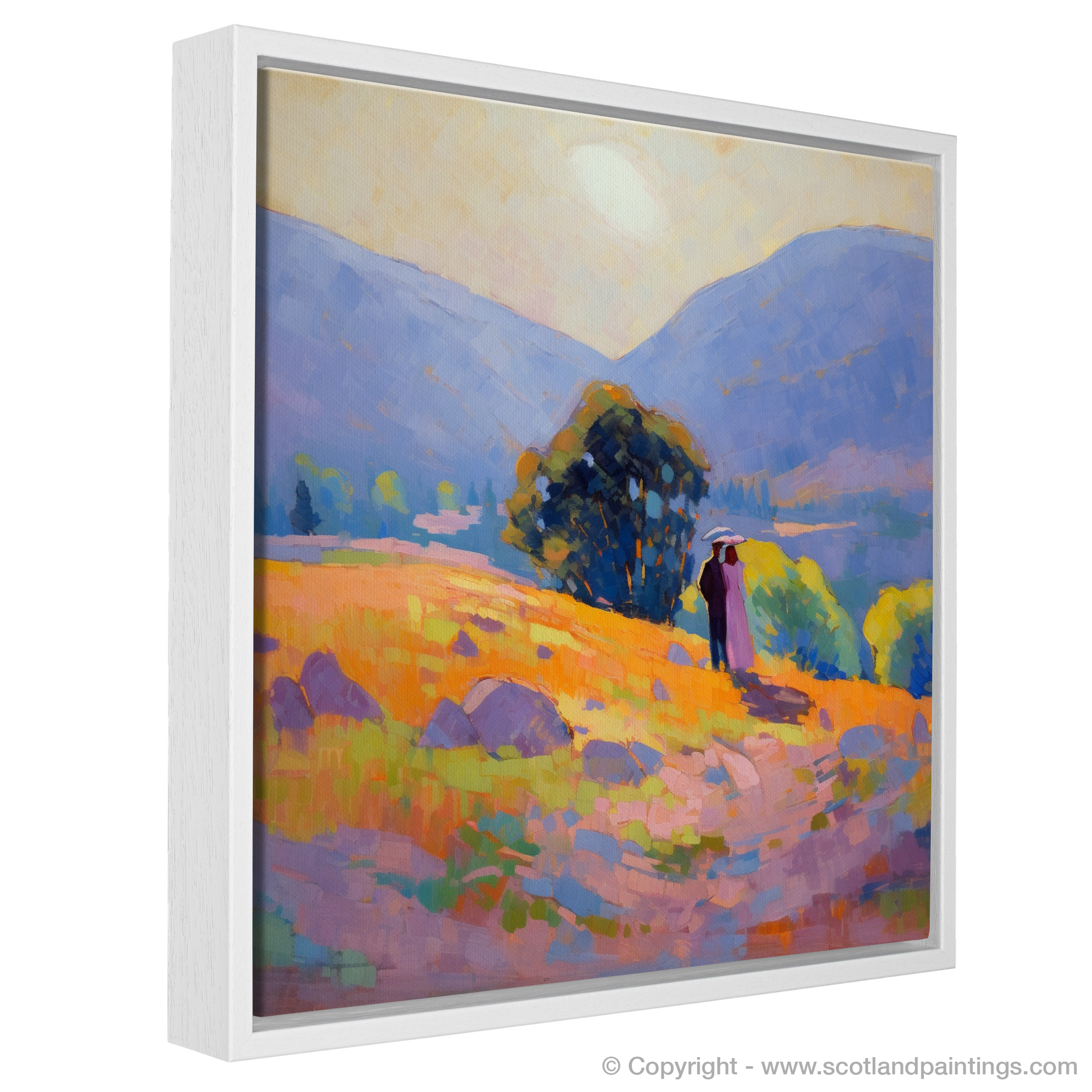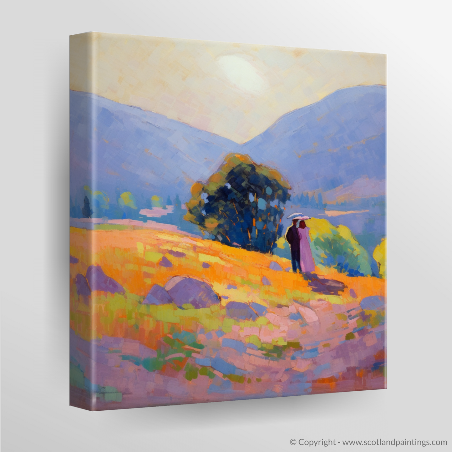 The tranquil atmosphere of this Highland retreat is delicately disturbed by the lightest brush of footsteps on the grassy slopes, where the couple finds solace under the shelter of a shared parasol. The dappled sunlight, masterfully depicted with vibrant, expressive brushstrokes, plays across the terrain, creating a sense of depth and movement. Flecks of light and shadow intermingle, giving the print a lively texture that seems almost tangible.