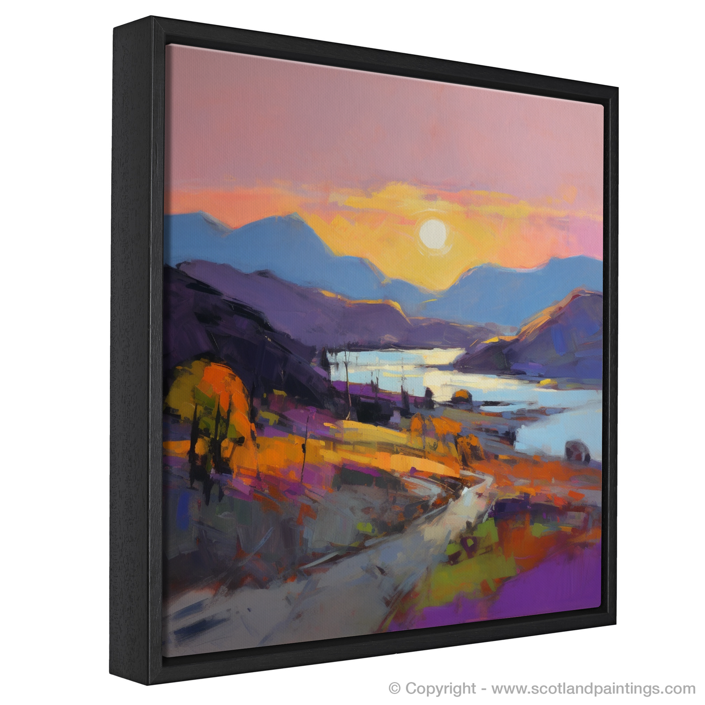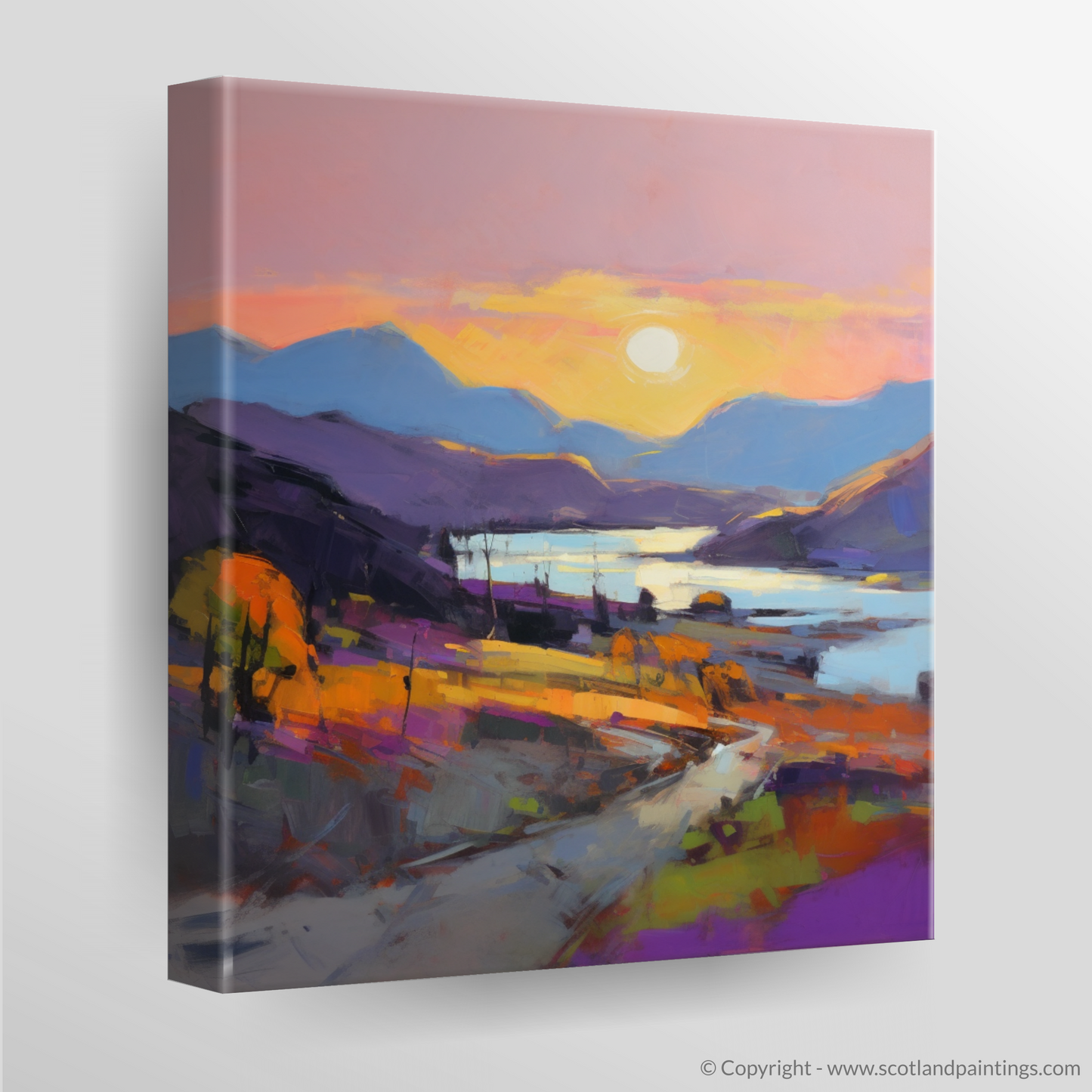 The beauty of the Highlands is abstracted into arrays of bold, purple mountain silhouettes that frame the bay, evoking both the tranquility and the dramatic spirit of Scottish coves. The reflection of the sun’s dying embers weave gold and pink into the rippling water, creating a liquid tapestry that anchors this bewitching scene. Scattered foliage in shades of luminous orange and warm yellows breaks through the rich palette, suggesting the wild and untamed nature softly subdued by the evening’s calm.