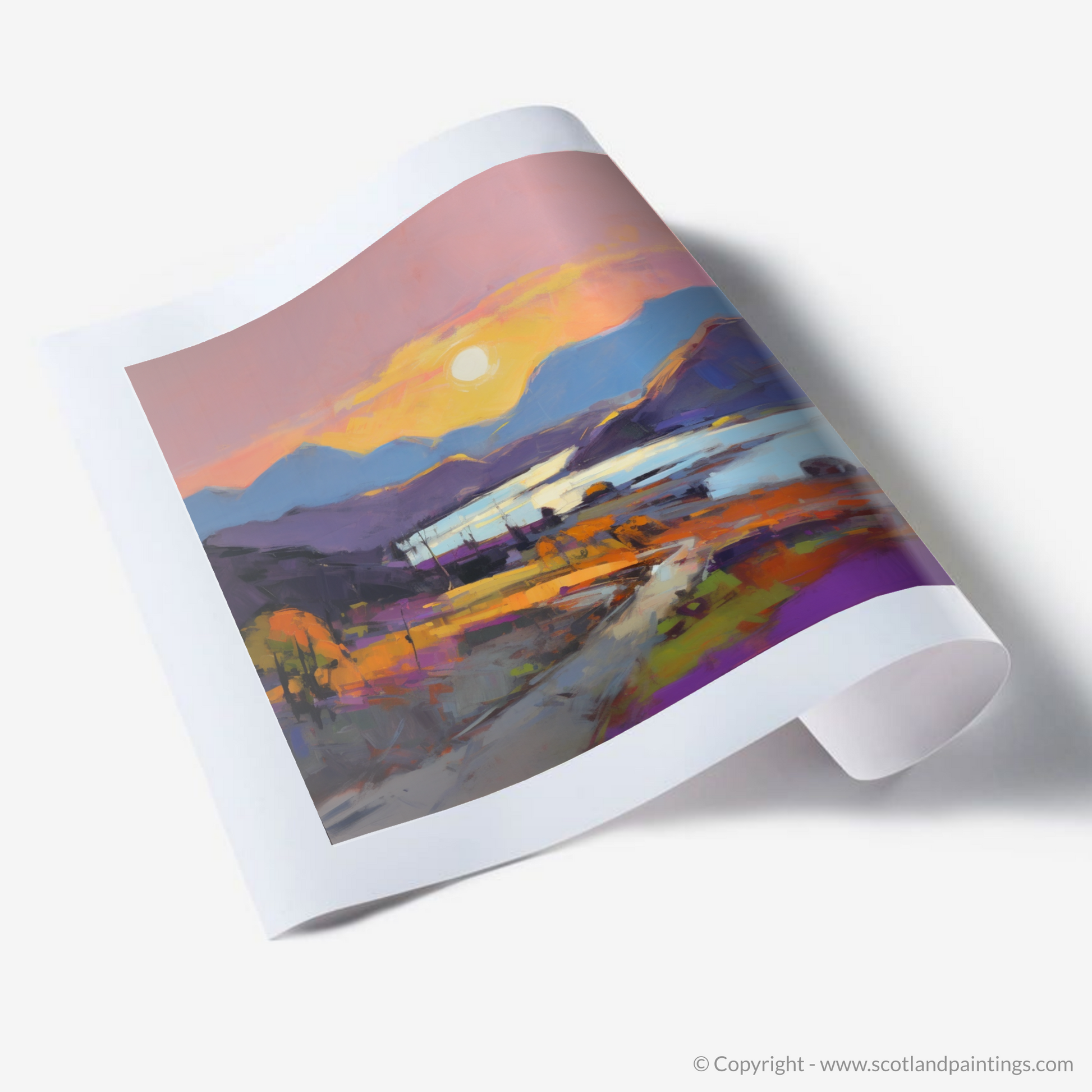 As the day's fiery cloak begins to drape over Scourie Bay, this captivating expressionist print beckons the observer into a world alight with vibrant colours and passionate brushstrokes. Capturing the essence of golden hour, this piece is a dance of light and shadow, where the sun sinks towards the horizon, casting an incandescent glow over the serene waters and undulating hills.