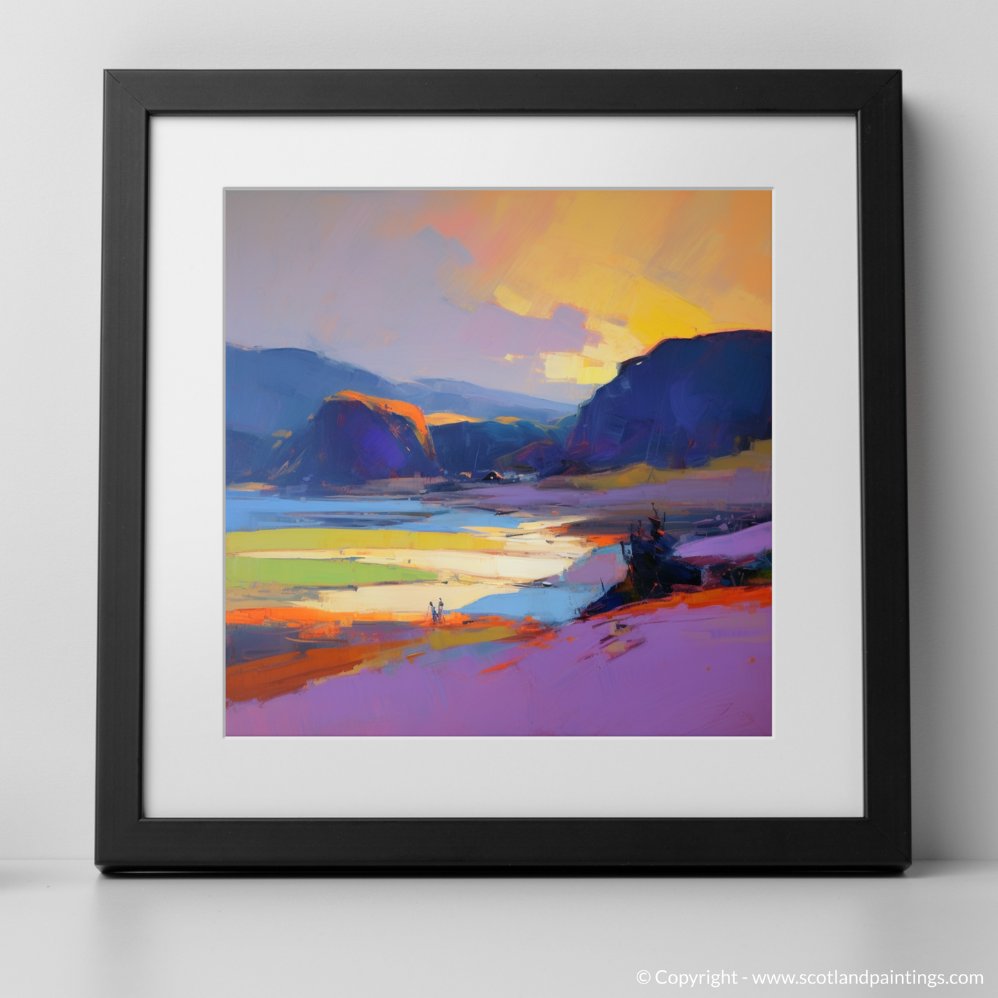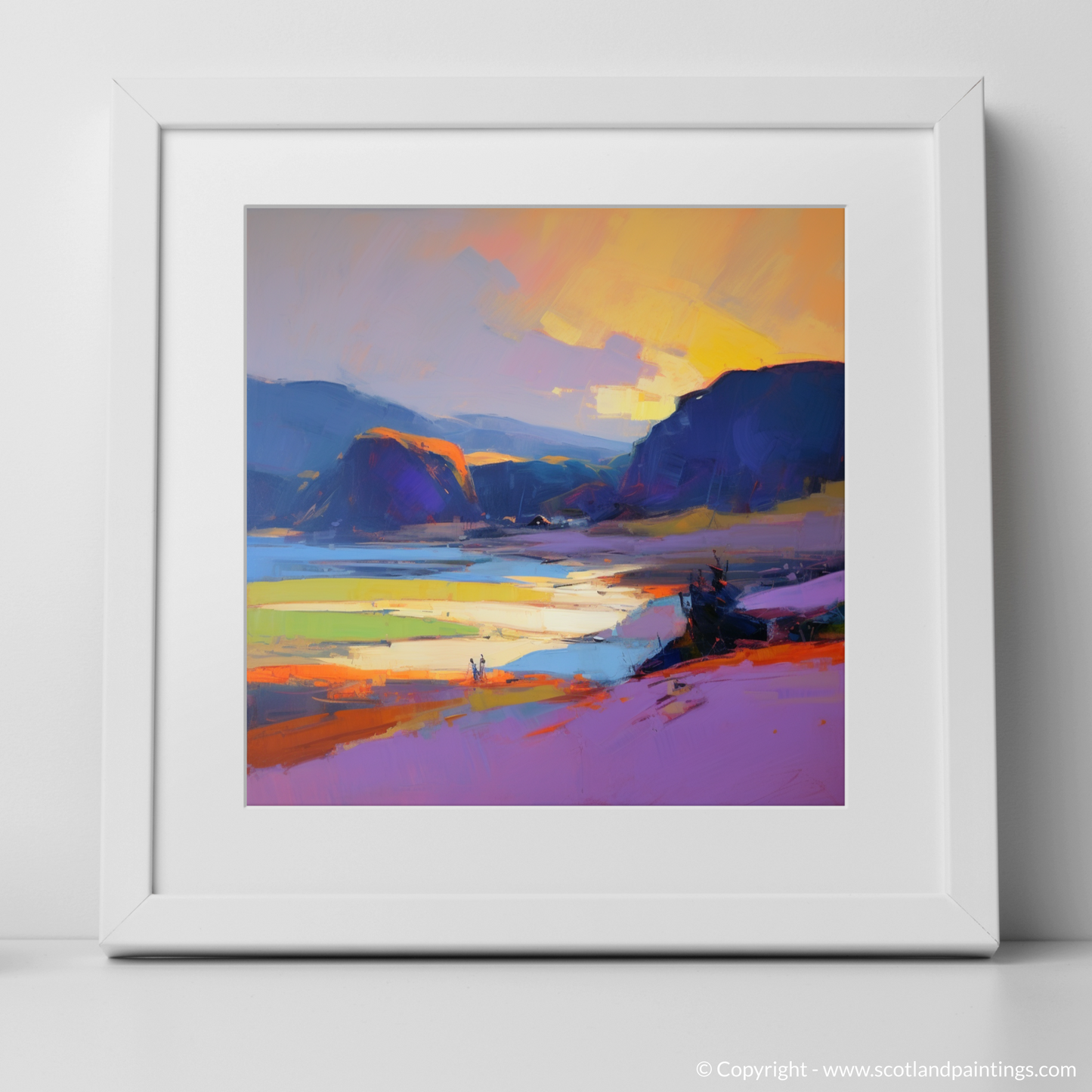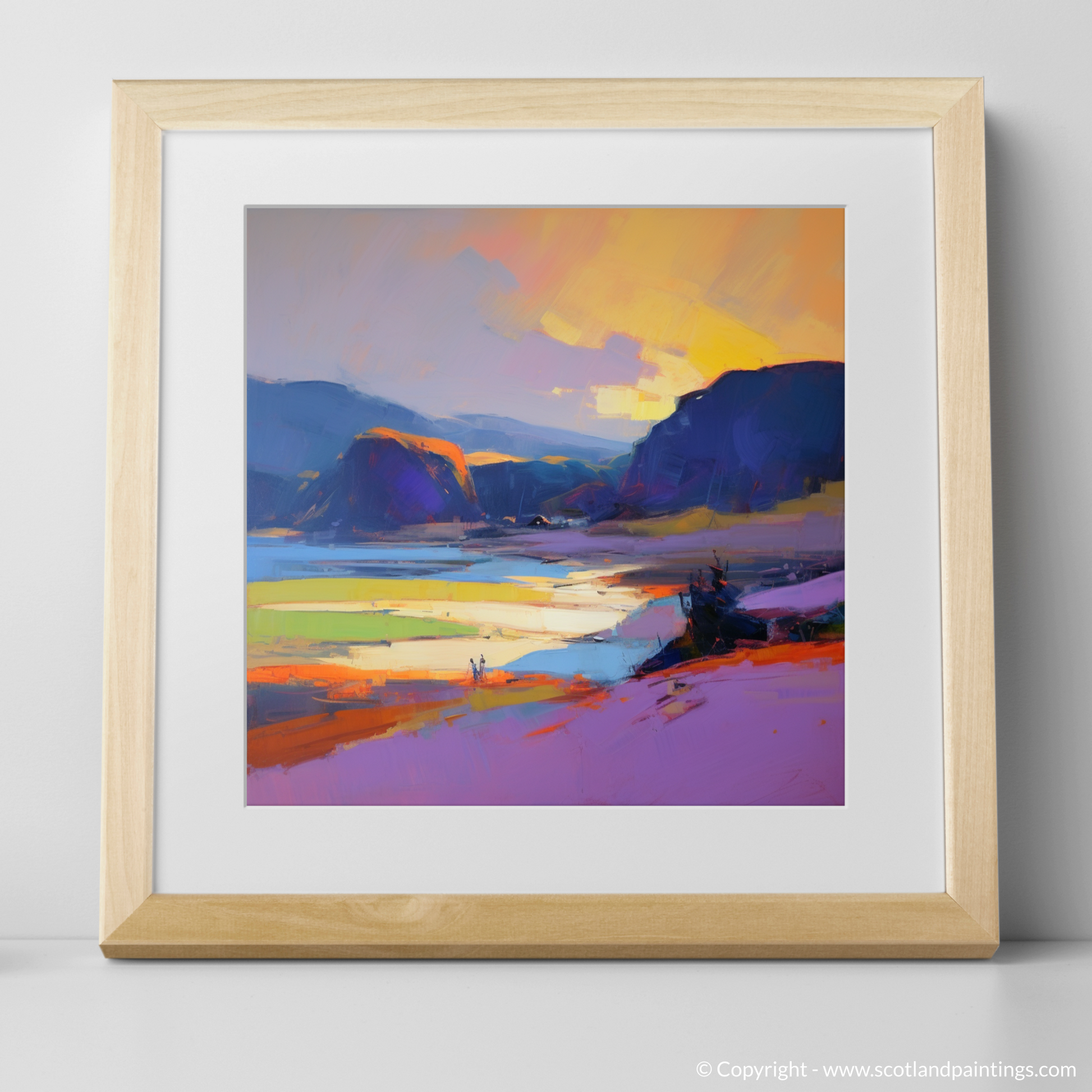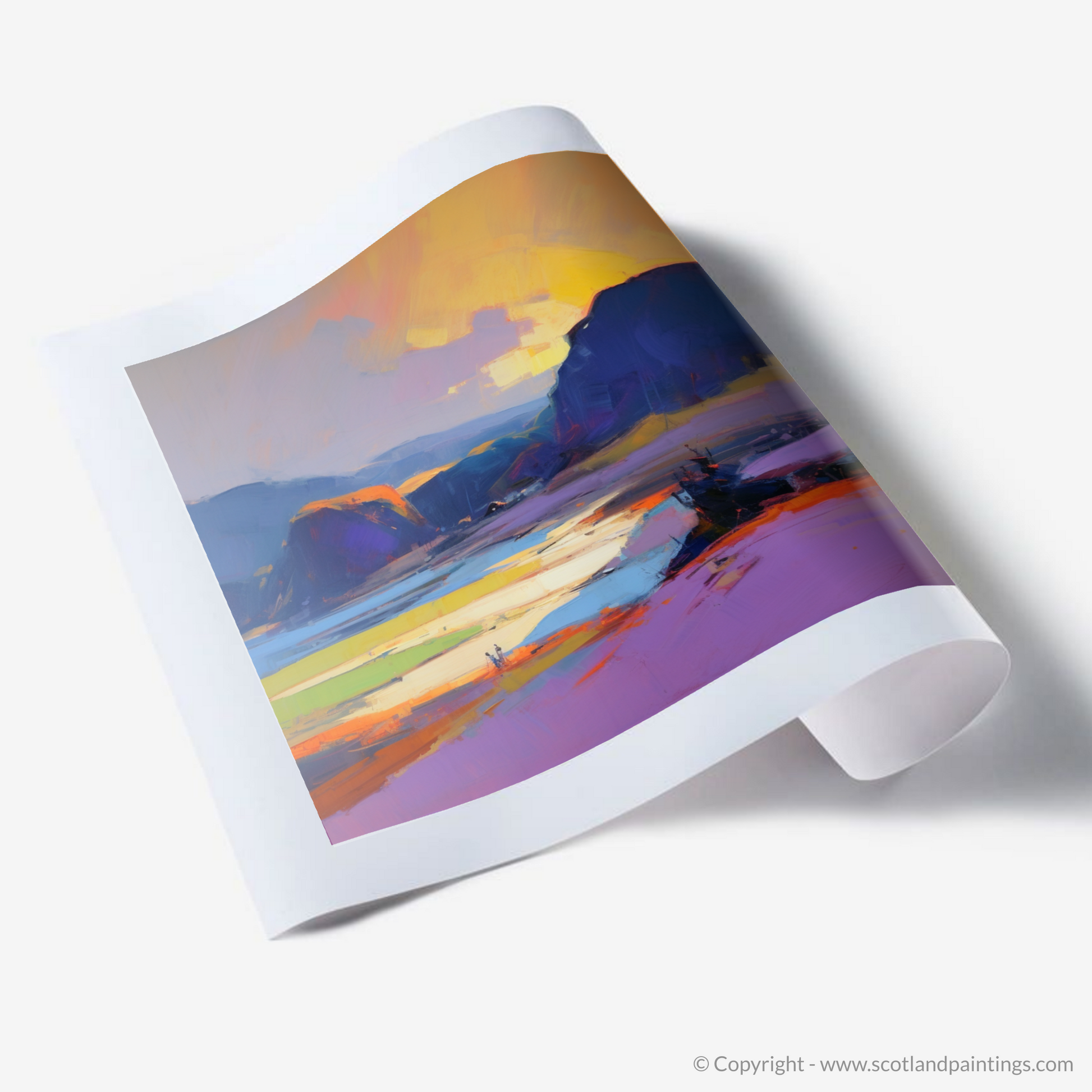 Immerse yourself in the Scottish landscape with this evocative interpretation of Durness Beach, masterfully encapsulated in the golden warmth of the fleeting hour. Vivid hues of amber, violet, and cerulean dance across the canvas, bringing to life the serene beach as it basks under the spellbinding glow of a setting sun.