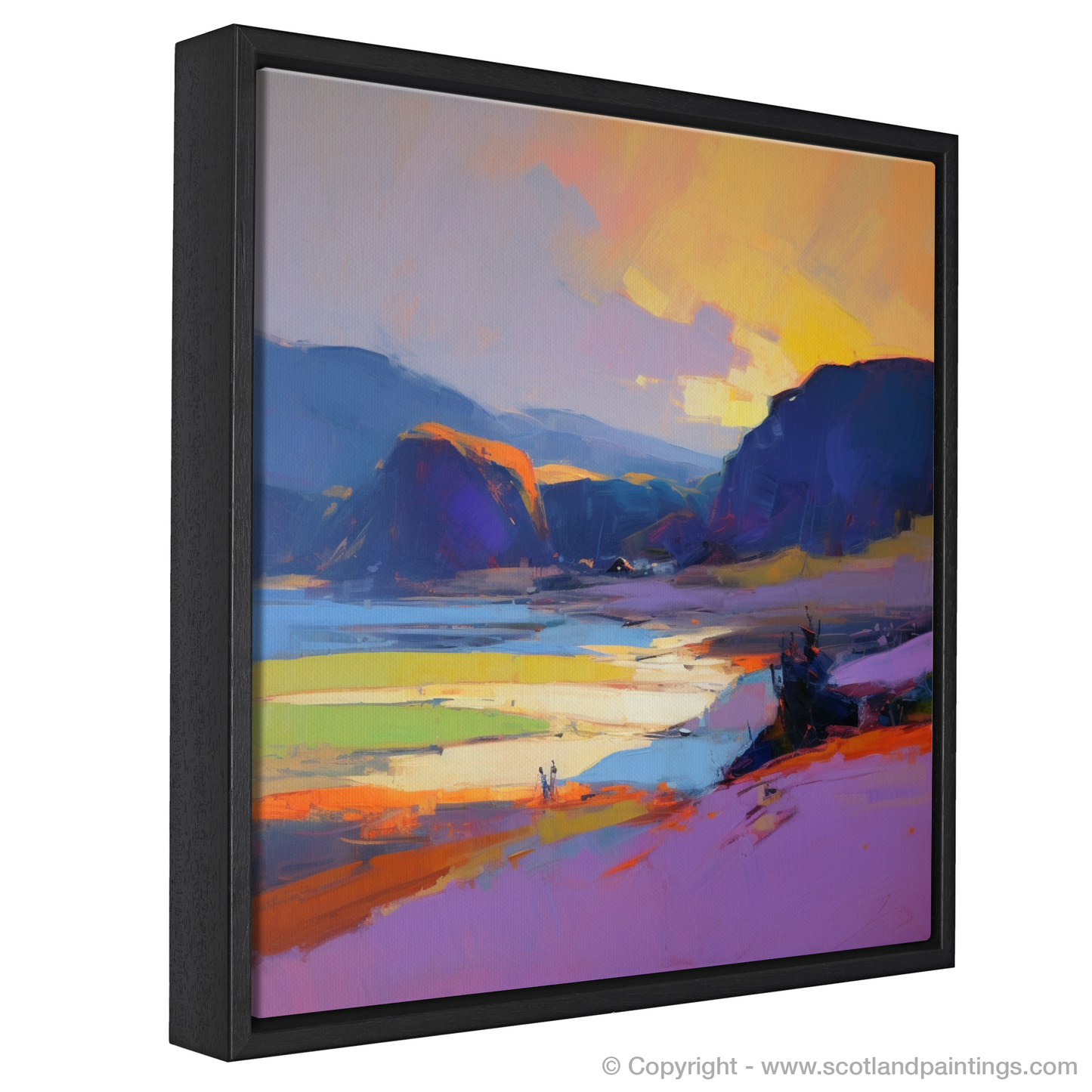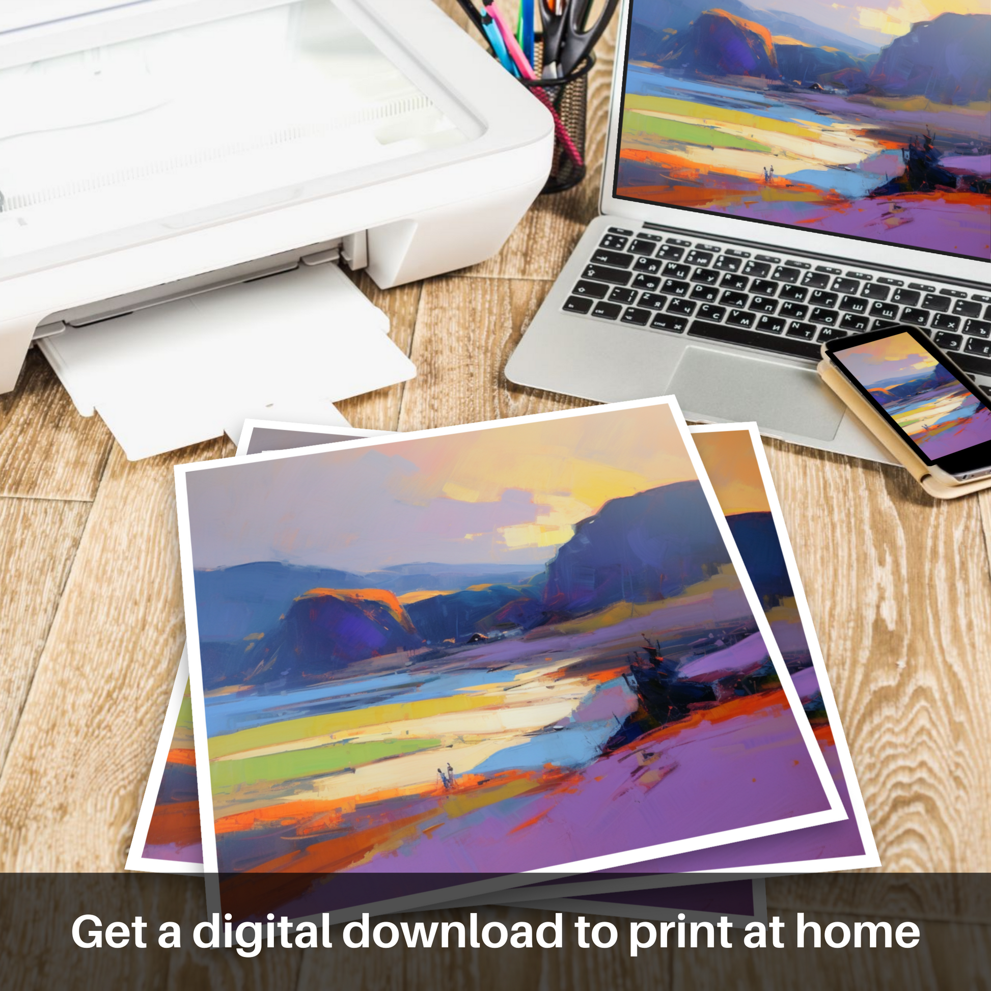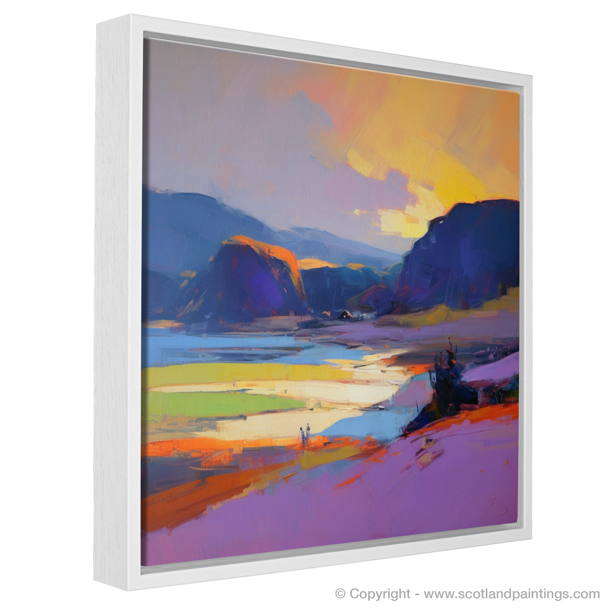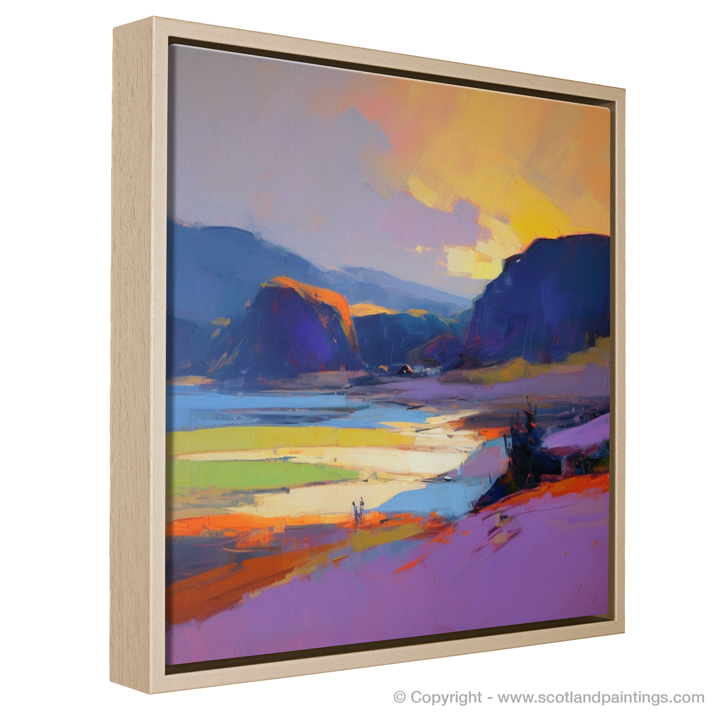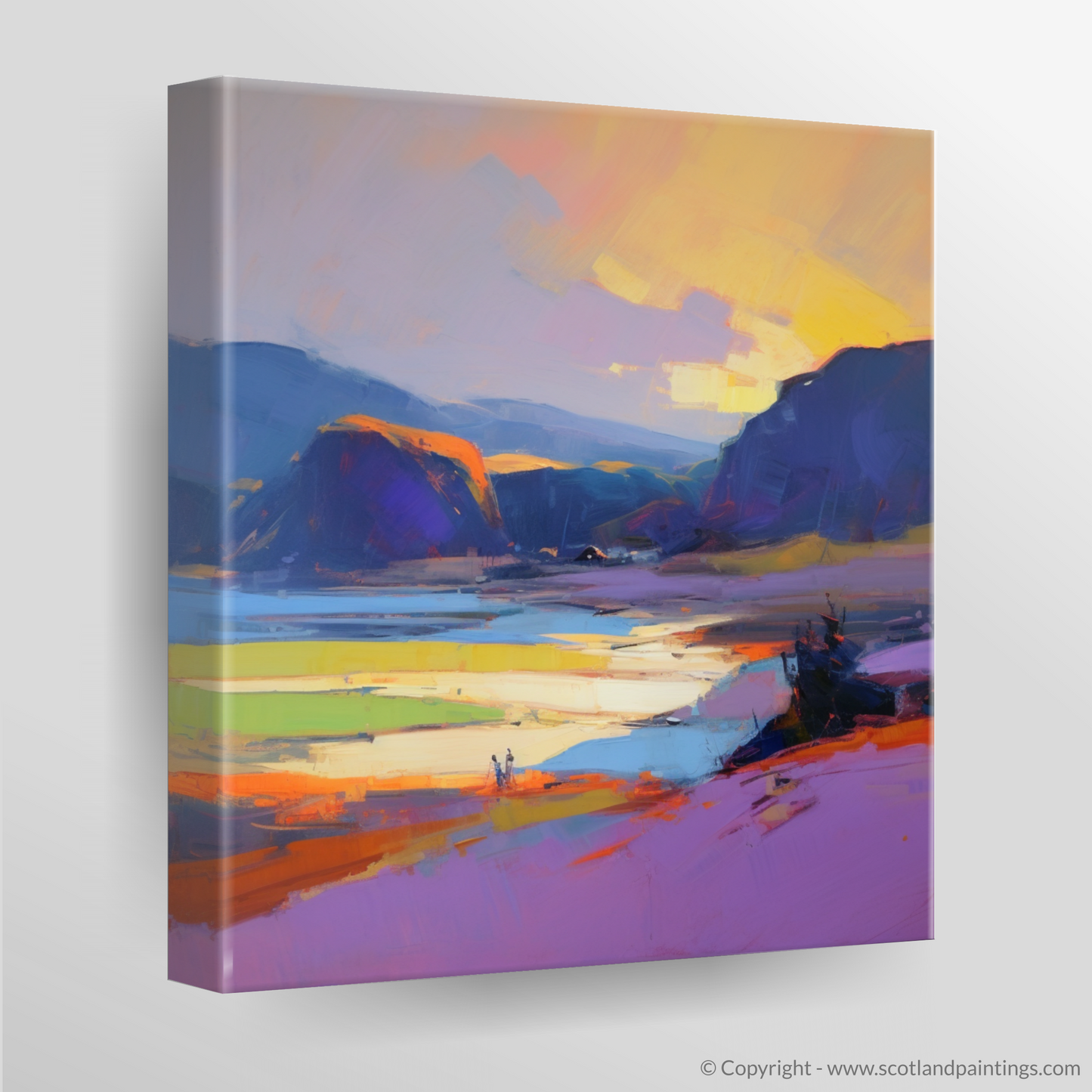 Immerse yourself in the Scottish landscape with this evocative interpretation of Durness Beach, masterfully encapsulated in the golden warmth of the fleeting hour. Vivid hues of amber, violet, and cerulean dance across the canvas, bringing to life the serene beach as it basks under the spellbinding glow of a setting sun.